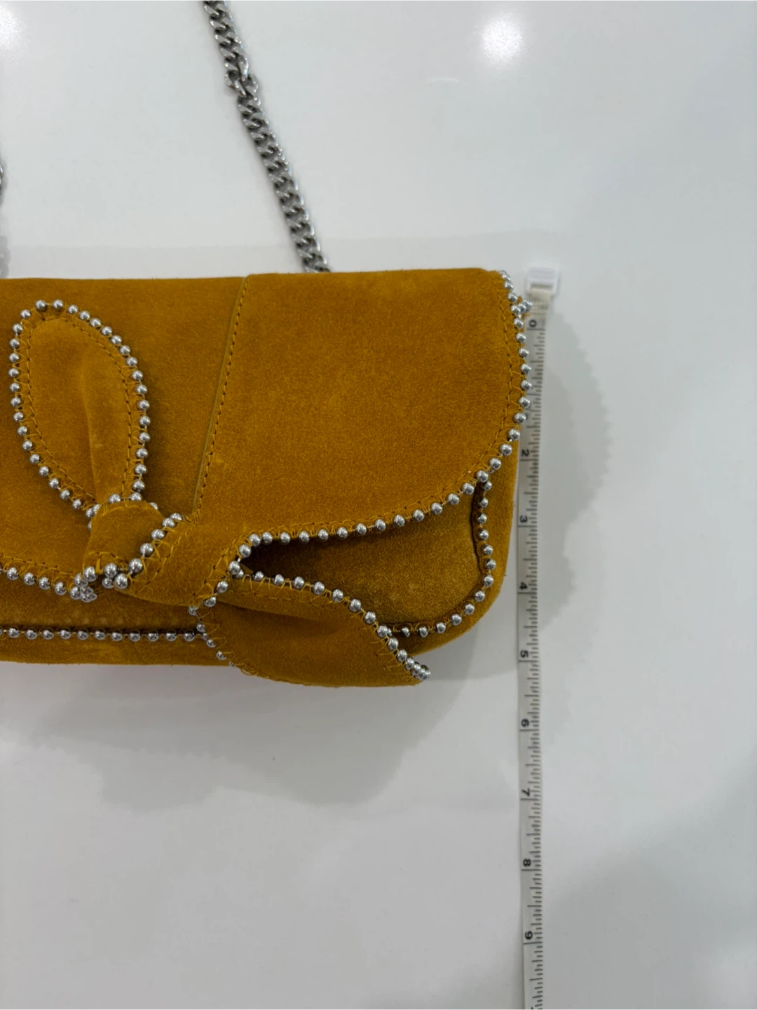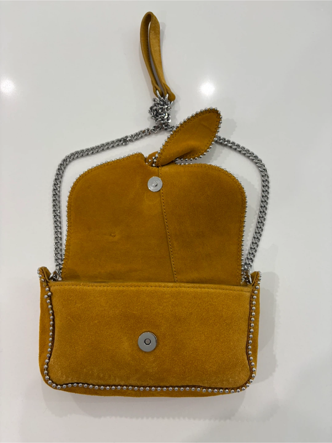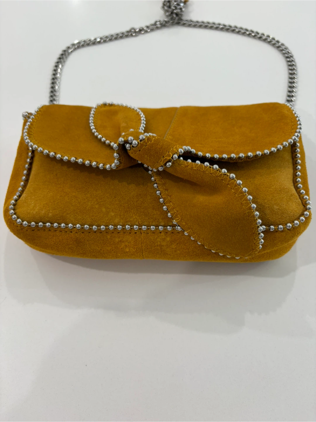 This stunning Zara collector’s piece is crafted from 100% leather suede in a rich marigold colour . Beautifully made, it features eye-catching silver beaded detailing and a solid silver chain strap with suede handle detail for comfort.