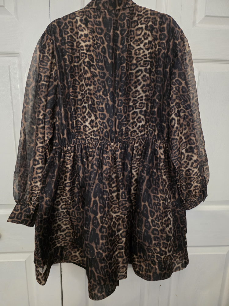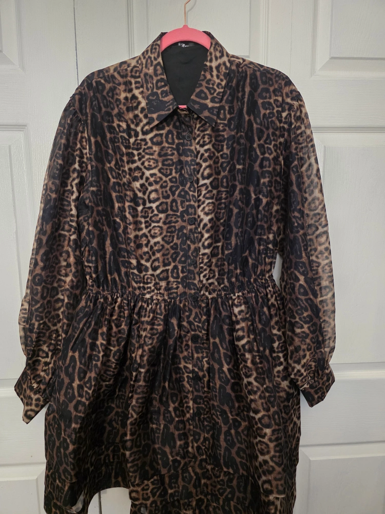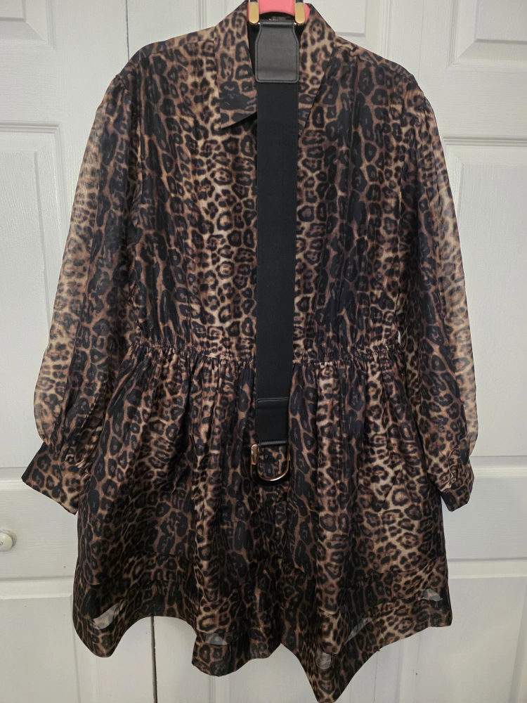 Selling a For Her NYC dress with a stylish leopard print. It's a unique piece that will add some flair to your wardrobe! The dress features a cinched waist and long sleeves. Taffeta material and the Belt is included.