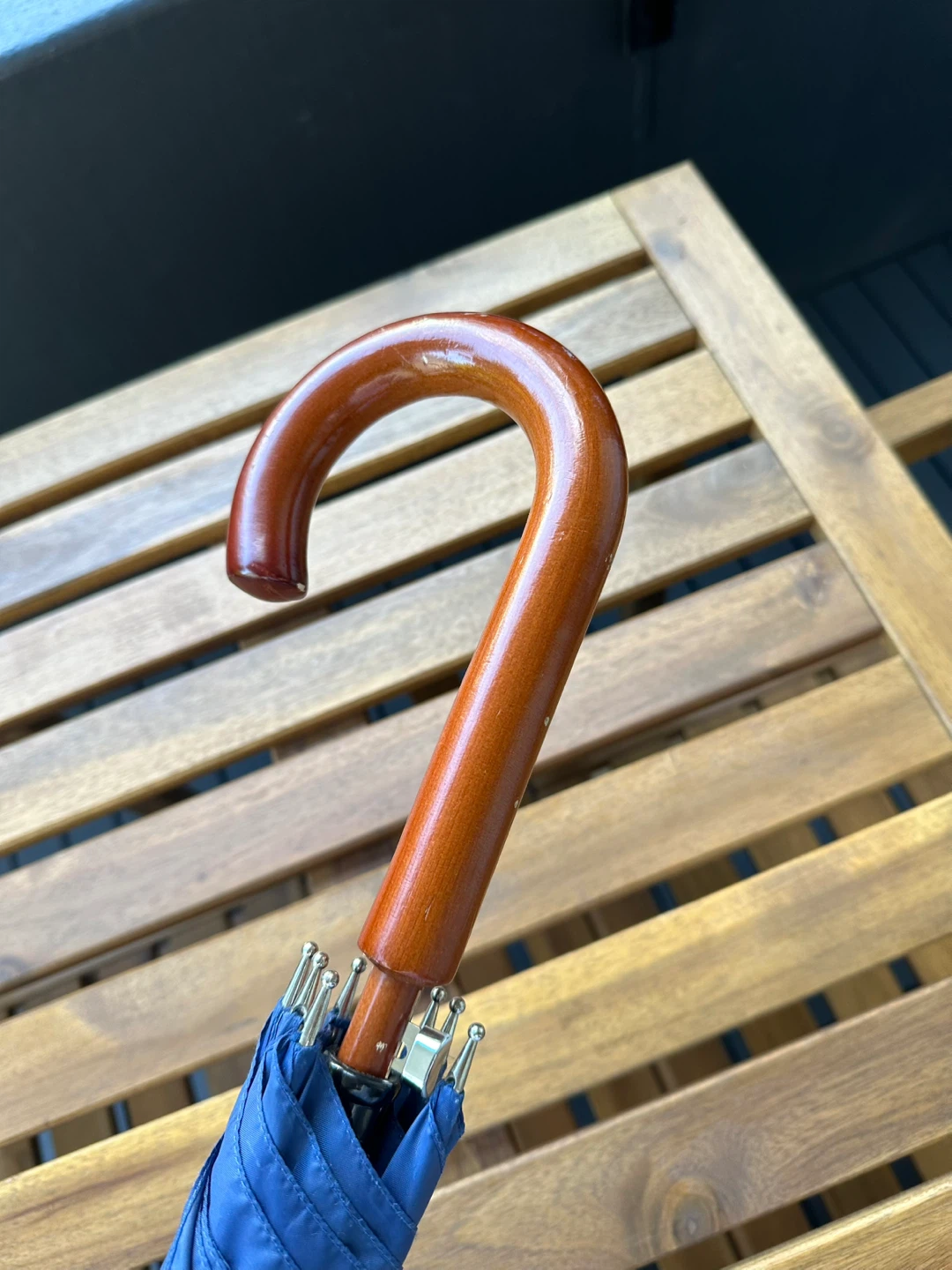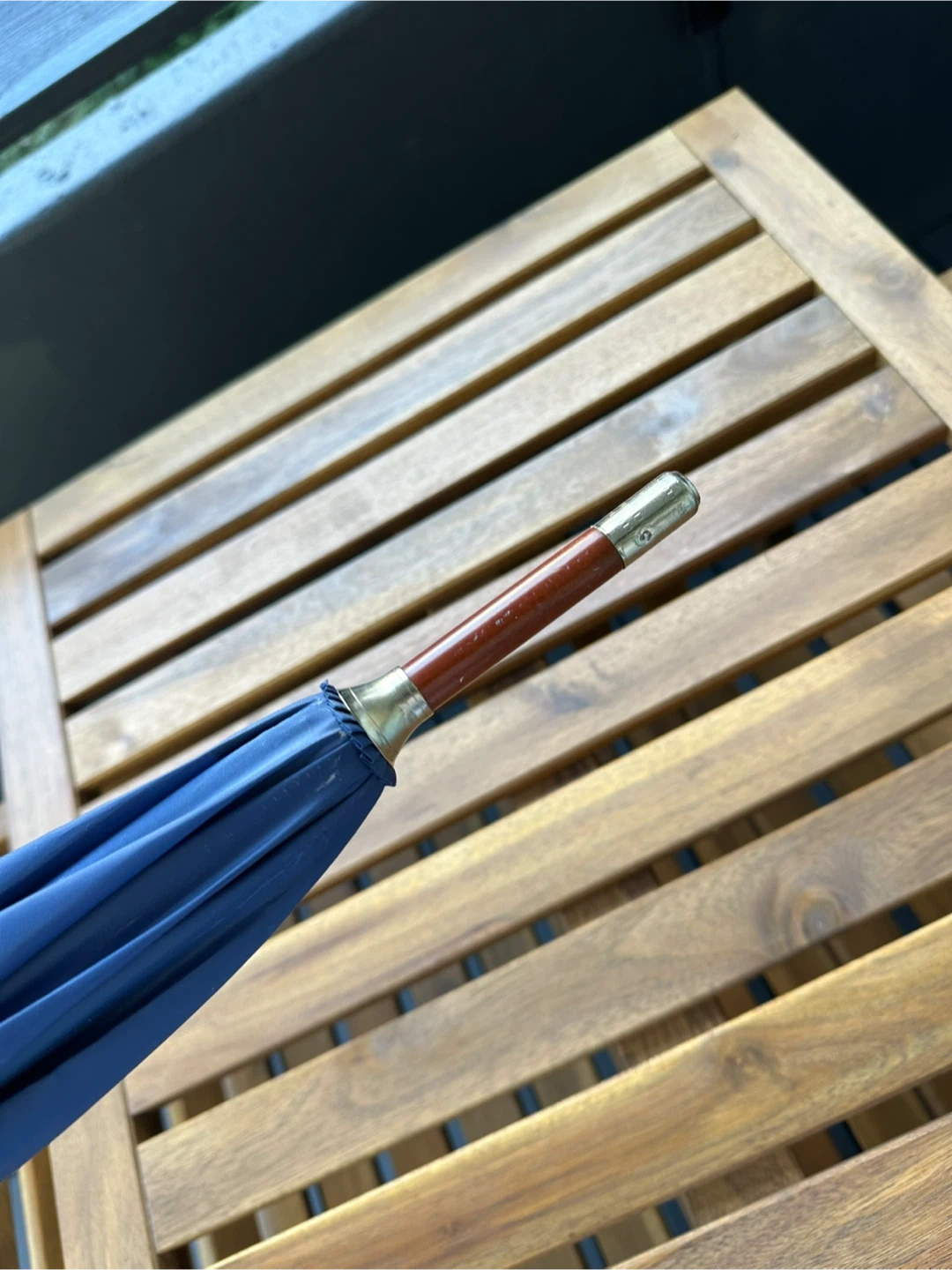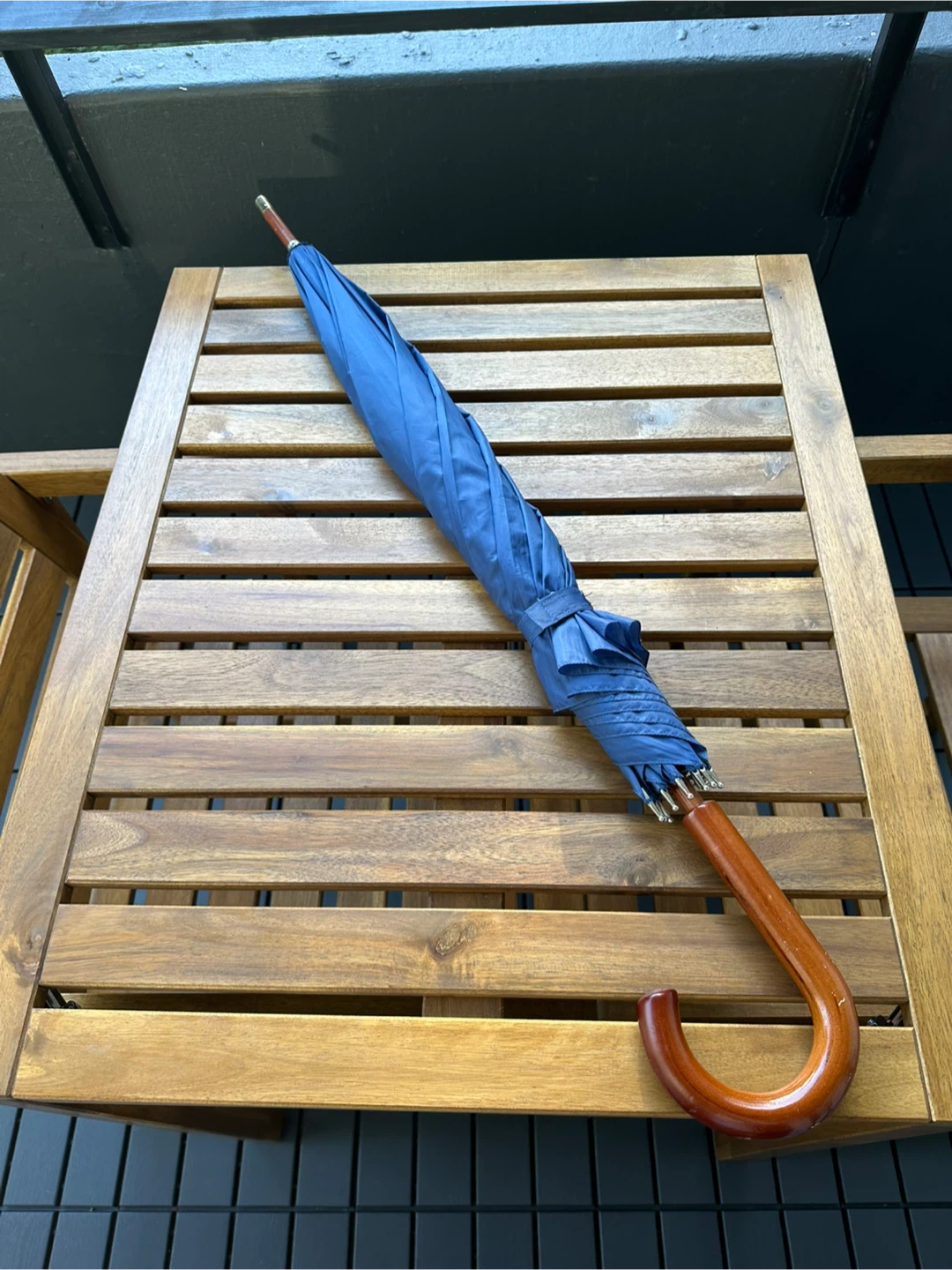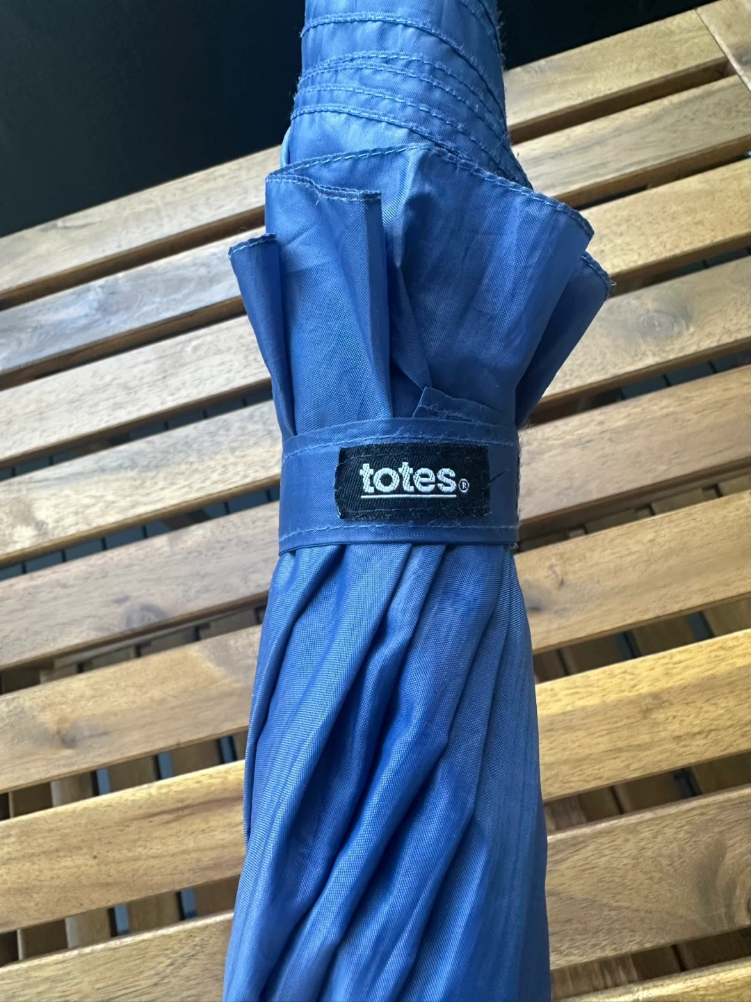 Here's a classic blue umbrella from Totes! It features a stylish wooden handle and is in great condition. Perfect for those rainy days! Note: Must fasten the strap well or the umbrella with open by itself.