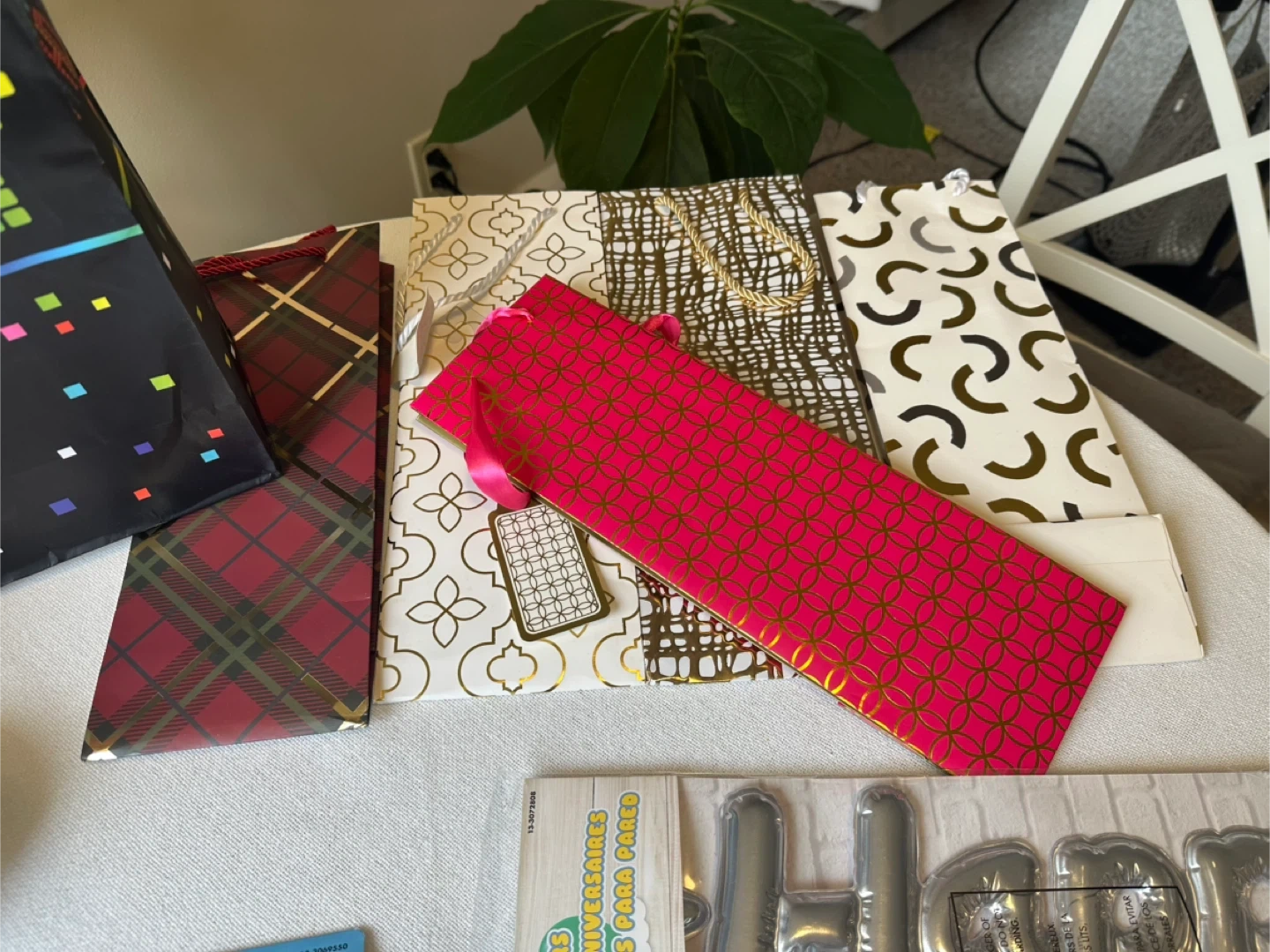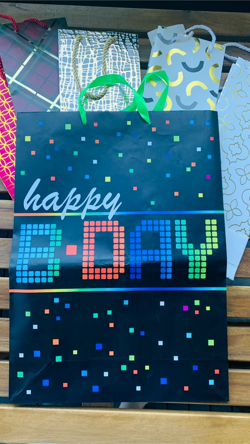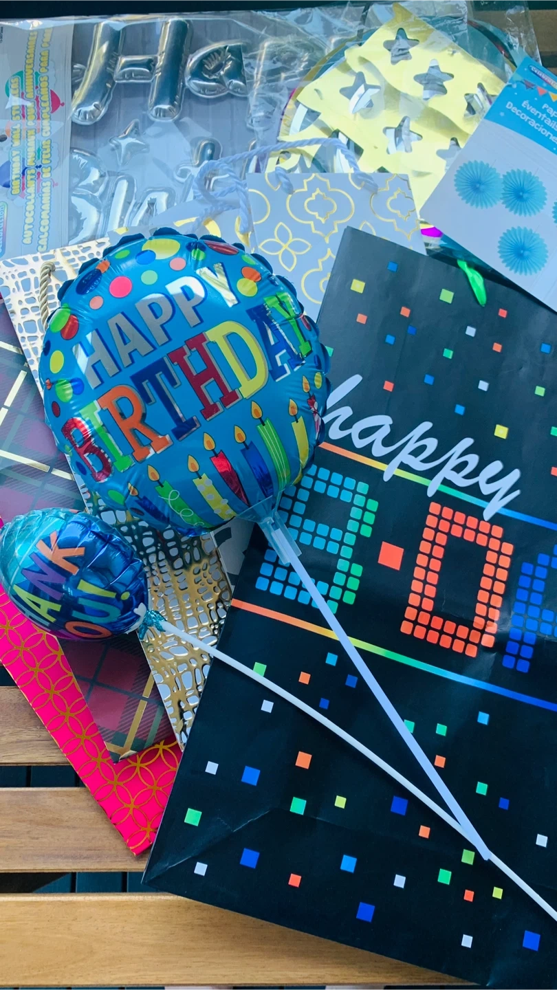 Assorted party decorations including gift bags, balloons, paper fan decorations, and a 'Happy Birthday' balloon banner! Perfect for your next celebration