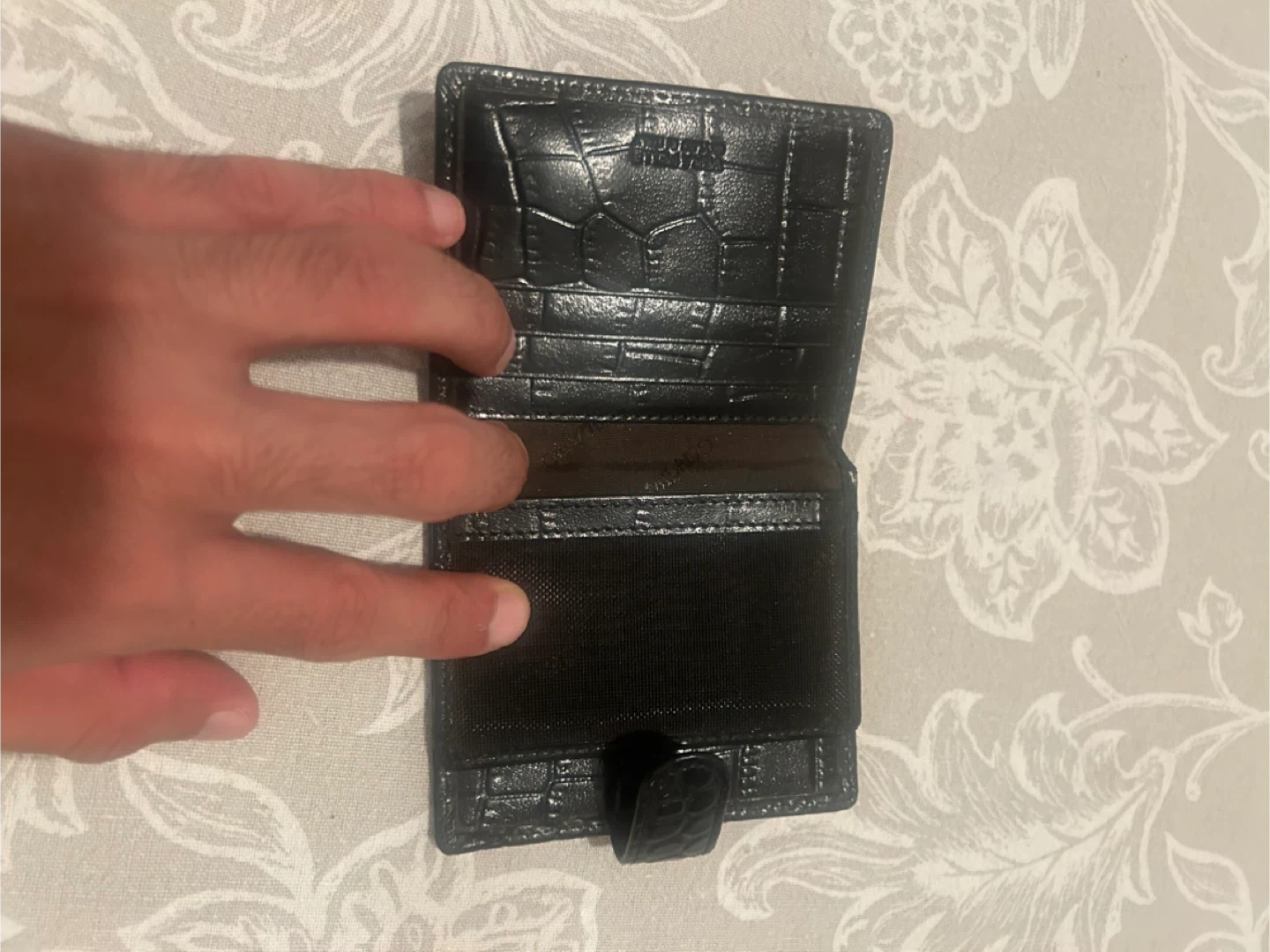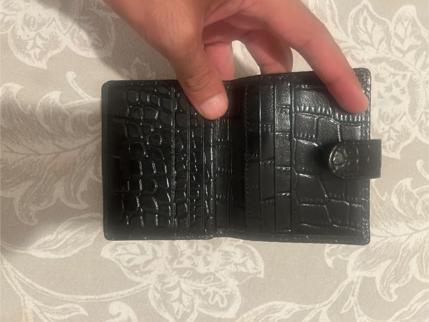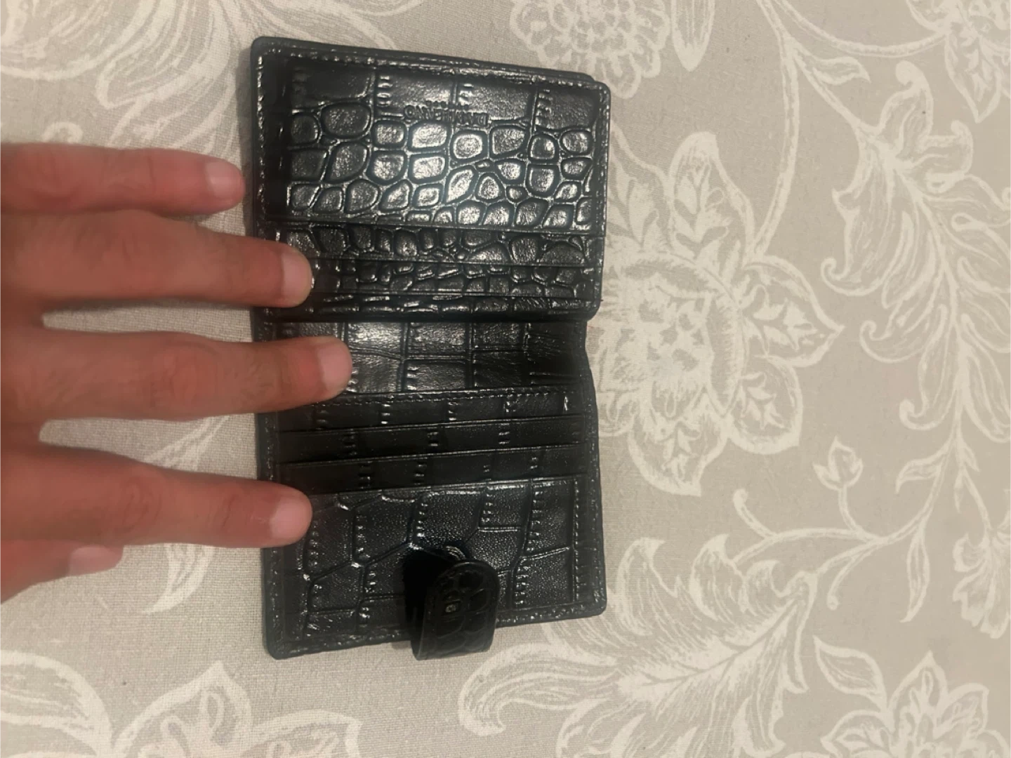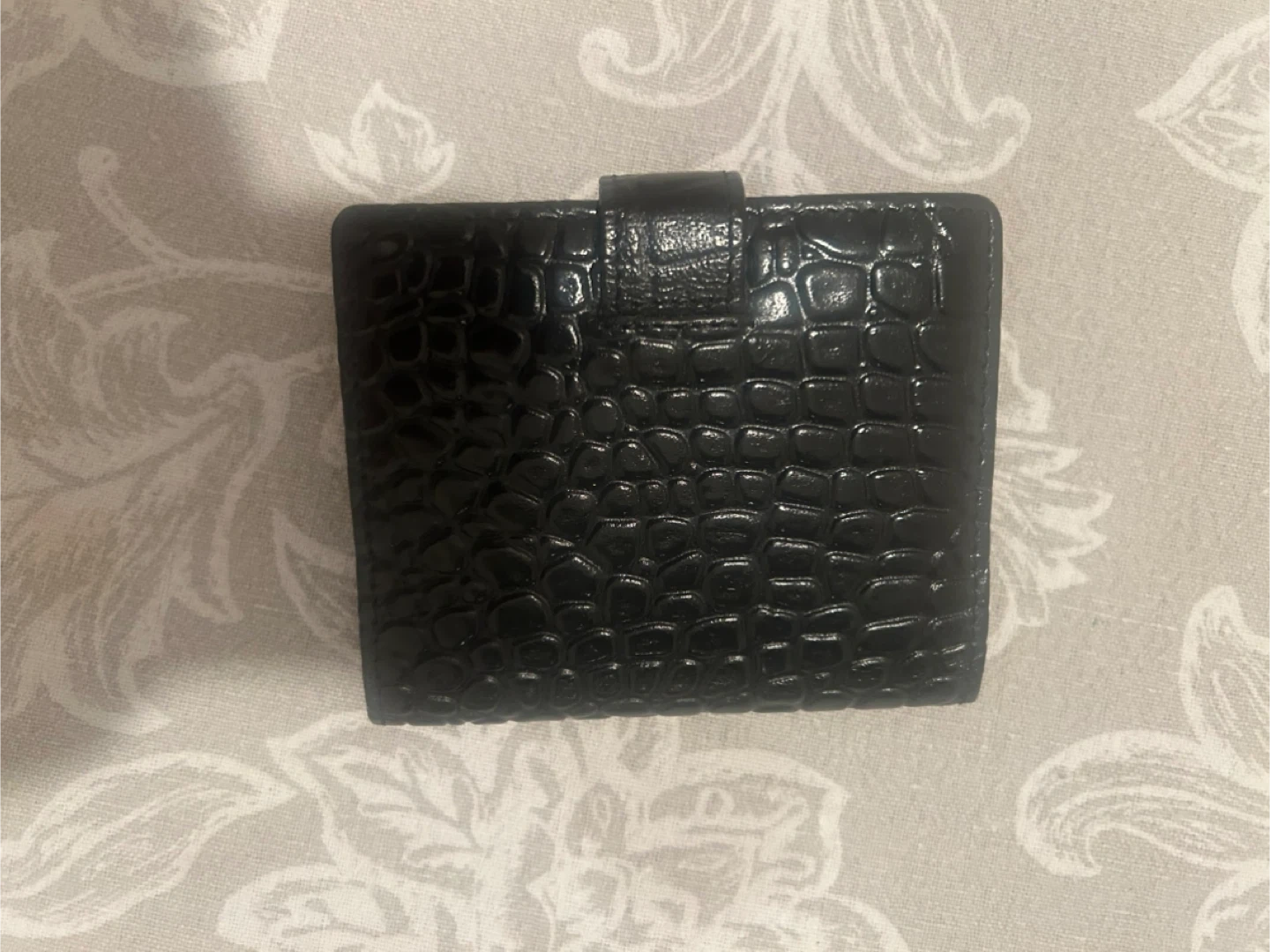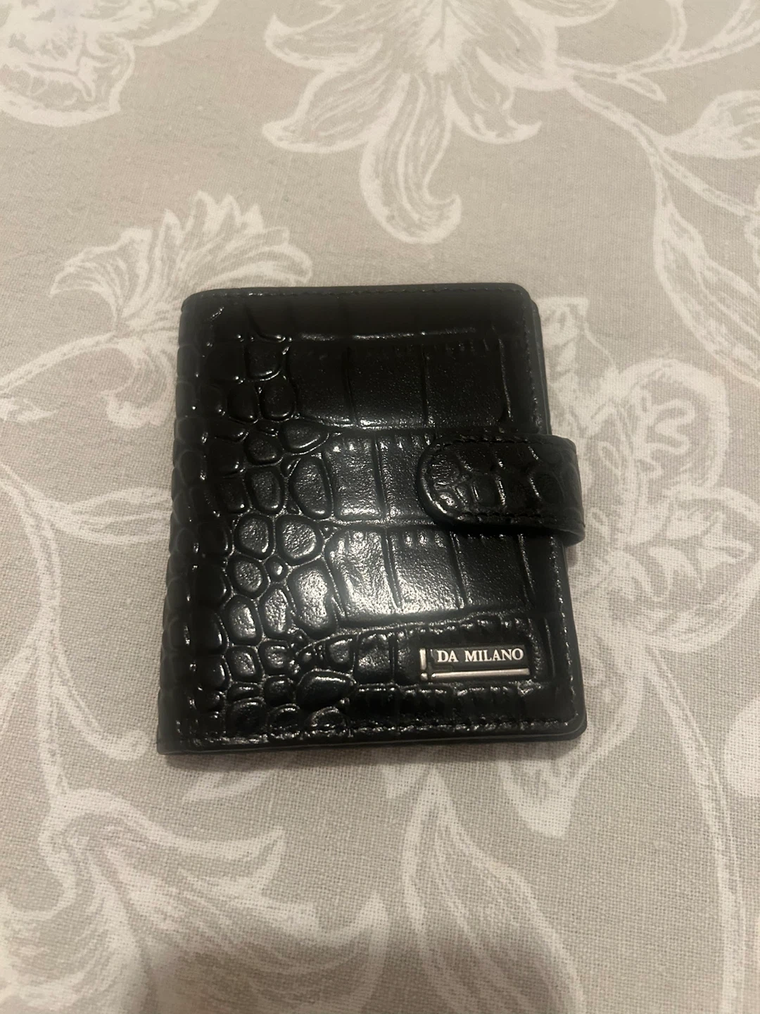 Selling a DA MILANO black leather wallet. It has a crocodile-like pattern and a snap closure. It's in great condition!