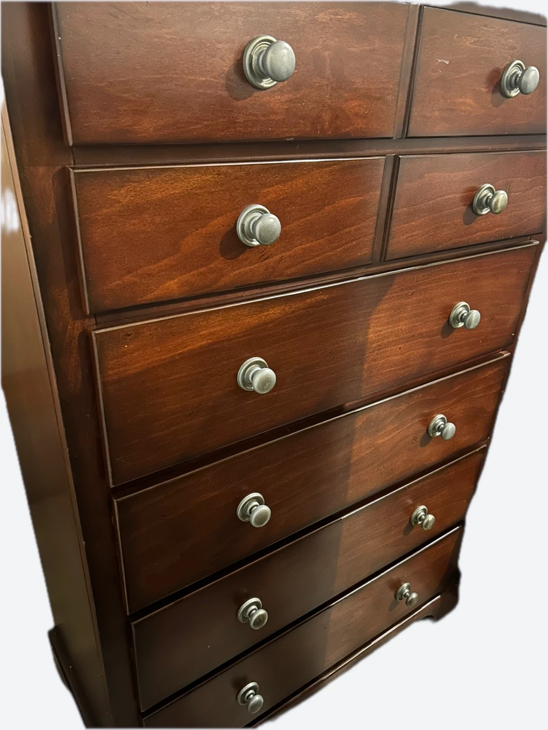 Here's a lovely dark and sturdy wood dresser with seven drawers! It's perfect for adding some extra storage to your bedroom or closet. The dresser is in decent condition and ready for a new home.