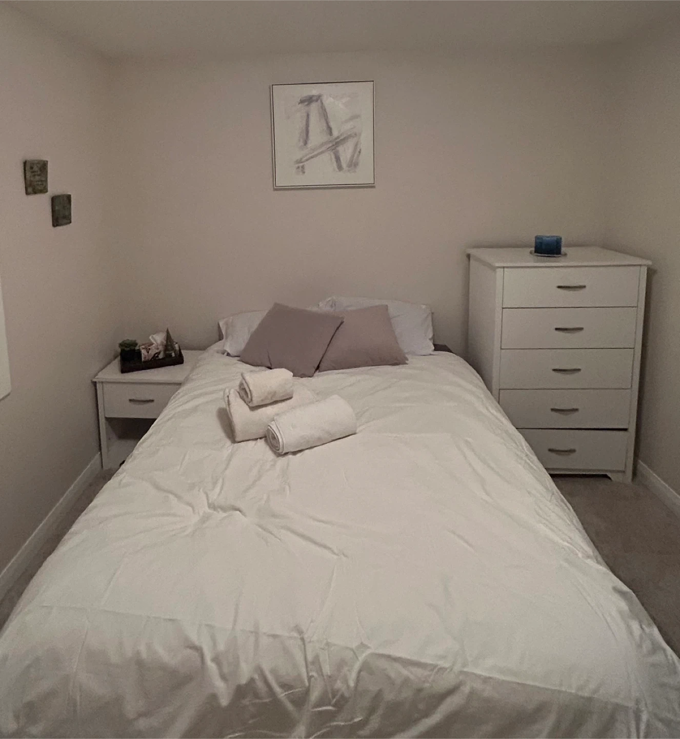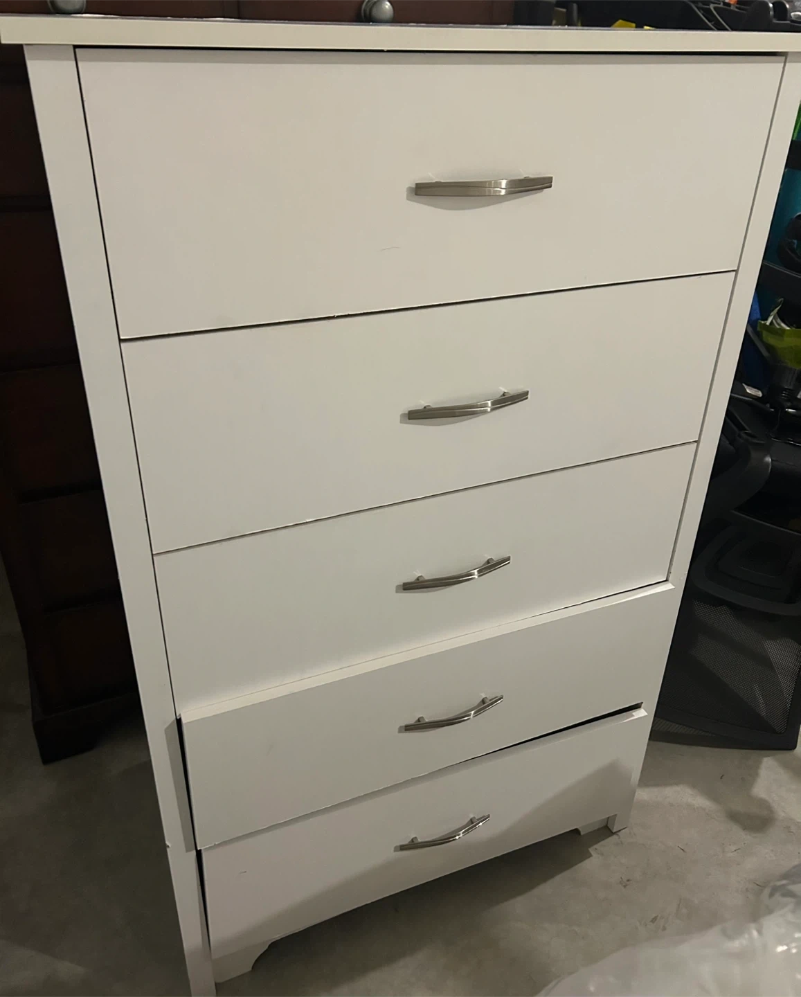 Selling a white 5-drawer dresser and a matching nightstand. They're in decent condition and would be good for a bedroom set. The dresser offers ample storage, and the nightstand is a great size for beside the bed.
