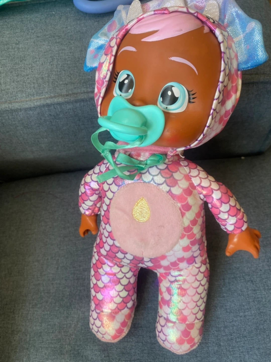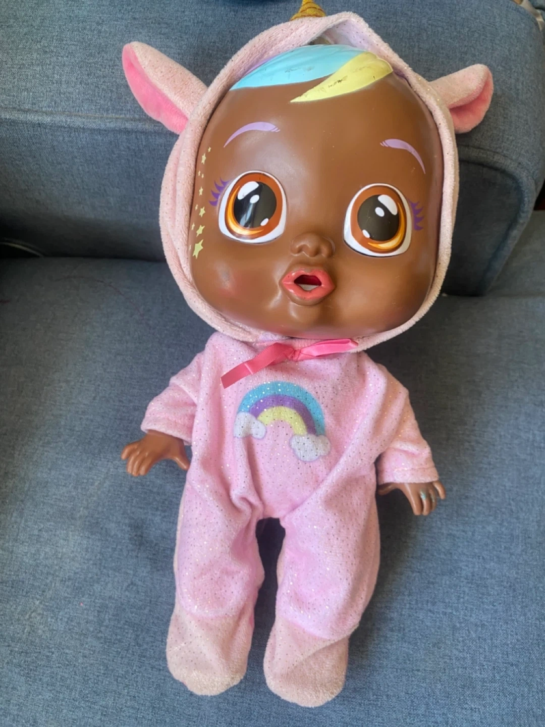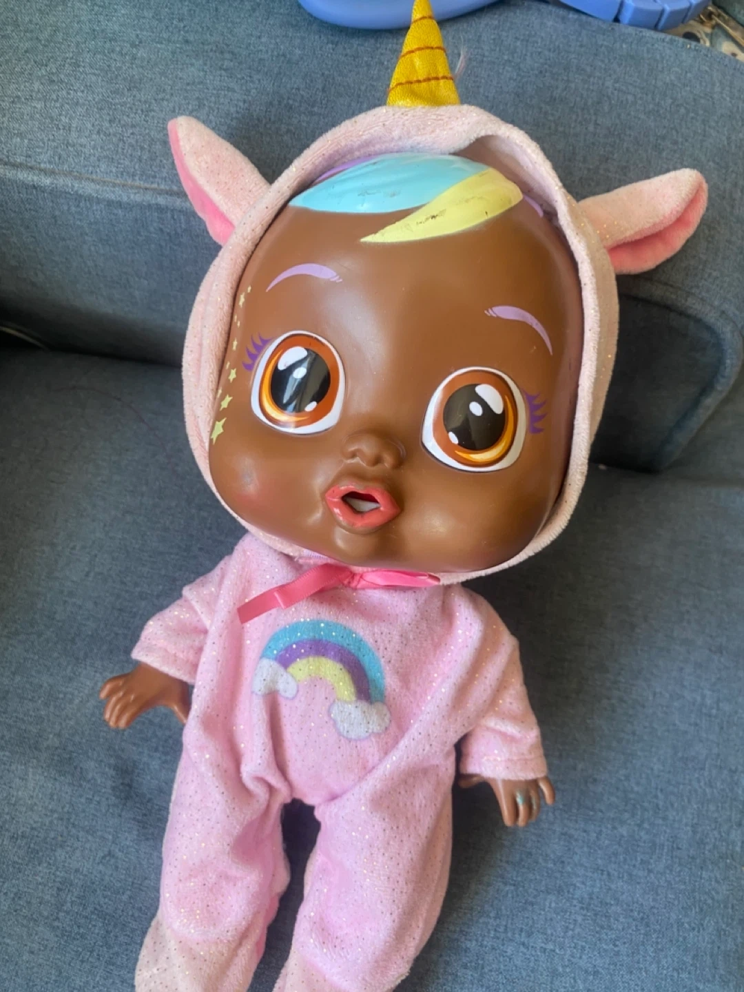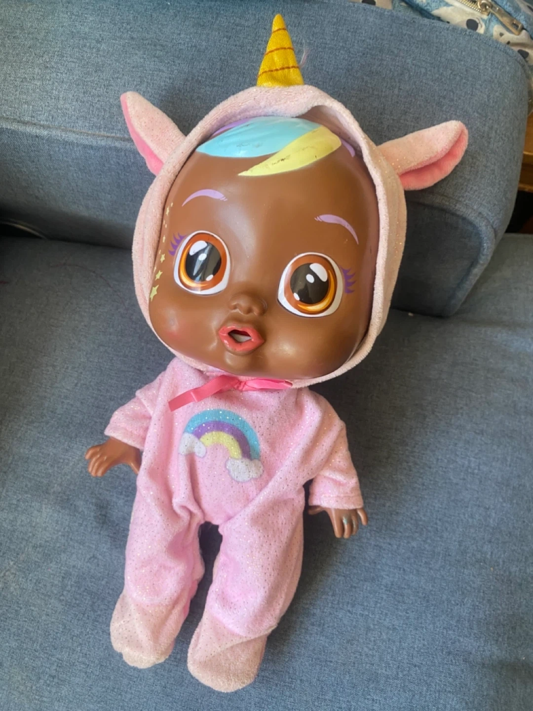 Selling a cute Cry Babies Day Care Jenna doll! She's wearing a pink unicorn outfit with a rainbow on the front. In great condition and ready for a new home