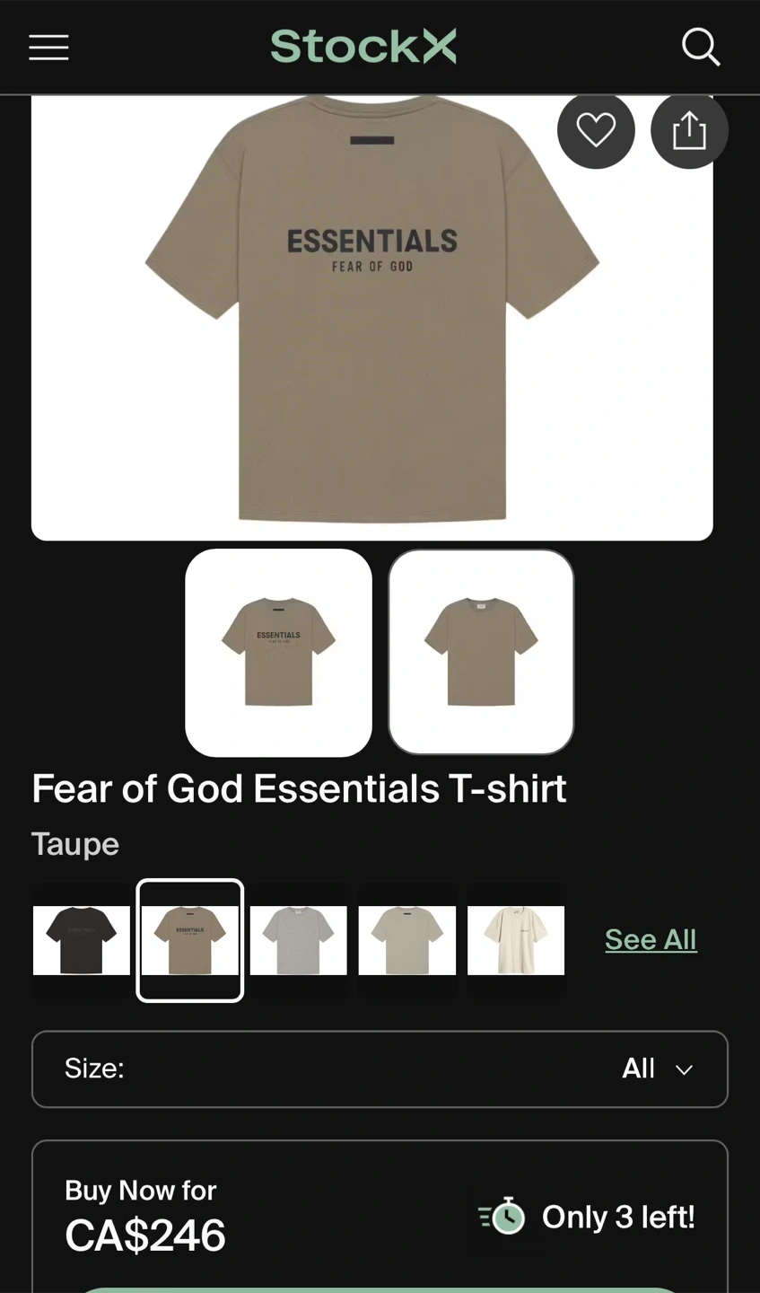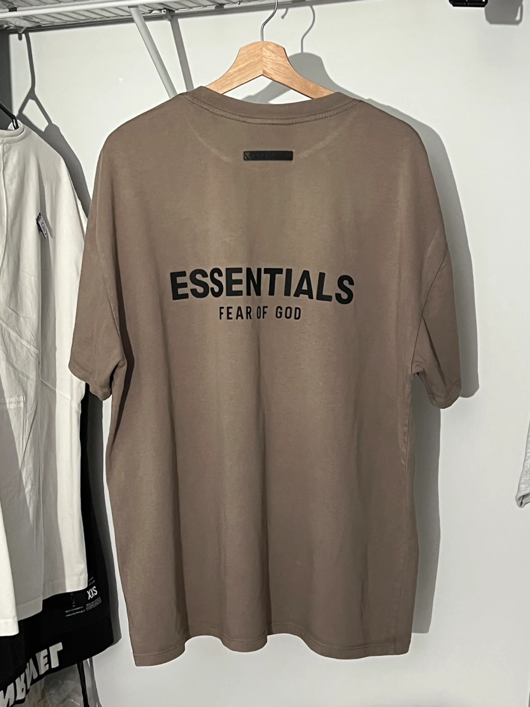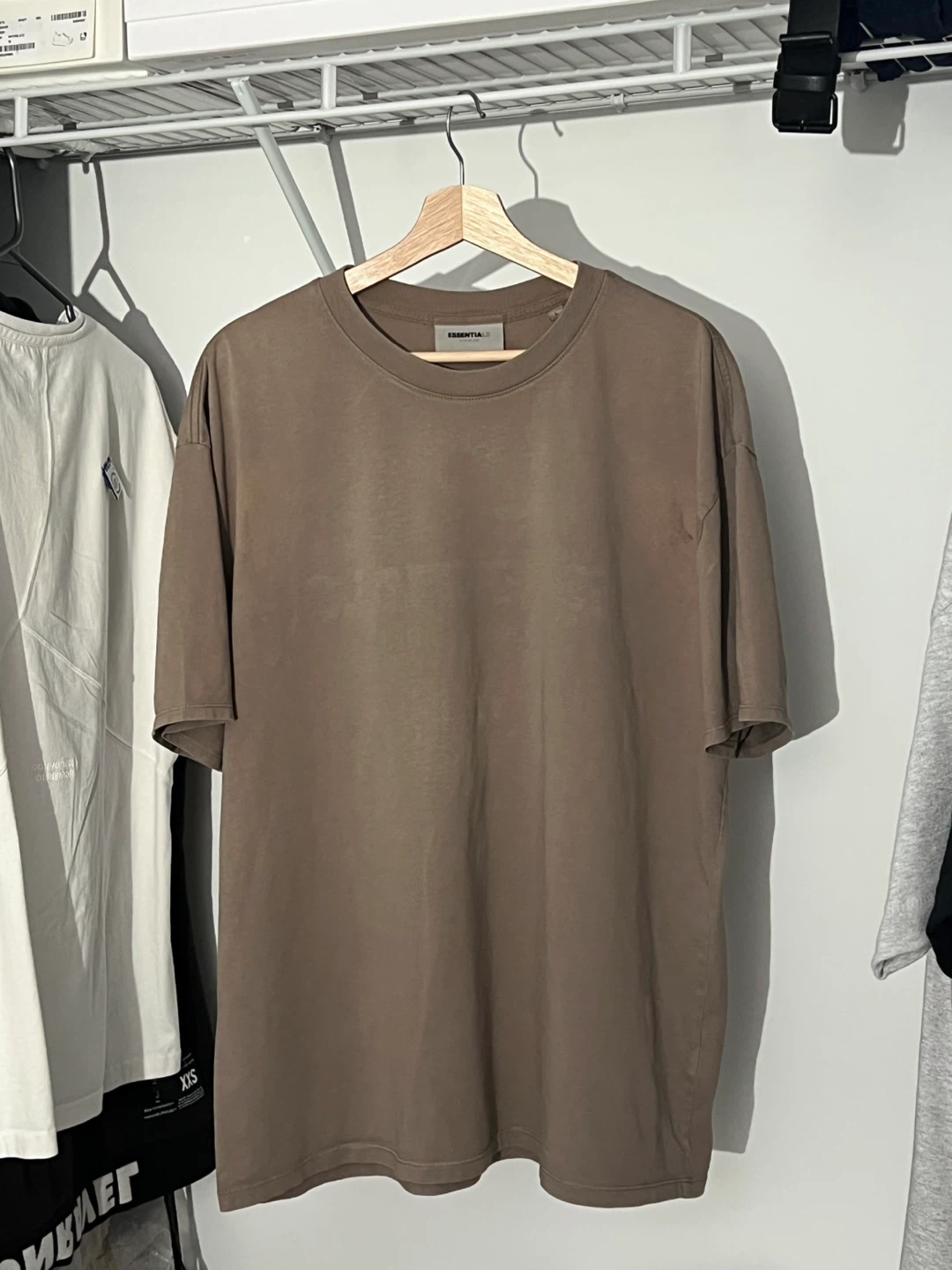 Selling a Fear of God Essentials T-shirt in taupe. This is a stylish and comfortable tee, perfect for everyday wear.