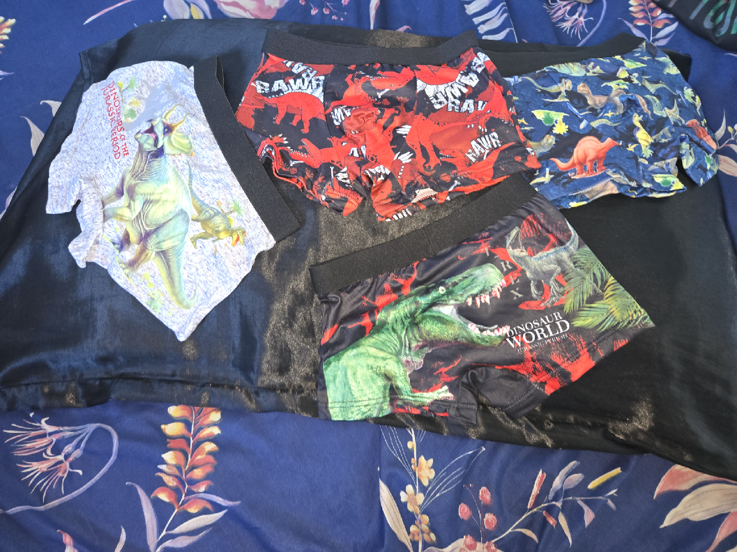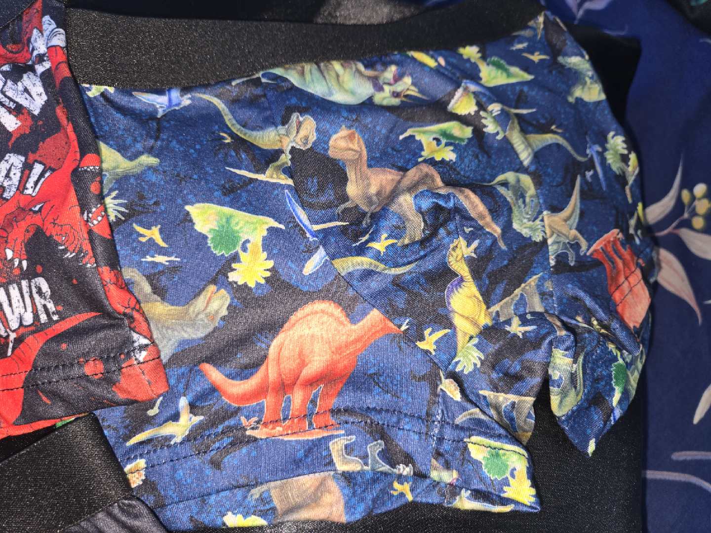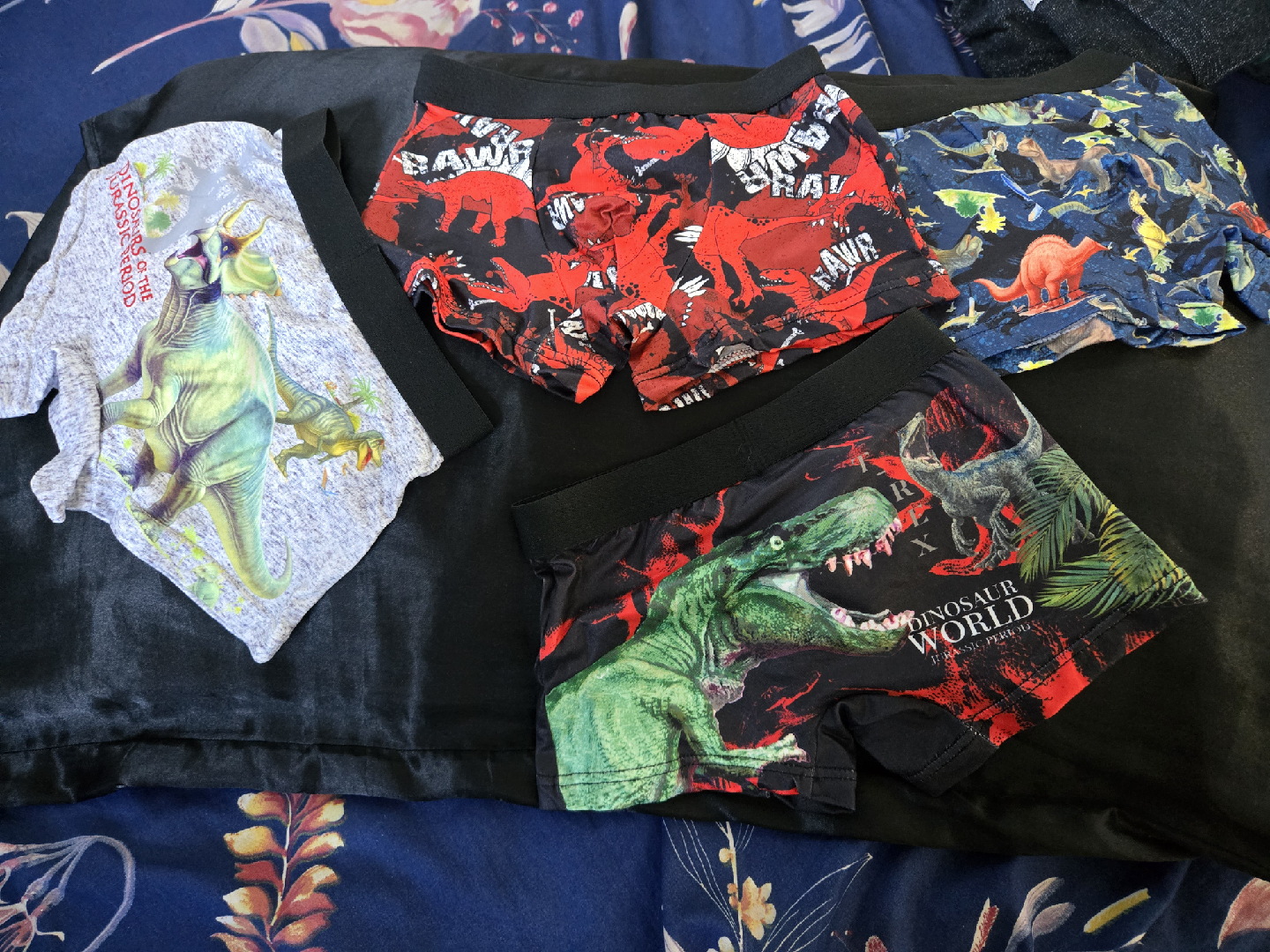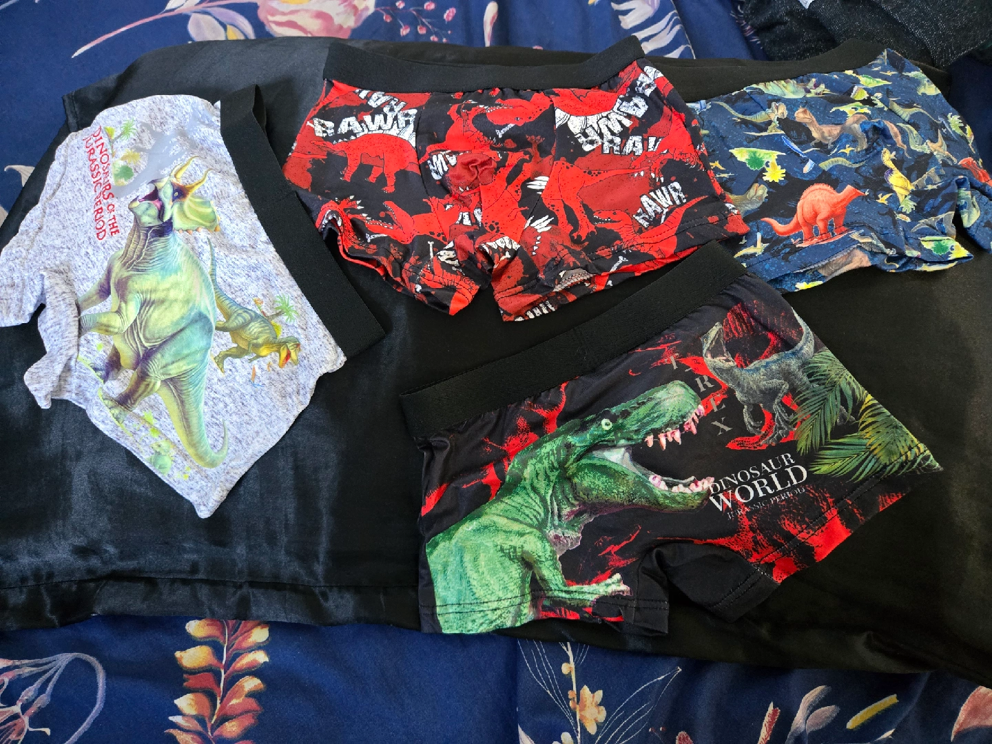 Selling a set of boys' underwear with fun dinosaur prints!