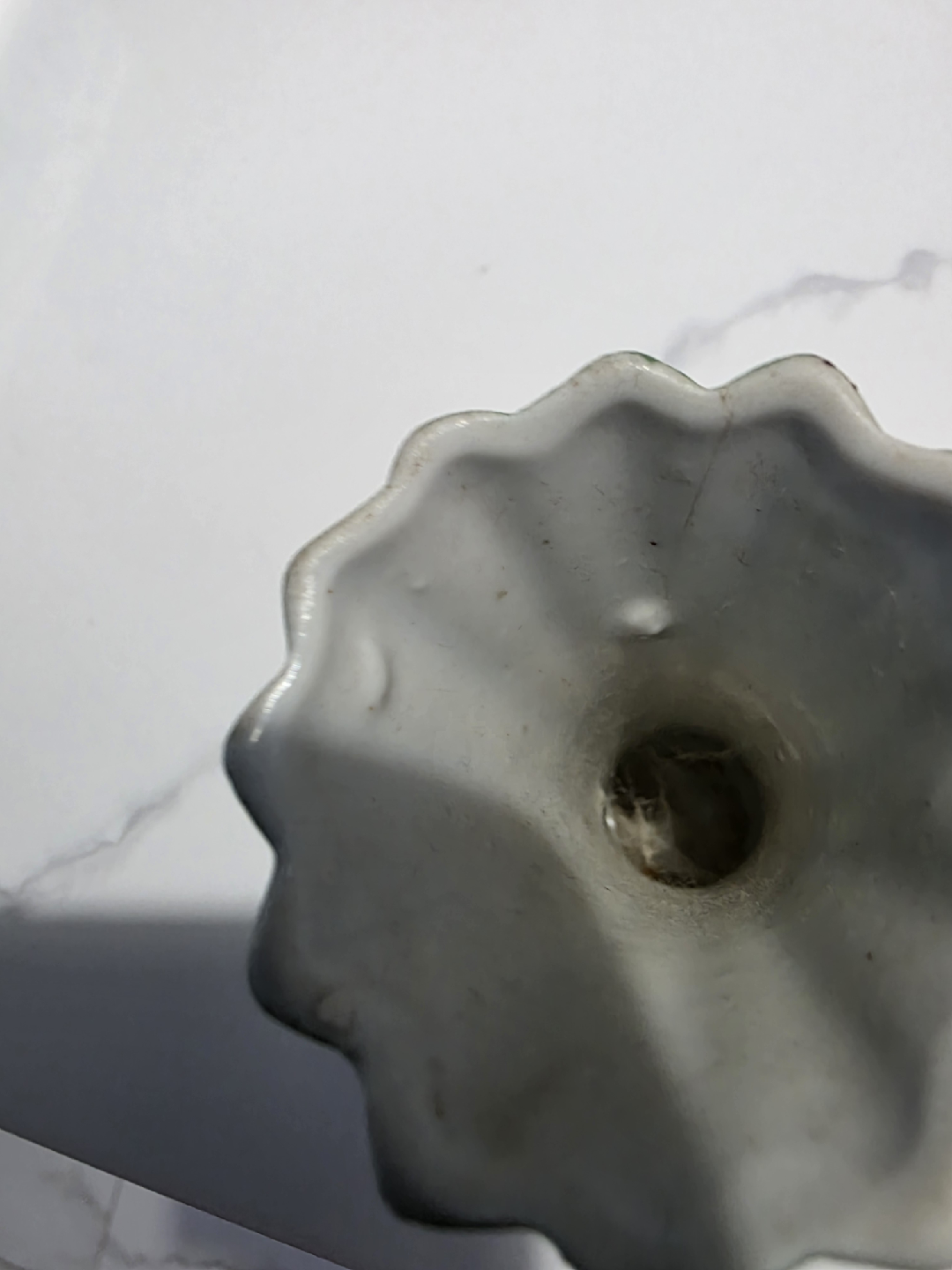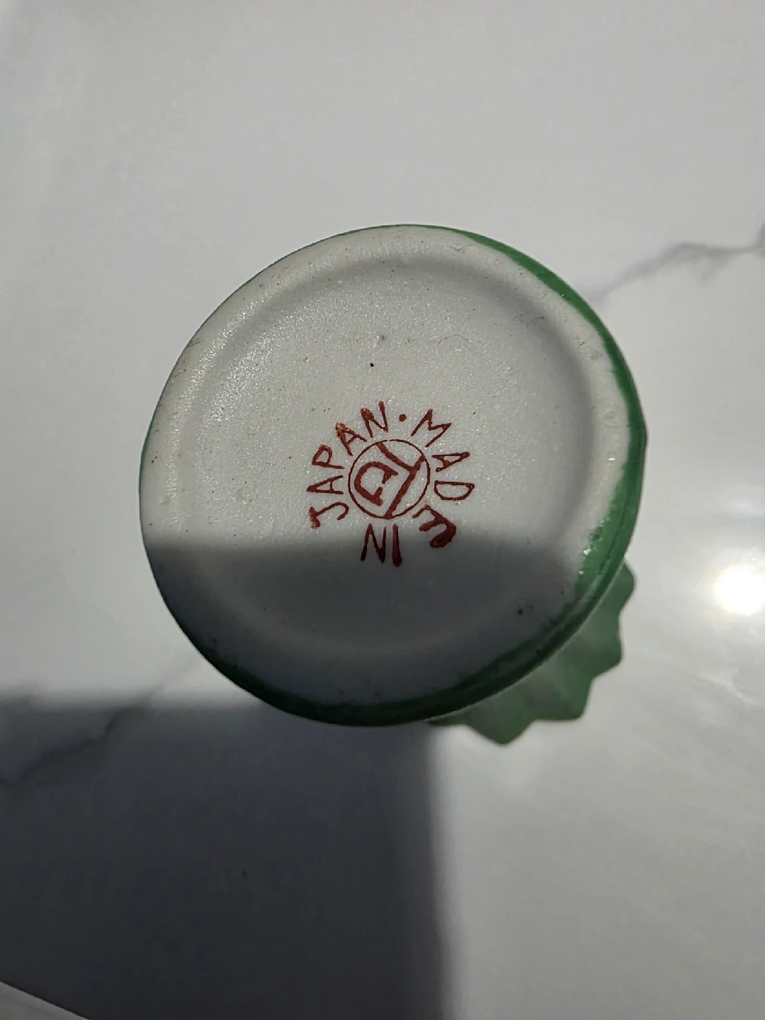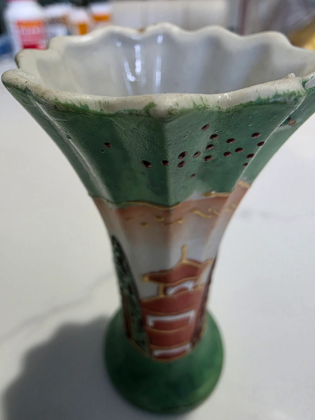 Selling a vintage vase that's marked "Made in Japan" on the bottom. It has a unique design with a green, white, and peach color scheme, featuring what looks like a pagoda. It would make a great addition to any collection or as a decorative piece!