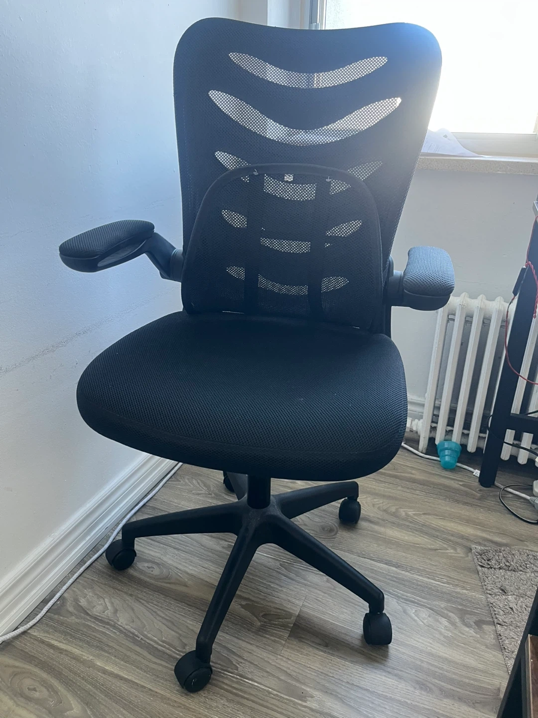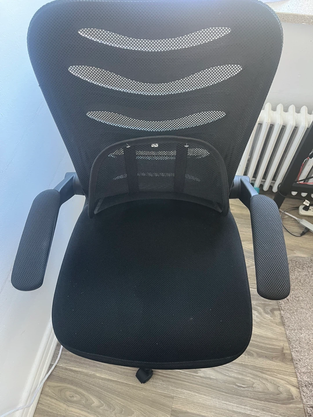 Selling a black office chair in good condition. It features a mesh back and adjustable armrests for added comfort. Perfect for your home office or study space!