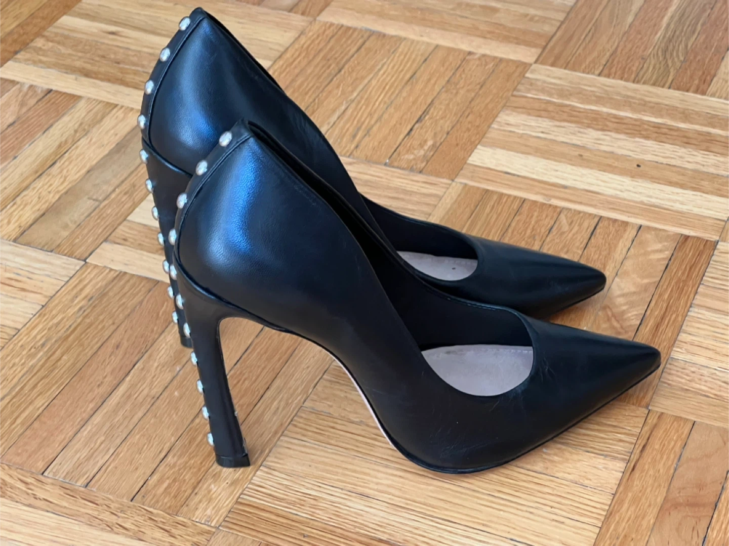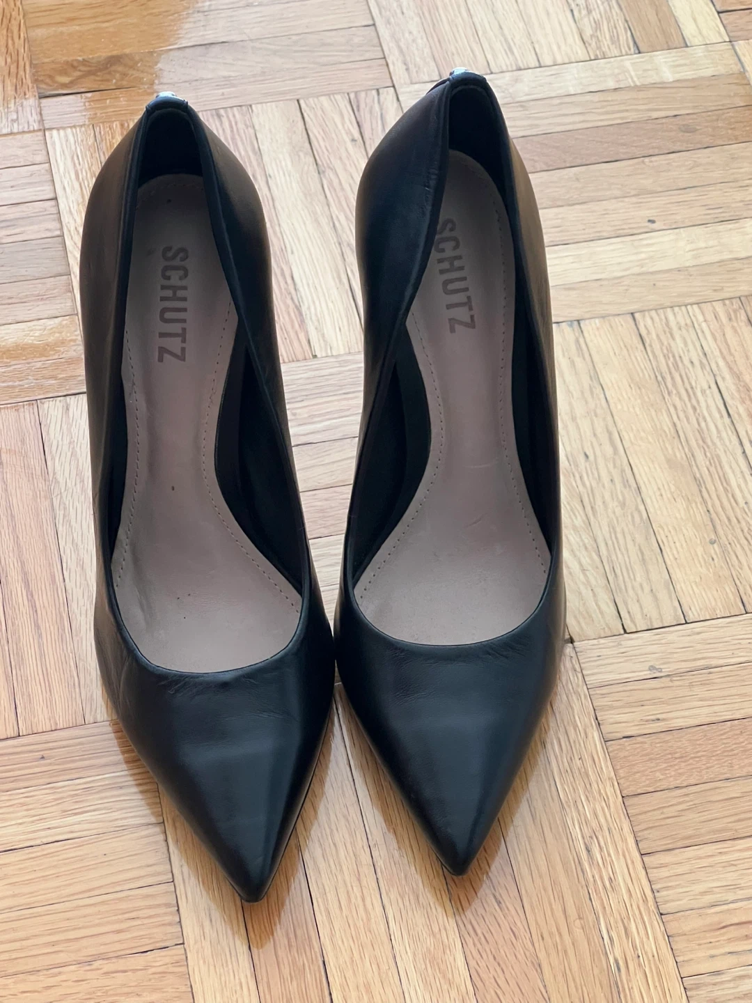 These are a pair of Schutz black leather pointed heels. They feature studded detailing on the heel. They are in good condition and ready for a new home!