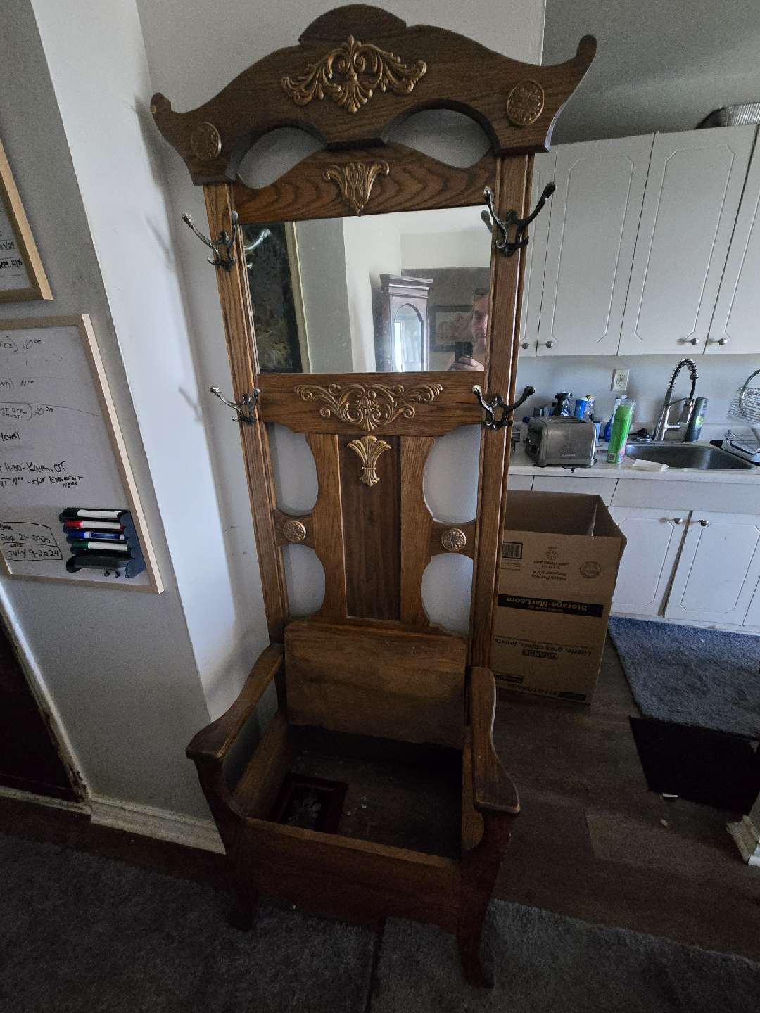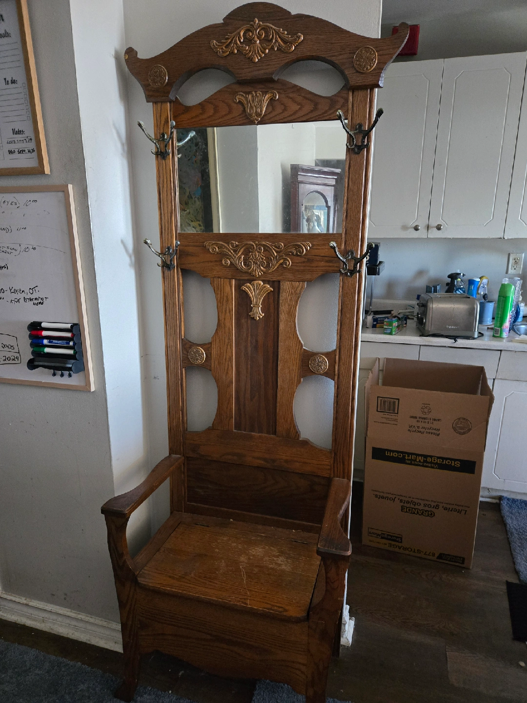 estate clear out. This is a beautiful antique wooden hall tree. It features a mirror, coat hooks, and a storage bench at the bottom. It's a unique piece that would add character to any entryway or hallway. It has some wear and tear, but is in overall good condition for its age.