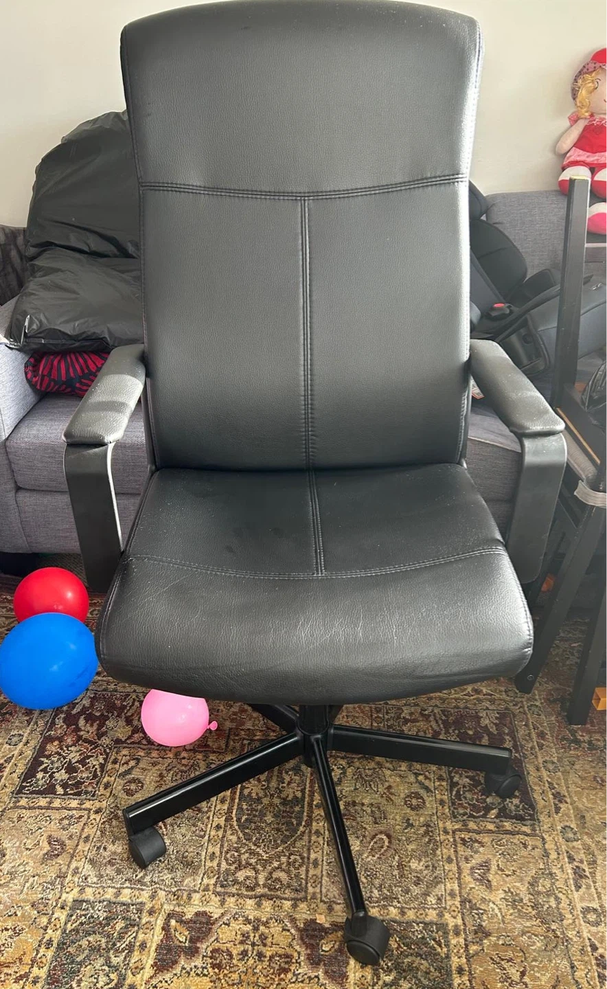 IKEA MILLBERGET Swivel Chair – Murum Black (used like New) Selling a black executive office chair. It's in good condition and ready for a new home office! The chair features a high back, padded armrests, and a sturdy base with wheels.no damaged can be tested.