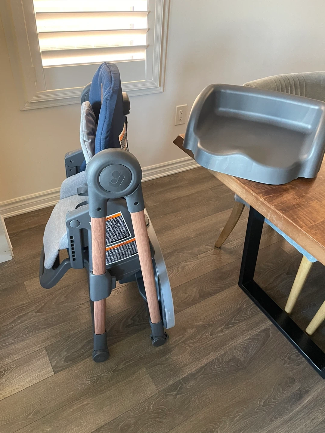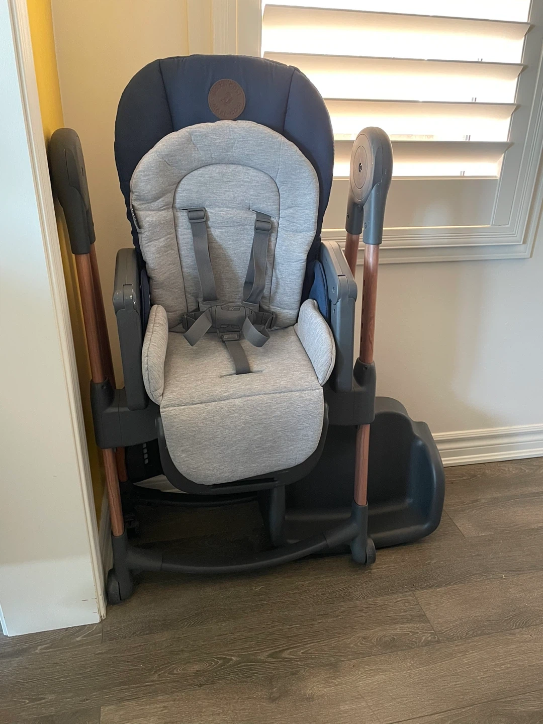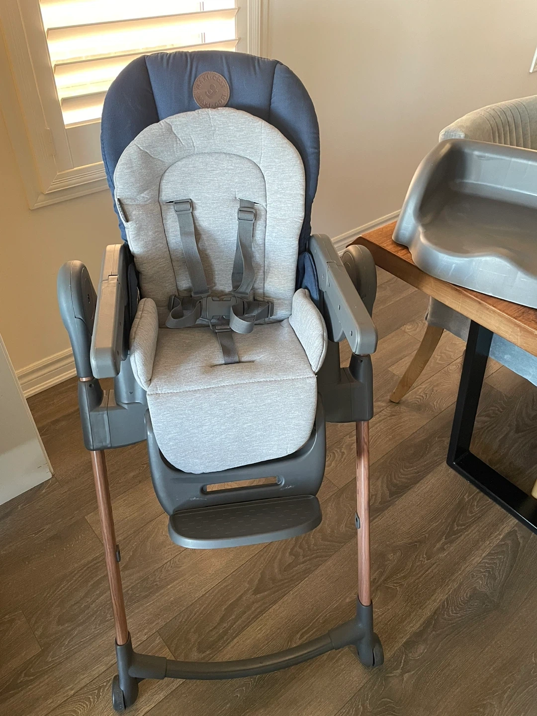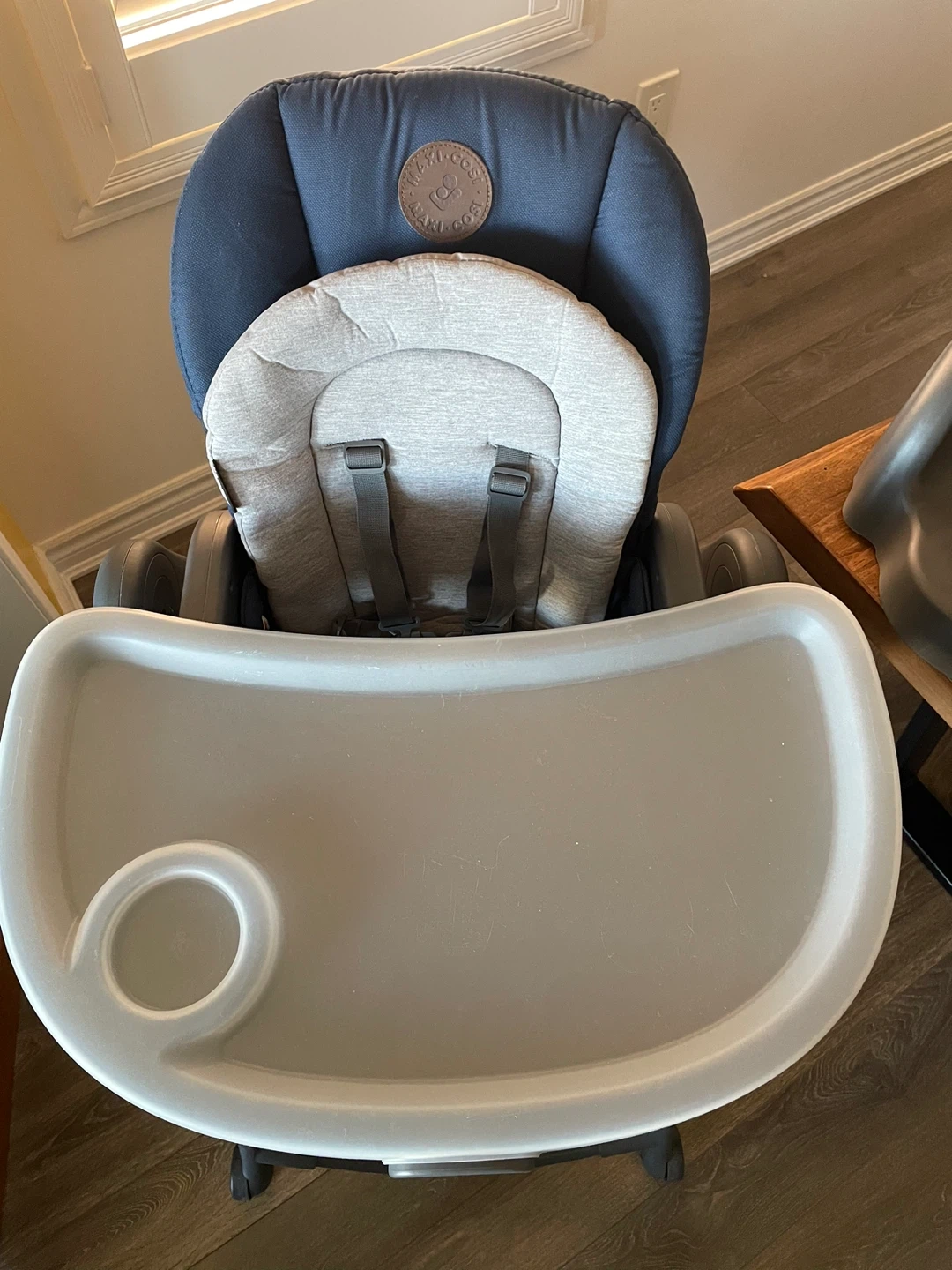 This Maxi-Cosi high chair is in great condition and ready for a new home! It features a comfortable navy blue seat and a removable tray for easy cleaning. The chair is designed to grow with your child, offering adjustable height and recline positions. It also comes with a removable seat pad.