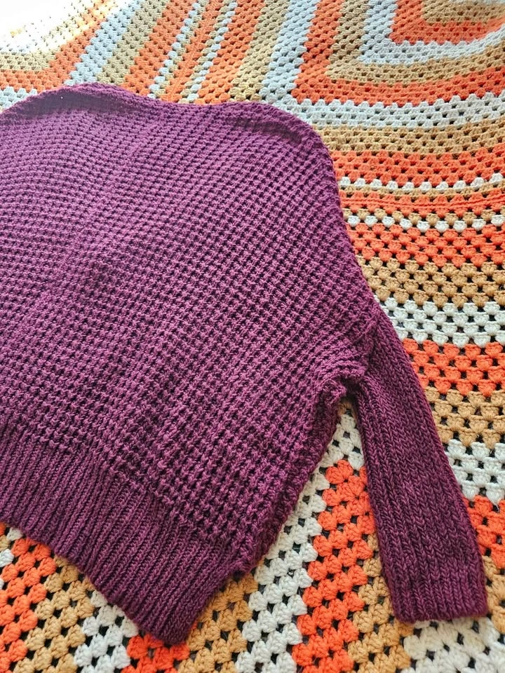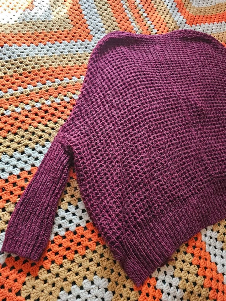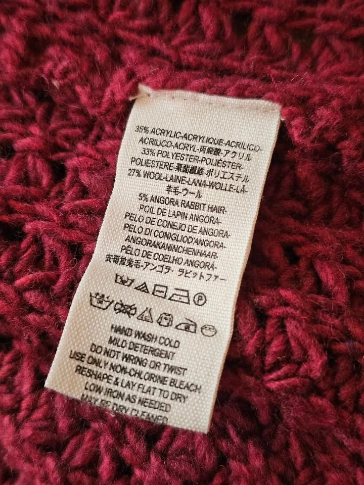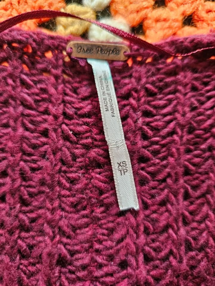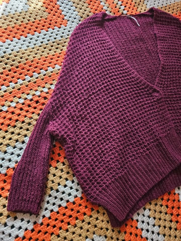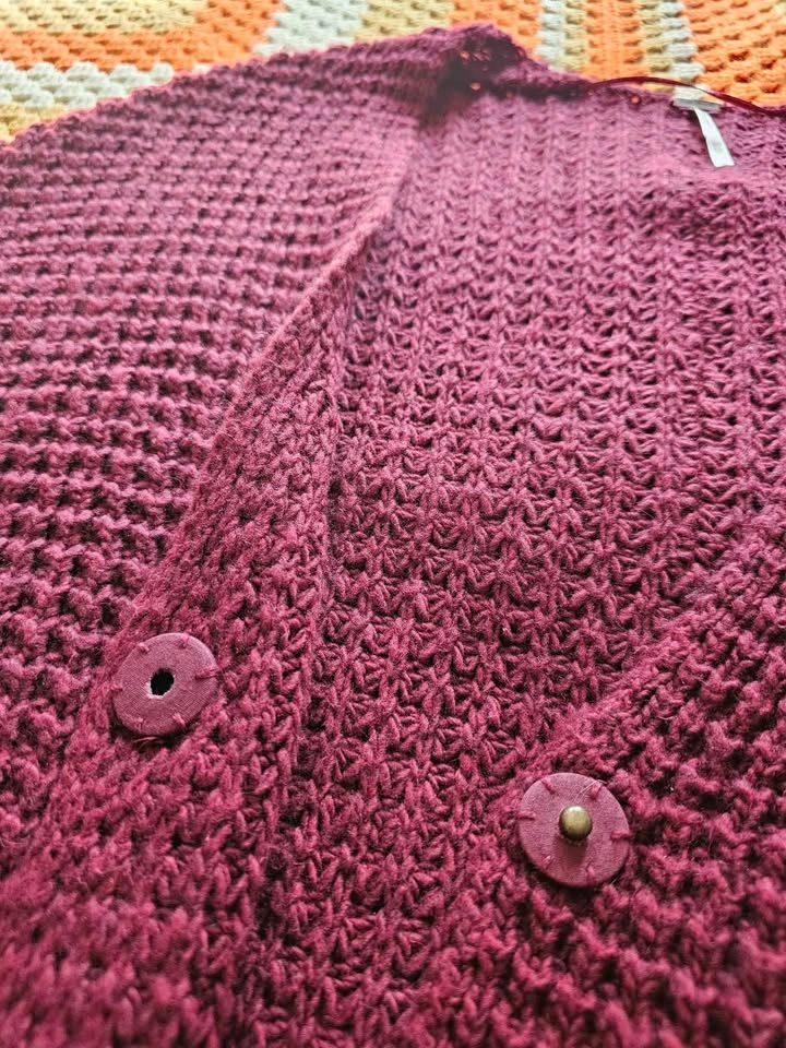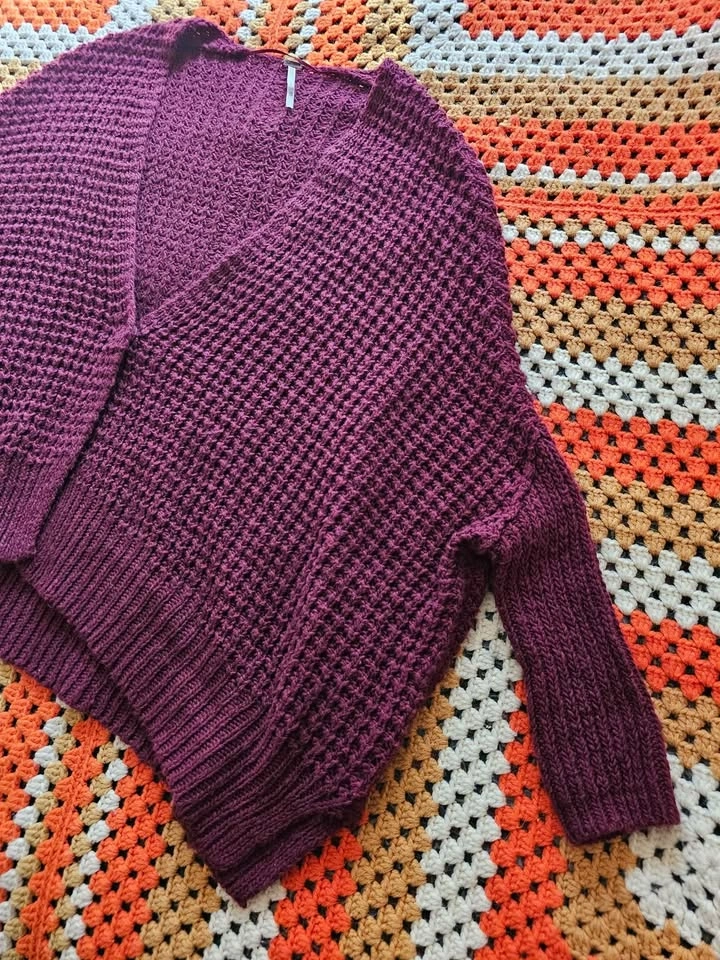 Free People Breeze maroon/ burgundy chunky oversized waffle knit cardigan sweater, with a flattering boxy style in the torso and dolman sleeves that are fitted from the elbow down. Cardigan is made of a soft and warm blend of acrylic, polyester, wool and angora rabbit hair yarn. It closes with a single hidden snap button. Perfect layering piece for relaxed boho chic vibes in chilly weather!