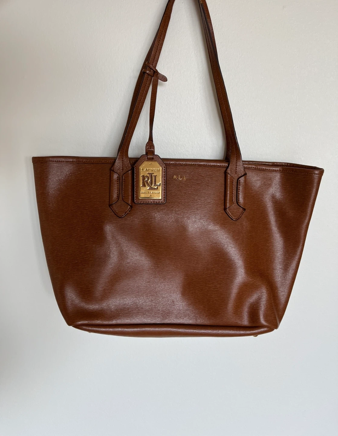 Ralph Lauren brown leather tote bag. It's in good condition and perfect for everyday use. The bag features the classic Ralph Lauren logo and has a spacious interior. Some wear on the leather straps!