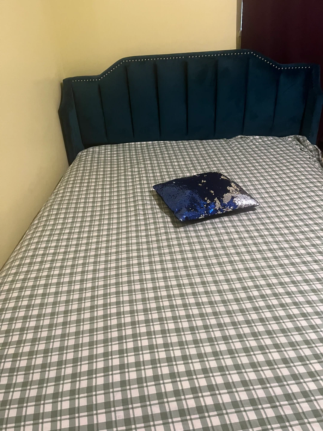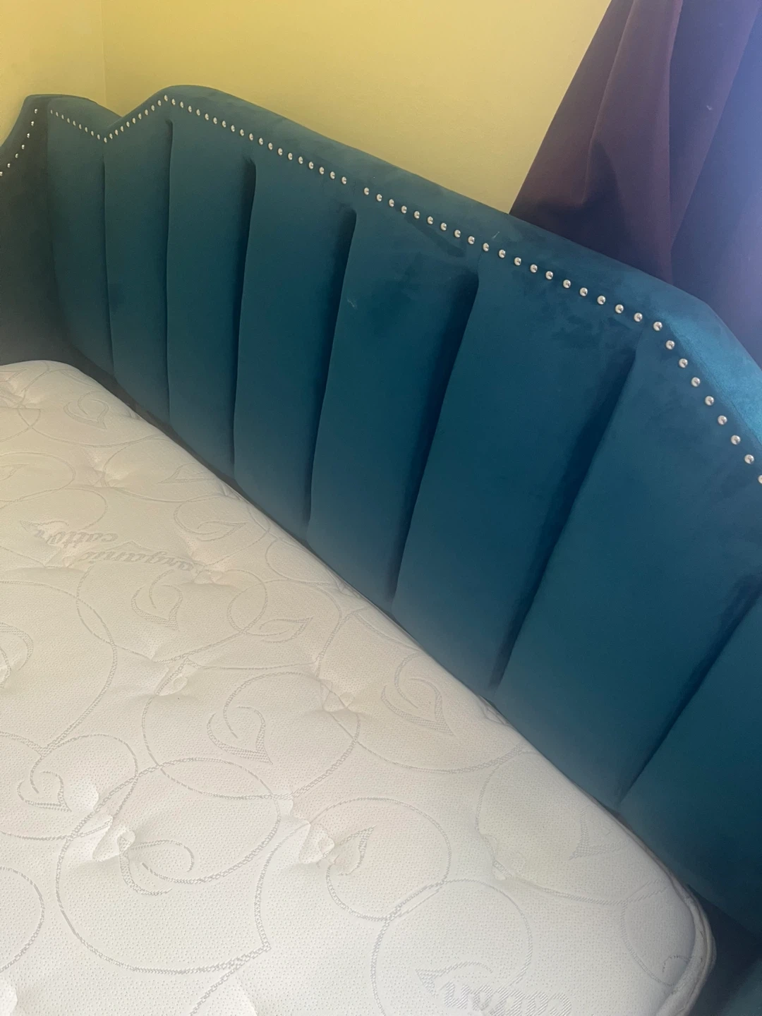 Selling a queen size teal velvet headboard bed with mattress in great condition! It's a lovely addition to any bedroom. The velvet material adds a touch of luxury and the teal color is both calming and stylish.