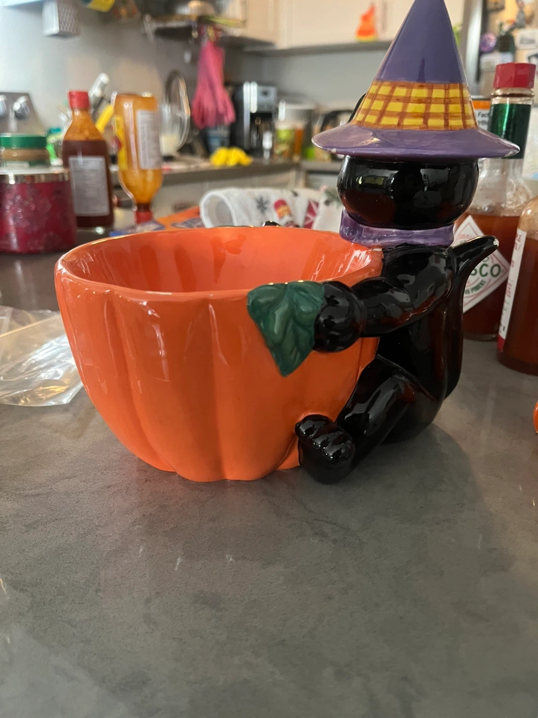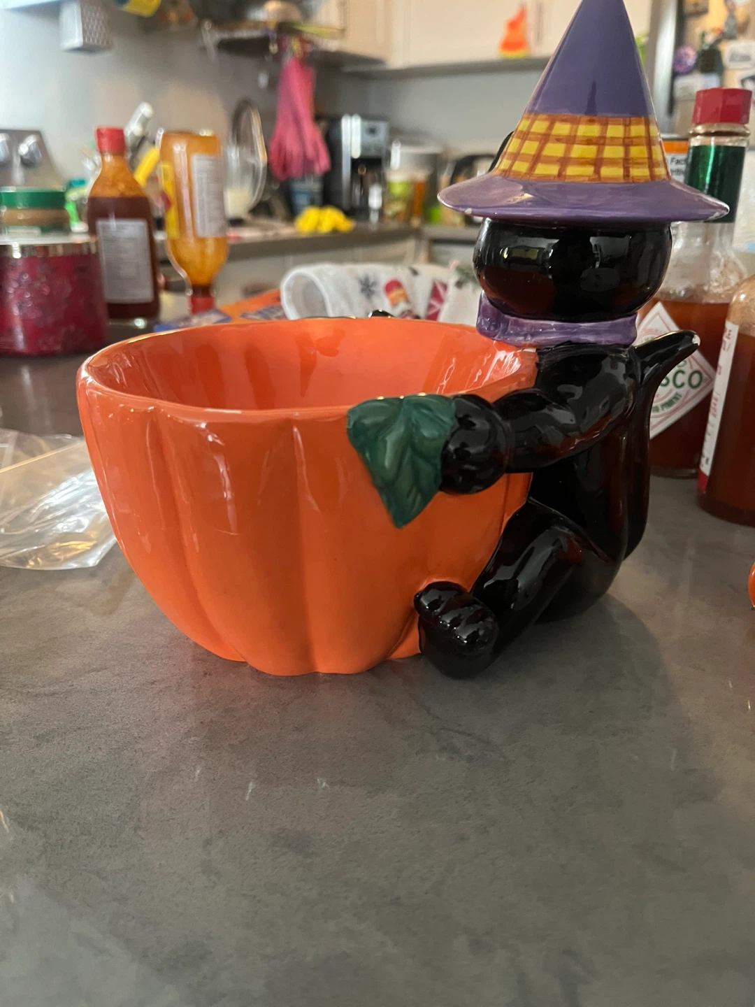 Super cute Halloween candy dish featuring a black cat wearing a witch's hat holding an orange pumpkin shaped bowl! Perfect for holding candy or other small items during the spooky season
