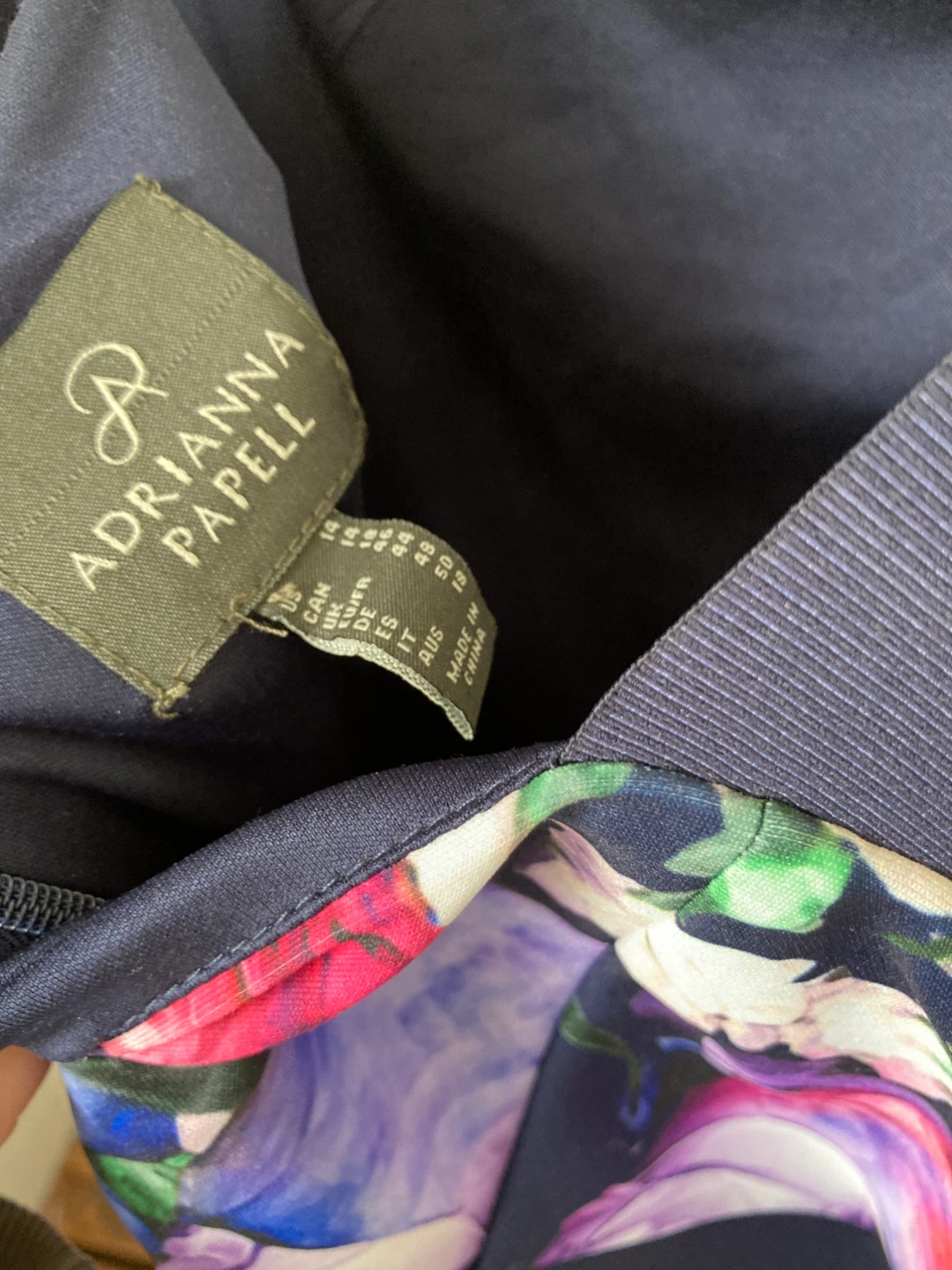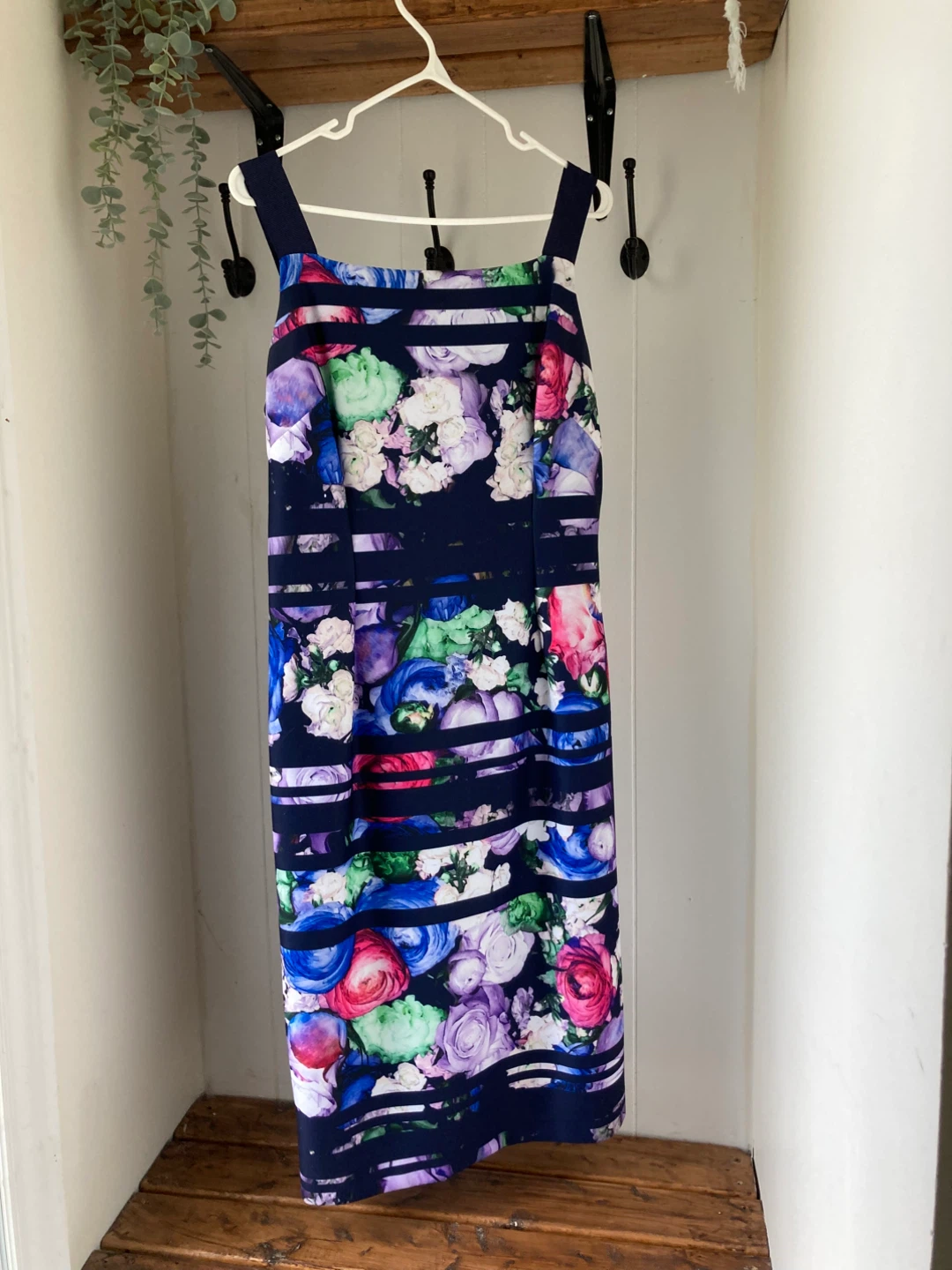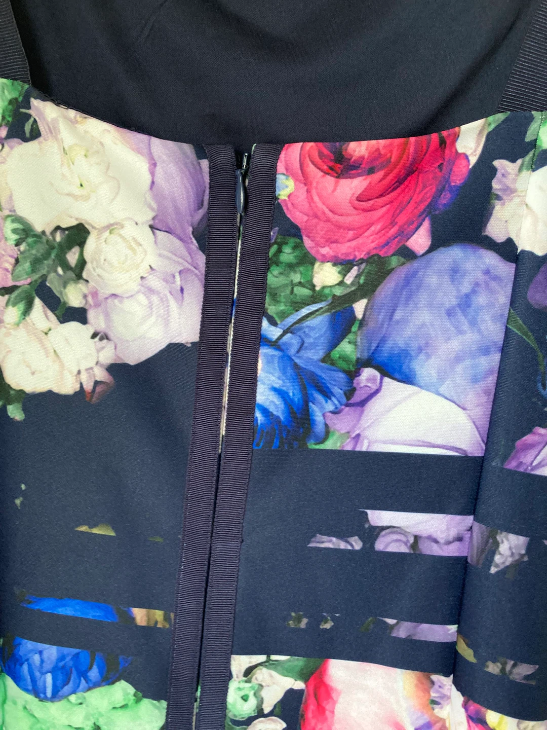 The floral colours are very eye catching, while navy blue makes this dress great for colder months. Hidden zipper on the back as seen in photos.