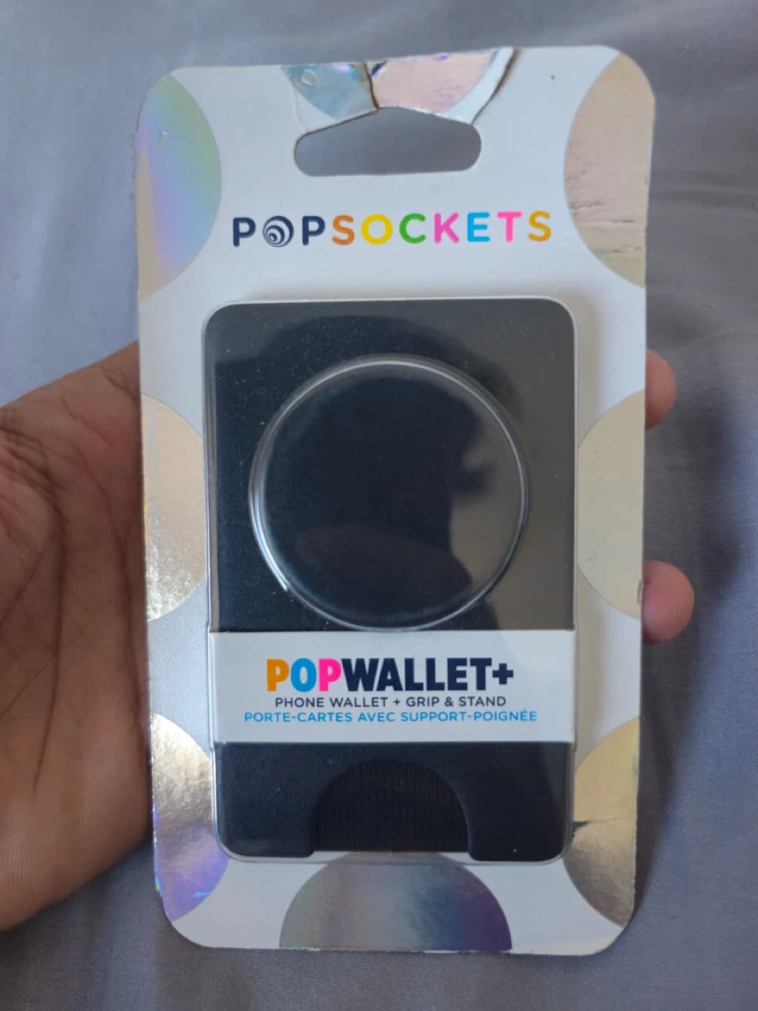 Selling a new PopSockets PopWallet+ in black! It's a phone wallet, grip, and stand all in one. It's perfect for holding your cards and propping up your phone. The packaging is included.