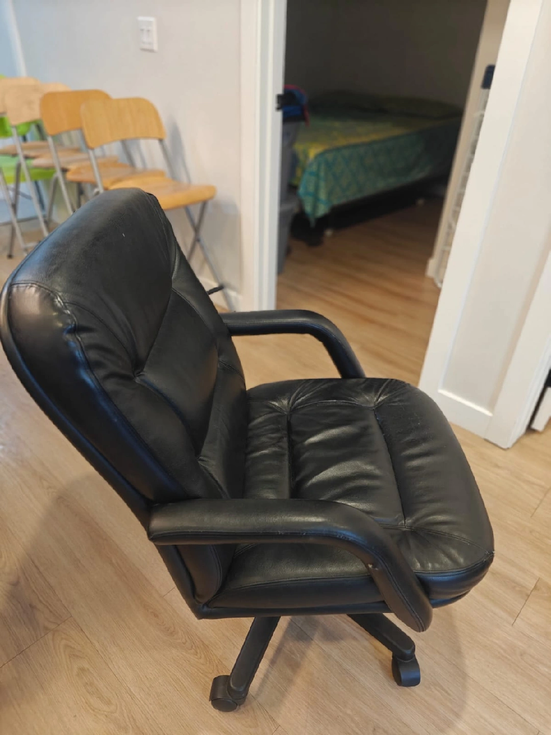 Looking to sell this black office chair. It's in good condition and ready for a new home office setup. It has a padded seat and back for extra comfort, plus it swivels and has wheels for easy movement around your workspace