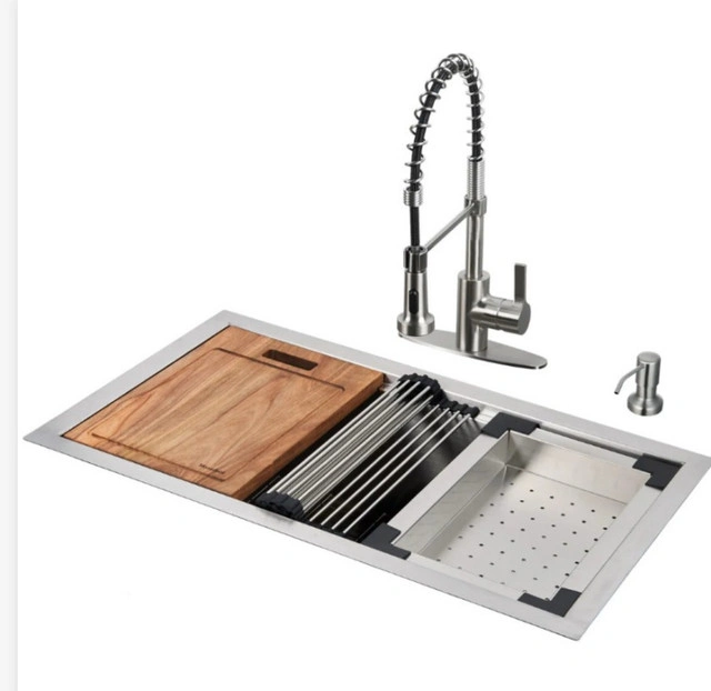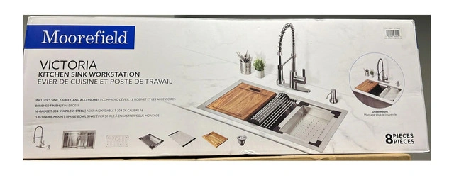 Upgrade your kitchen with this brand new Moorefield Victoria Kitchen Sink Workstation, featuring a brushed finish, single bowl, and an 8-piece accessory set! This sink is still new in its original packaging, ready to transform your cooking space into a culinary command center. Includes: 1 × 33 in. (83.8 cm) sink basin 1 × fitted basin grid 1 × drain strainer set with cover 1 × wooden cutting board 1 × steel colander 1 × steel roll-up drying rack 1 × pro-style faucet with optional 8 in. (20.3 cm) deck plate 1 × soap pump Illustrated instruction manual, mounting template, installation hardware, and warranty booklet. Specifications: Sink dimensions (L × W × D) : 83.8 cm × 48.3 cm × 26.2 cm (33 in. × 19 in. × 10.3 in.) Weight :11.4 kg (25.1 lb.) Faucet dimensions (L × W × D) : 22.0 cm × 5.7 cm × 51.6 cm (8.7 in. × 2.2 in. × 20.3 in.) Weight : 1.8 kg (4 lb.) Features: * Brushed Finish * Single Bowl * 8 Piece Accessory Set If the ad's still up, the sink's still available! Remember to check out my other ads. Discount available for multiple purchases!
