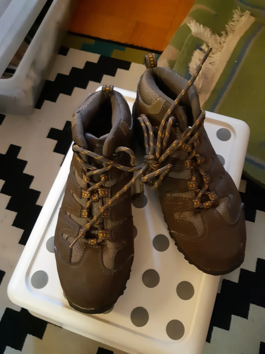 1000+These are a pair of brown hiking boots like new. It's brand is George. The laces are brown and gold. it is youth size 3.