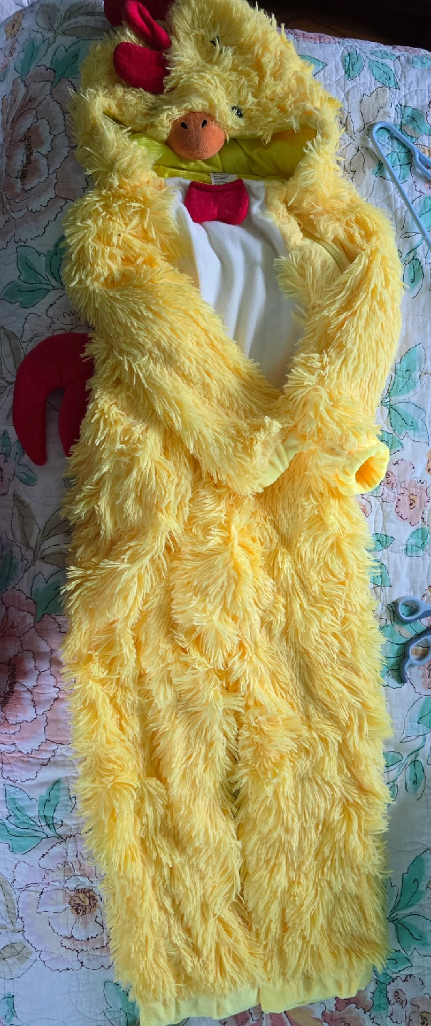 Here's a cute yellow chicken costume! Size 5-6 kids. It's soft and fluffy, perfect for a fun occasion. It has a red comb and tail, and a white belly. It is in good condition!