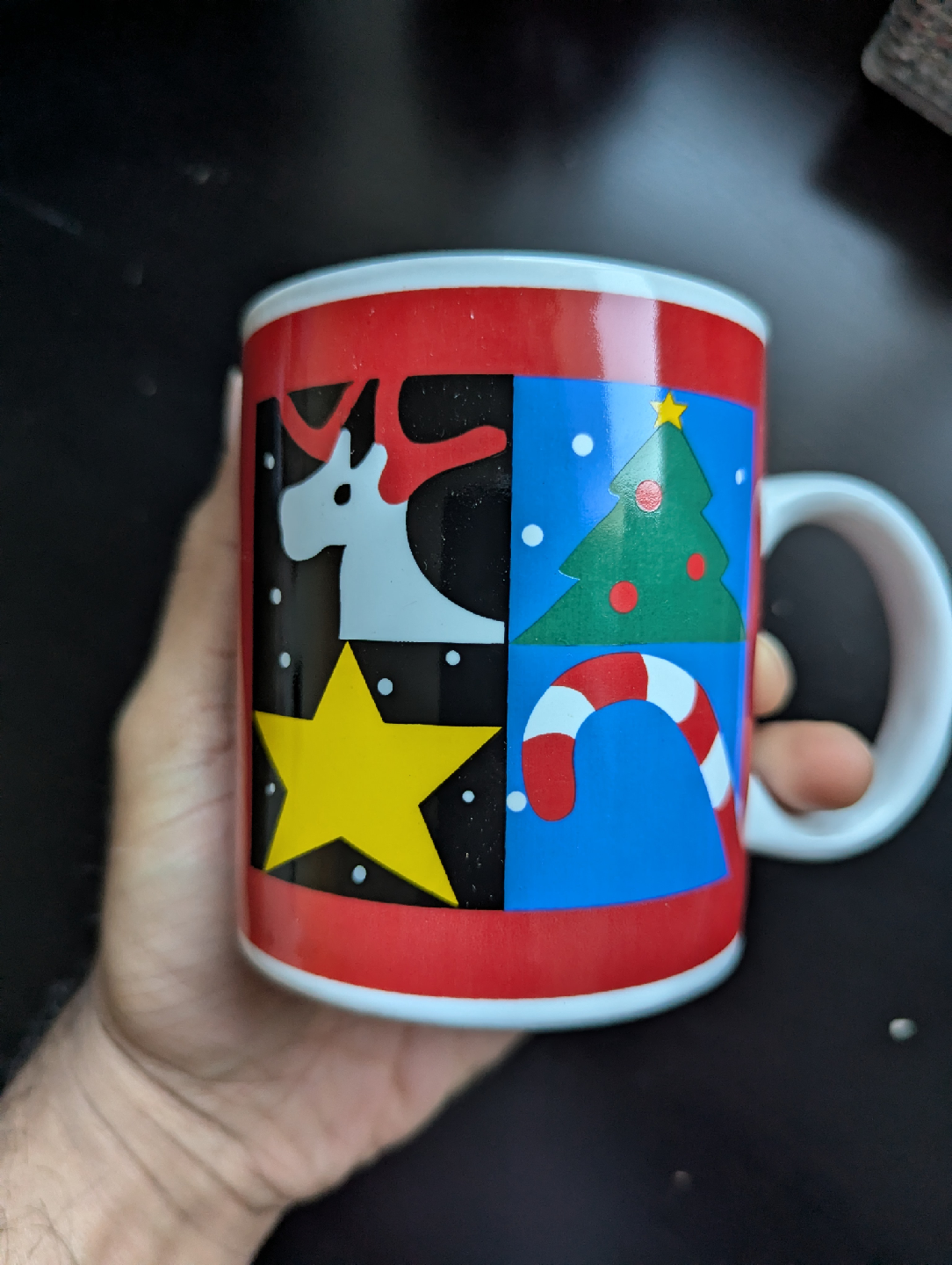 Festive Christmas mug featuring a reindeer, Christmas tree, star, and candy cane design! It's in great shape and ready to bring some holiday cheer to your morning coffee or hot chocolate