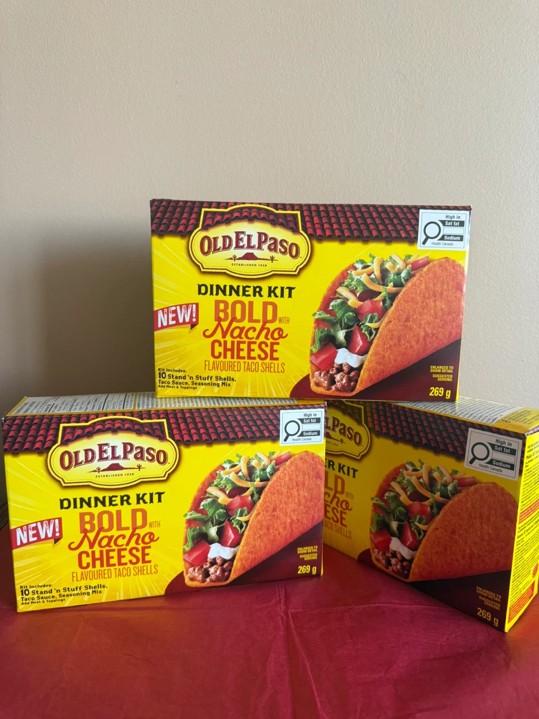 1000+MEETING LOCATION : Scarborough Town Centre Mall & Cash payment only. **In original condition, bought more than needed from a summer event!!! 🌮 3 Boxes Old El Paso Dinner Kits - Bold Nacho Cheese Flavoured Taco Shells 🌮 Brand new & sealed - Expiry: April 2026 All 3 boxes for $8.00!! ⭐️ 🌟 BOLD NEW FLAVOUR!! ⭐️ 🌟 Enjoy taco night with a cheesy twist! These Old El Paso Bold Nacho Cheese dinner kits make it easy to whip up a delicious, fun meal in minutes. Each kit includes: • 10 Stand 'N Stuff taco shells (Nacho Cheese flavour) • Taco sauce • Seasoning mix • 269 g X 3 boxes ••High in flavour - perfect for parties or family dinners!