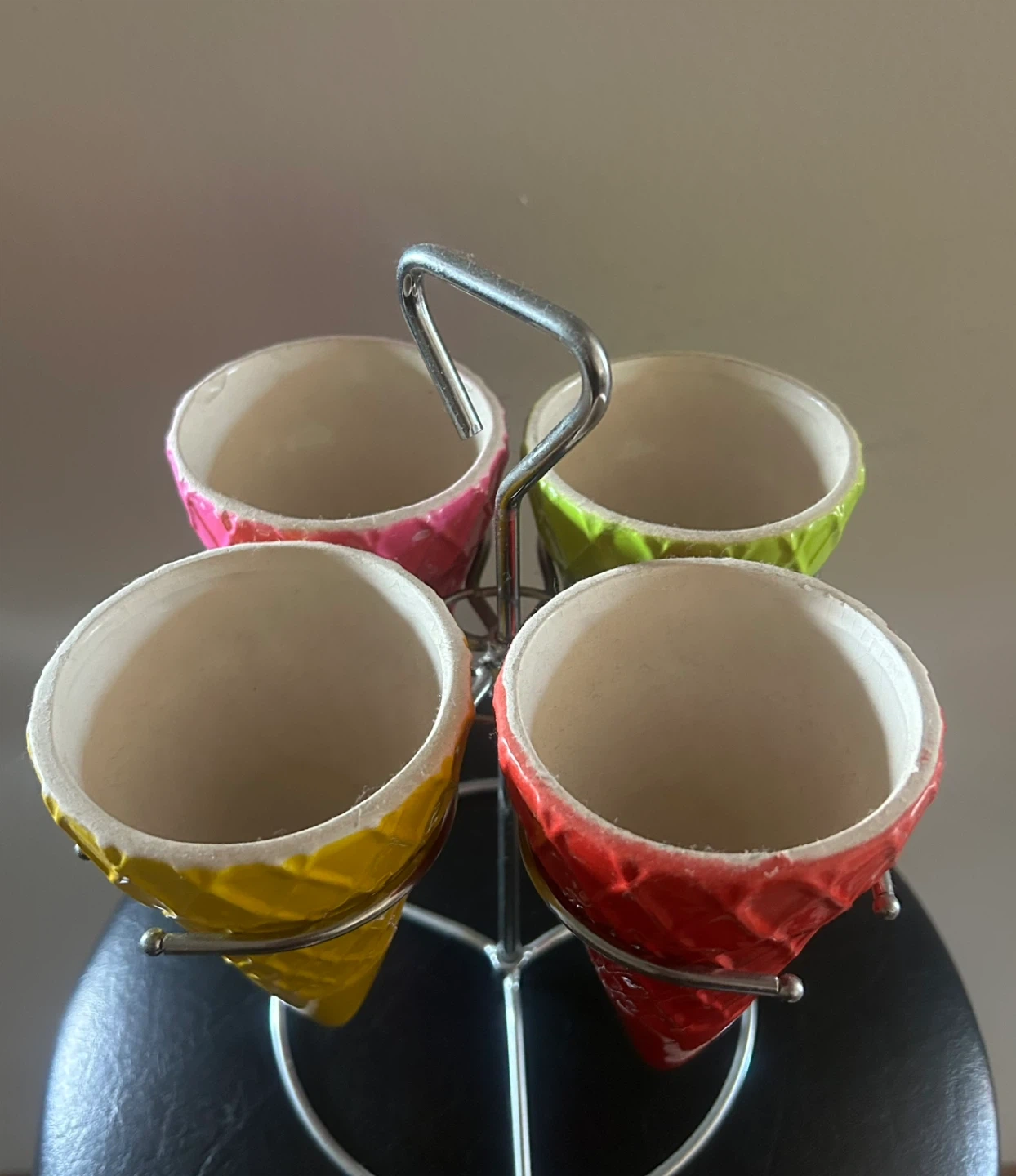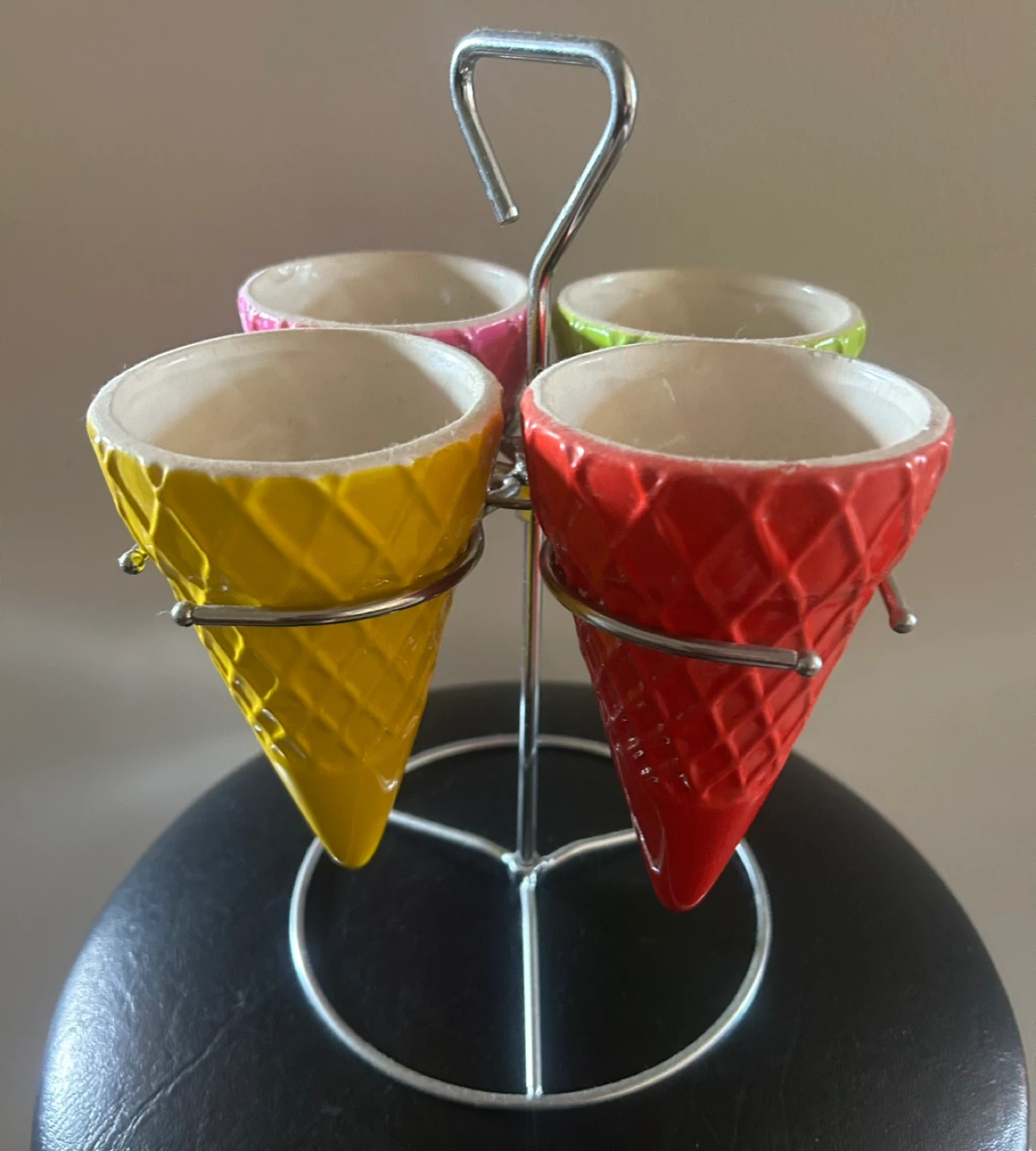 This adorable condiment holder is shaped like ice cream cones! It features four colourful cones (red, yellow, pink, and green) held together by a metal stand. It's in great condition and would be perfect for serving dips, sauces, or even small snacks at your next gathering