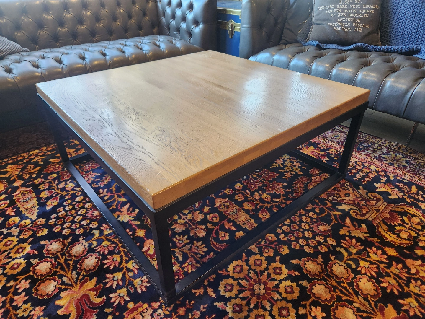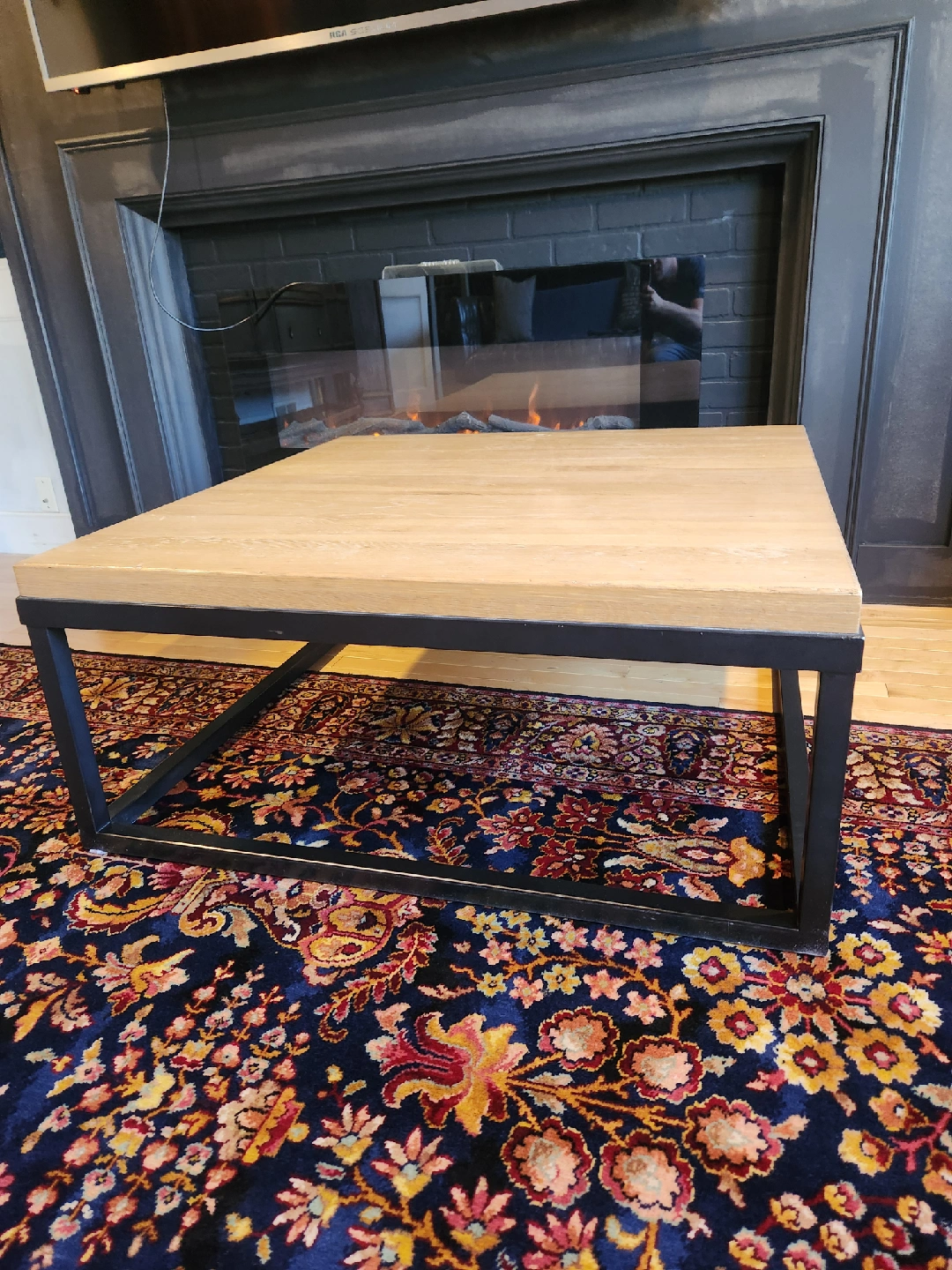 Selling a square coffee table with a heavy Oak wood top and a sturdy black metal base. It's in great shape and would look lovely in any modern living room!