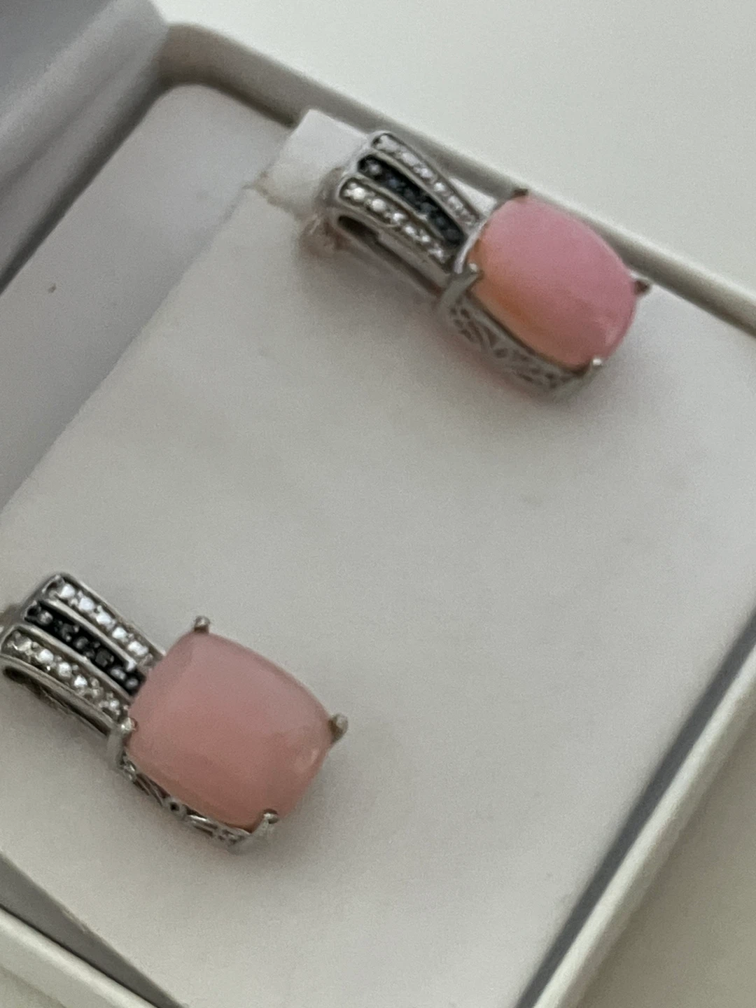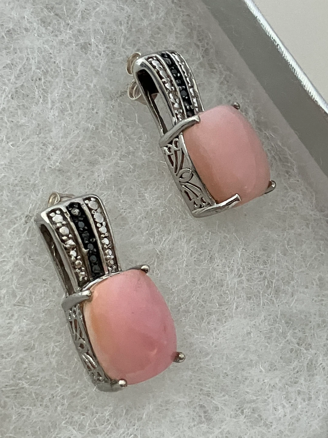 These are a pair of earrings with a pink stone and sterling silver detailing. They come in a box for safekeeping. The earrings feature a decorative design with small diamonds set into the silver.