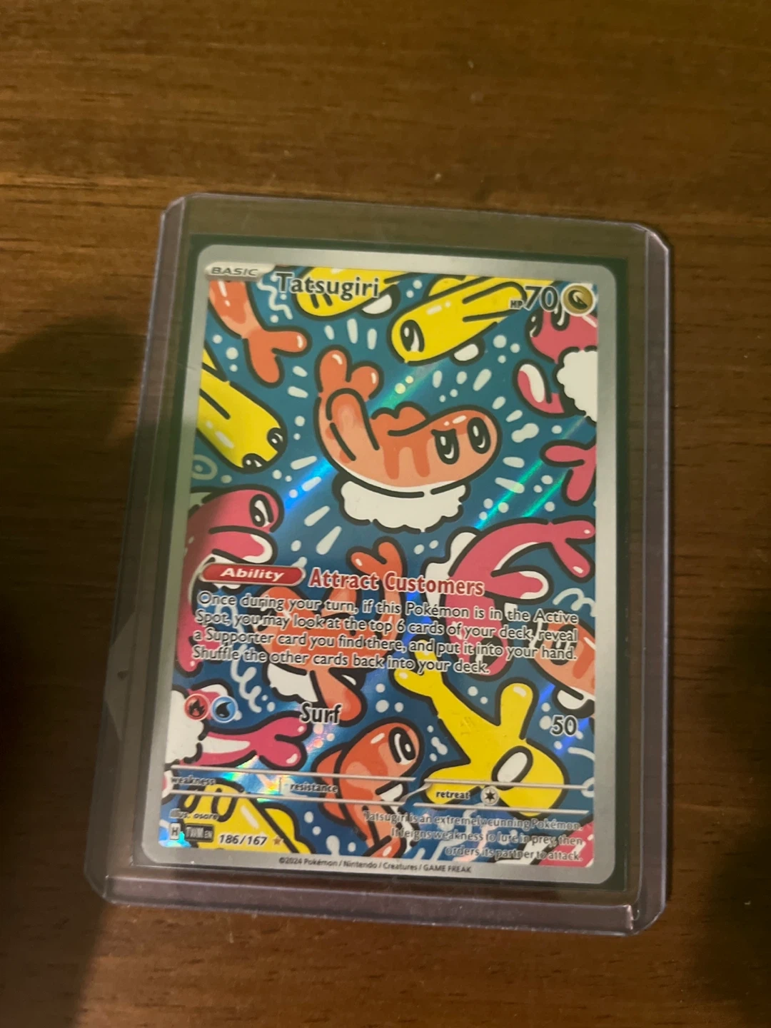Selling a Tatsugiri Pokemon card. It has the 'Attract Customers' ability and 70 HP. The card number is 186/167