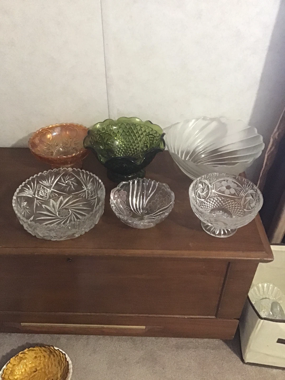 Selling a set of six vintage bowls! There's a mix of crystal and glass, with different patterns and colours. They'd be perfect for adding a touch of retro charm to your home