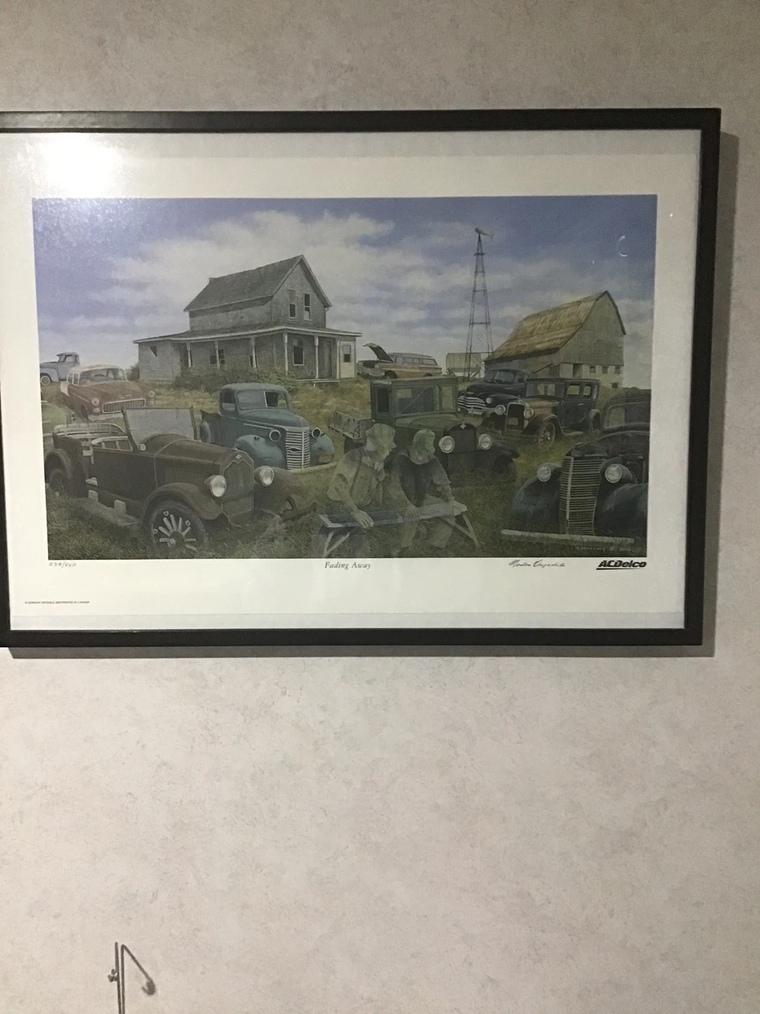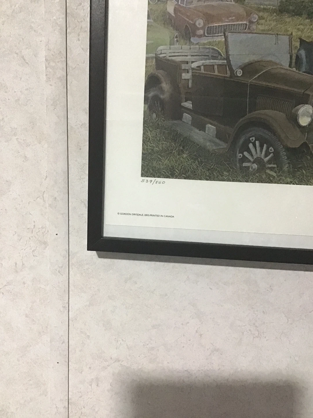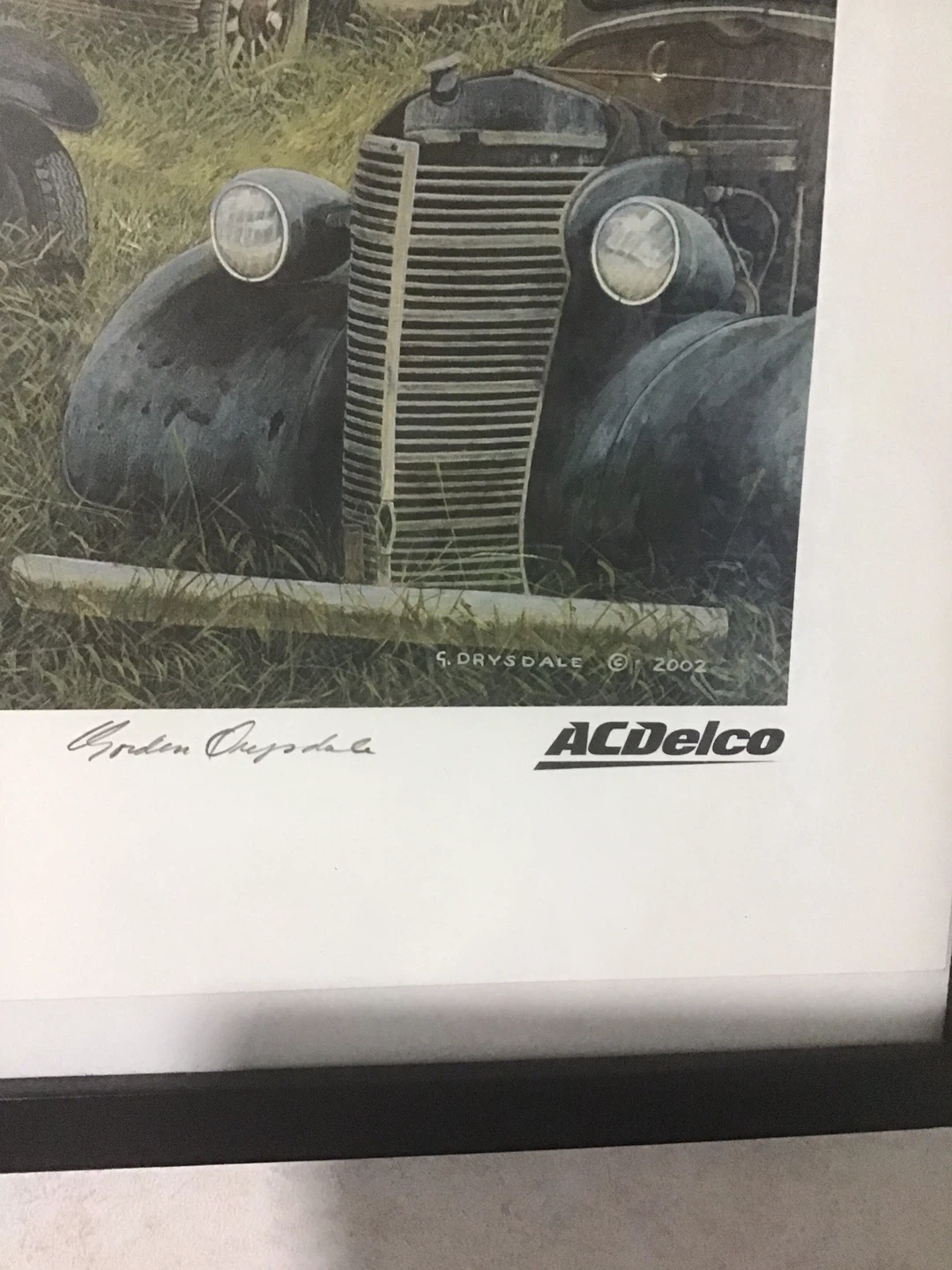 Framed print by Gordon Drysdale, printed in Canada. The print is numbered 539/860 and features a scene with vintage cars. The print also features the ACDelco logo.