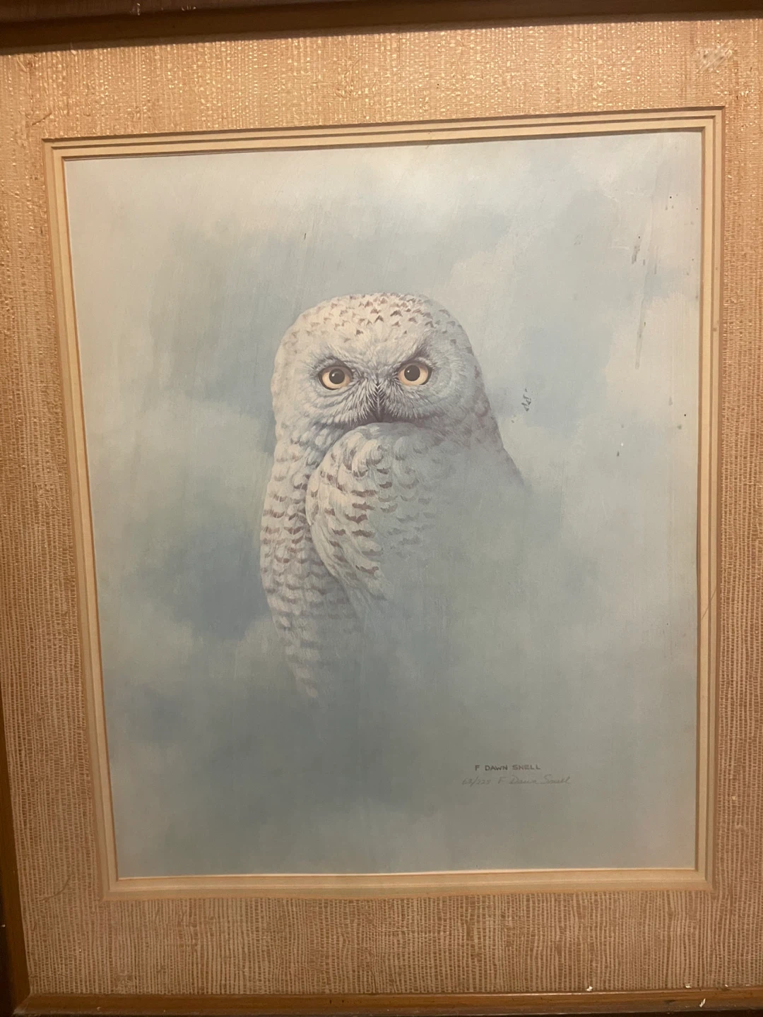 A beautiful owl print by F Dawn Snell. The print is numbered 63/225 and signed by the artist. It's in great condition and ready to hang in your home