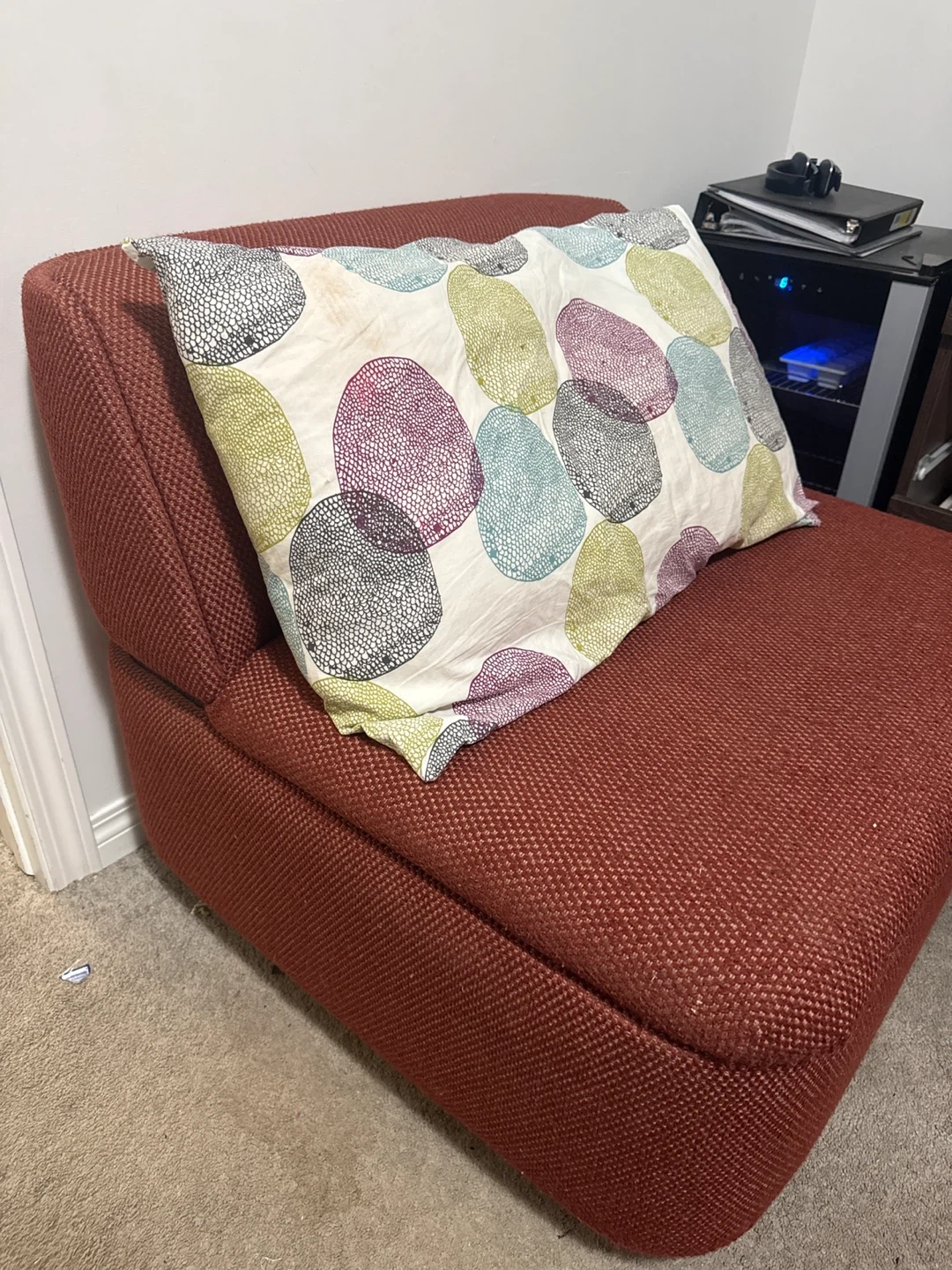 Selling a comfy red armchair! It comes with a patterned cushion that adds a nice touch. The chair is perfect for a small space or as an accent piece in a larger room. It's in good condition and ready for a new home. 40$ for both