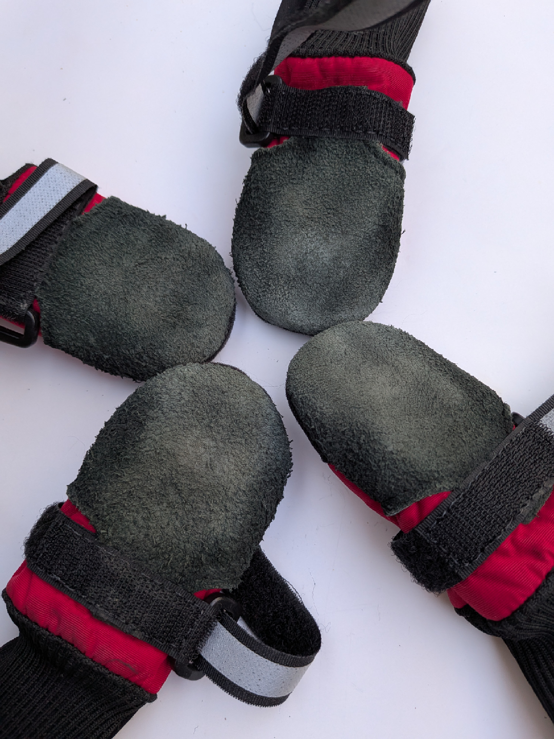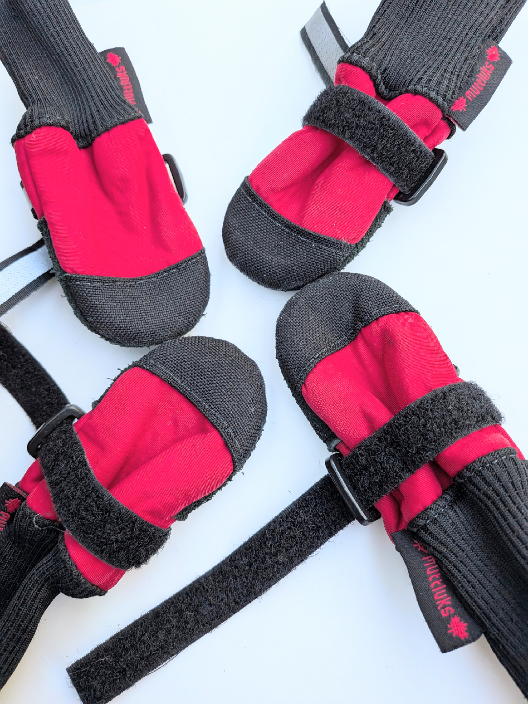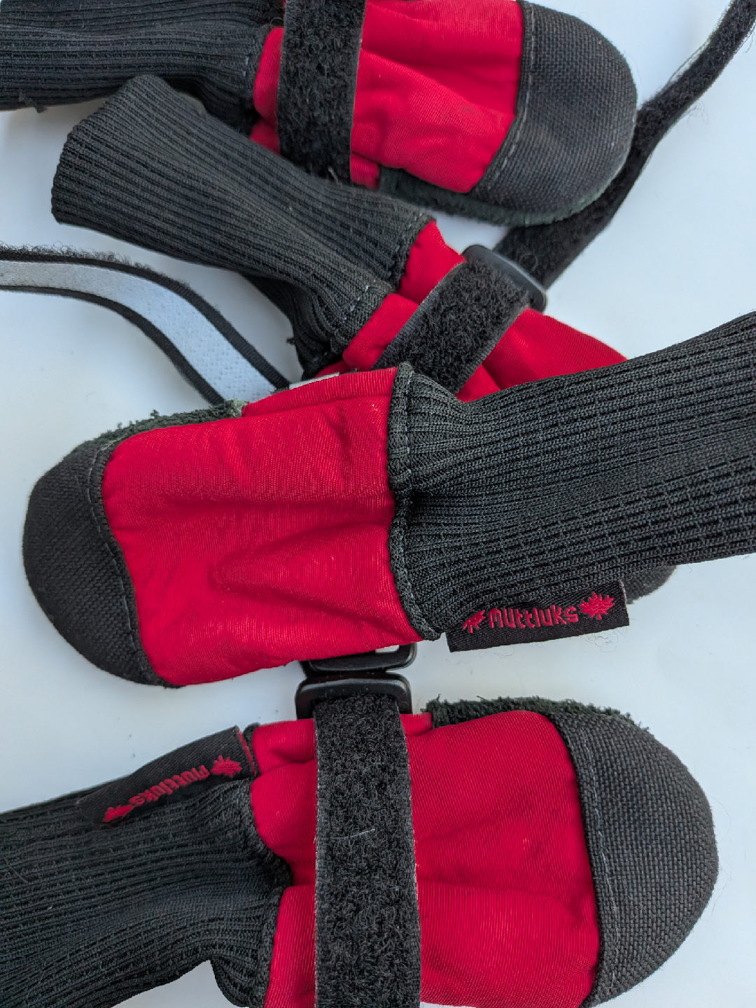 Keep your furry friend's paws protected with these Muttluks dog boots! SMALL DOG SIZE They're in great shape, I washed them. No tears, holes and ready for all sorts of weather. The red and black design is super stylish, and the adjustable straps ensure a snug and comfortable fit for your pup