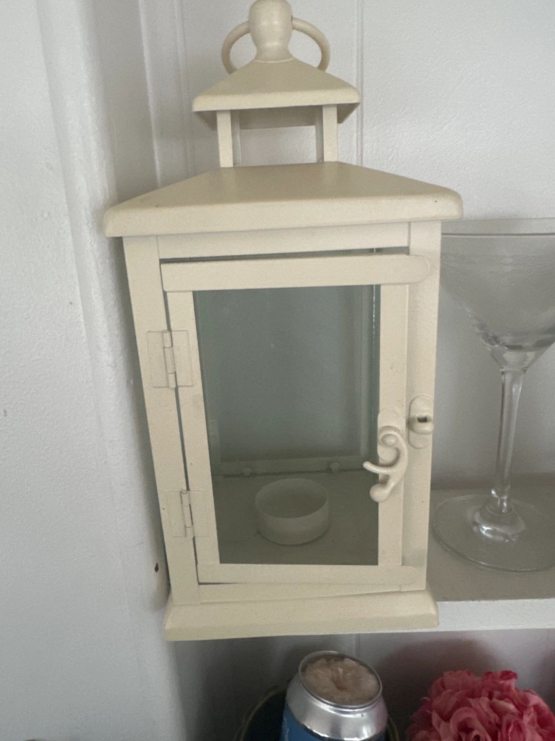 Selling a cream-colored decorative candle lantern. It's in good condition and would look great in any room of the house. Perfect for creating a cozy atmosphere!