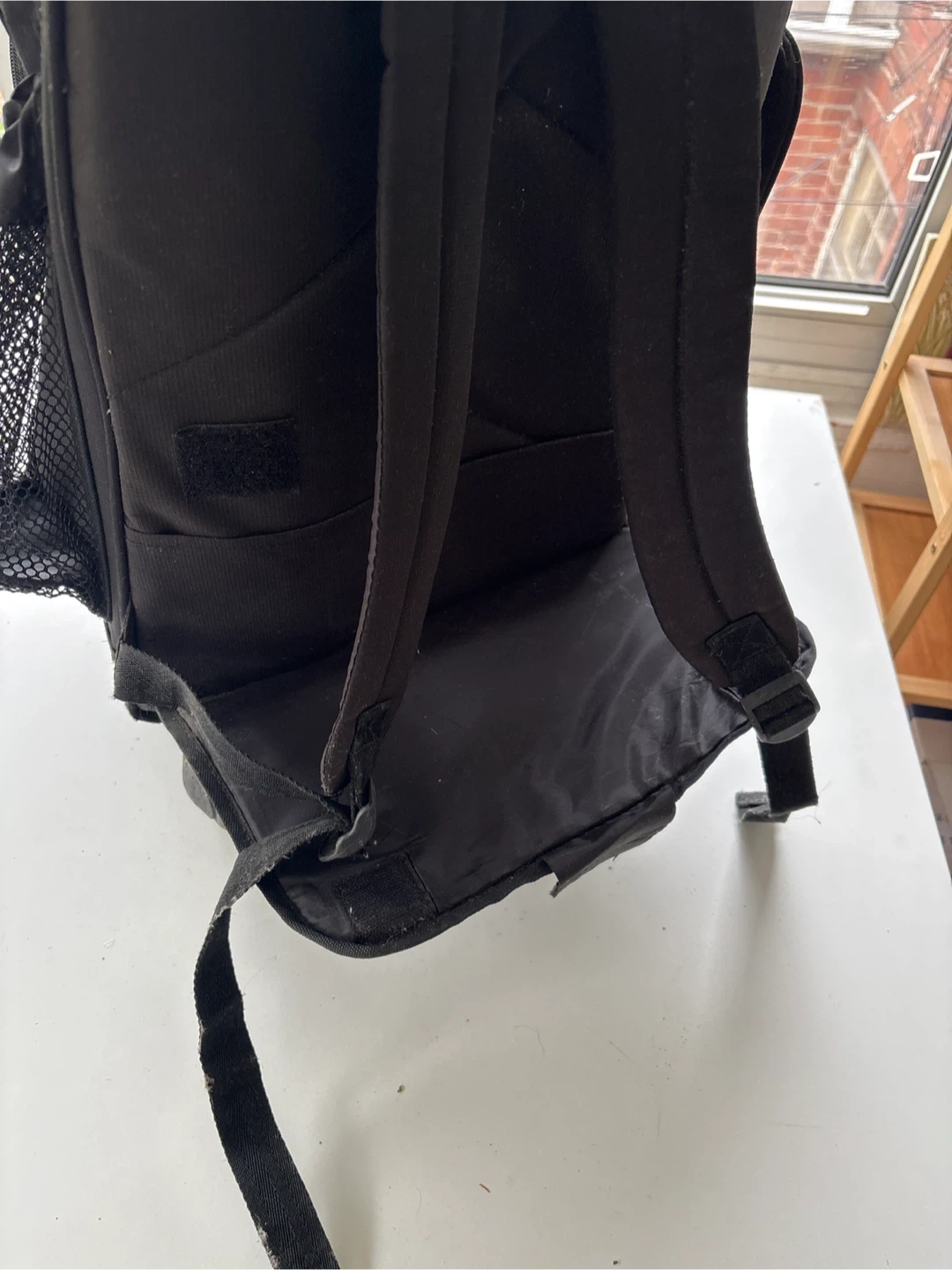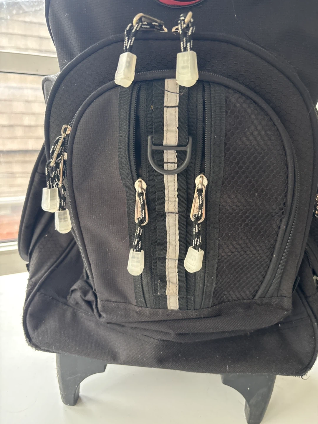 Selling a black wheeled backpack. It has a retractable handle and multiple compartments for easy organization. Great for travel or school!