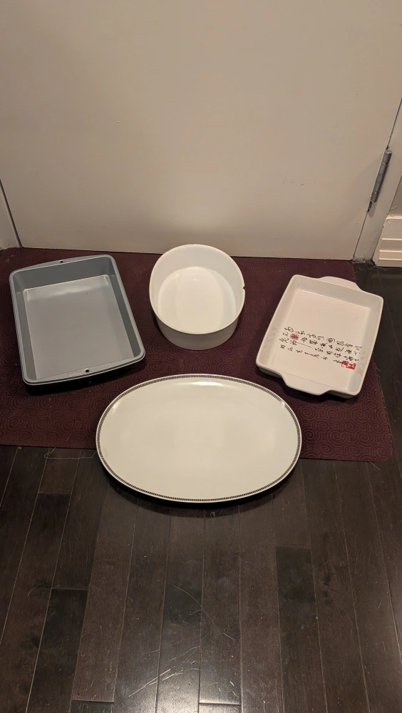 Selling a set of various baking dishes. They come in different shapes and sizes, perfect for all your baking needs. There are some signs of wear, as shown in the photos.