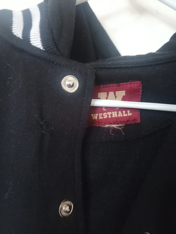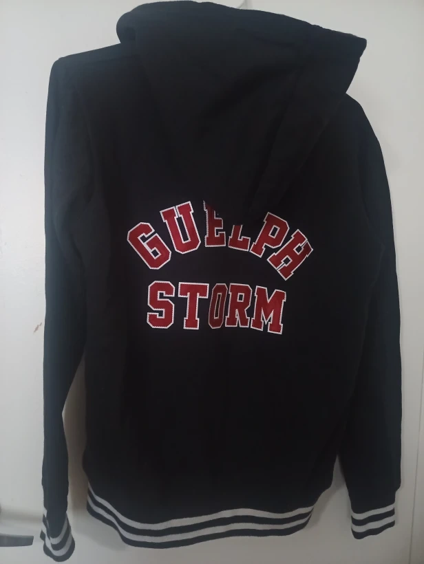 Free Westhall Guelph Storm hoodie. It's black with white stripes on the cuffs and hem. The back features "GUELPH STORM" in red and white lettering. There's also a Guelph Storm logo on the front. Great for showing your team spirit!
