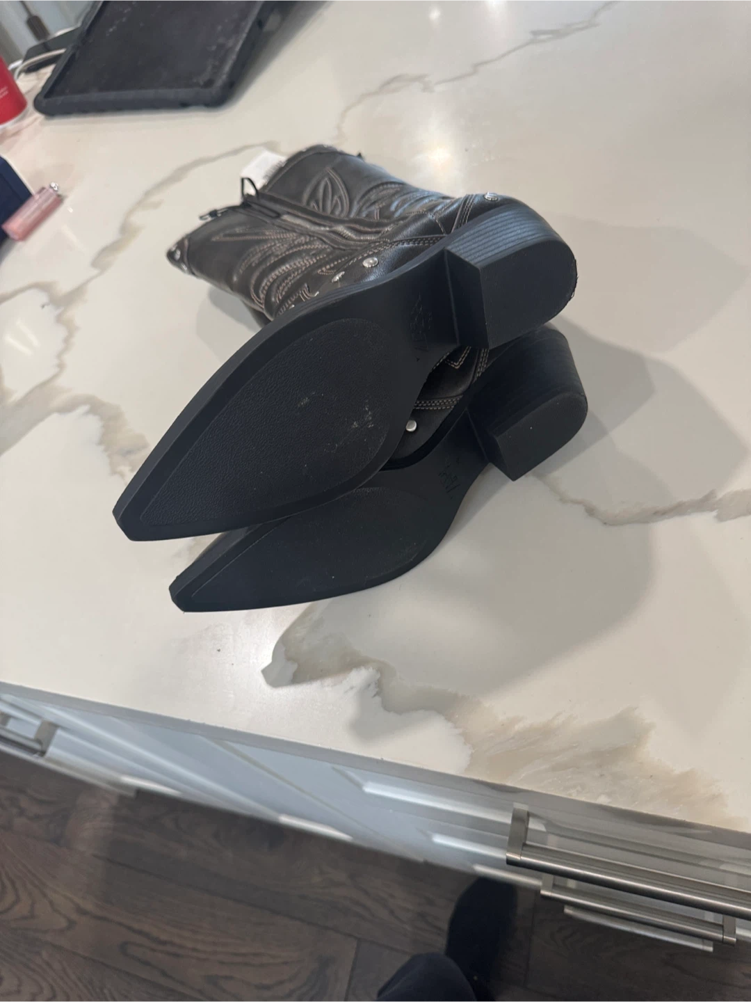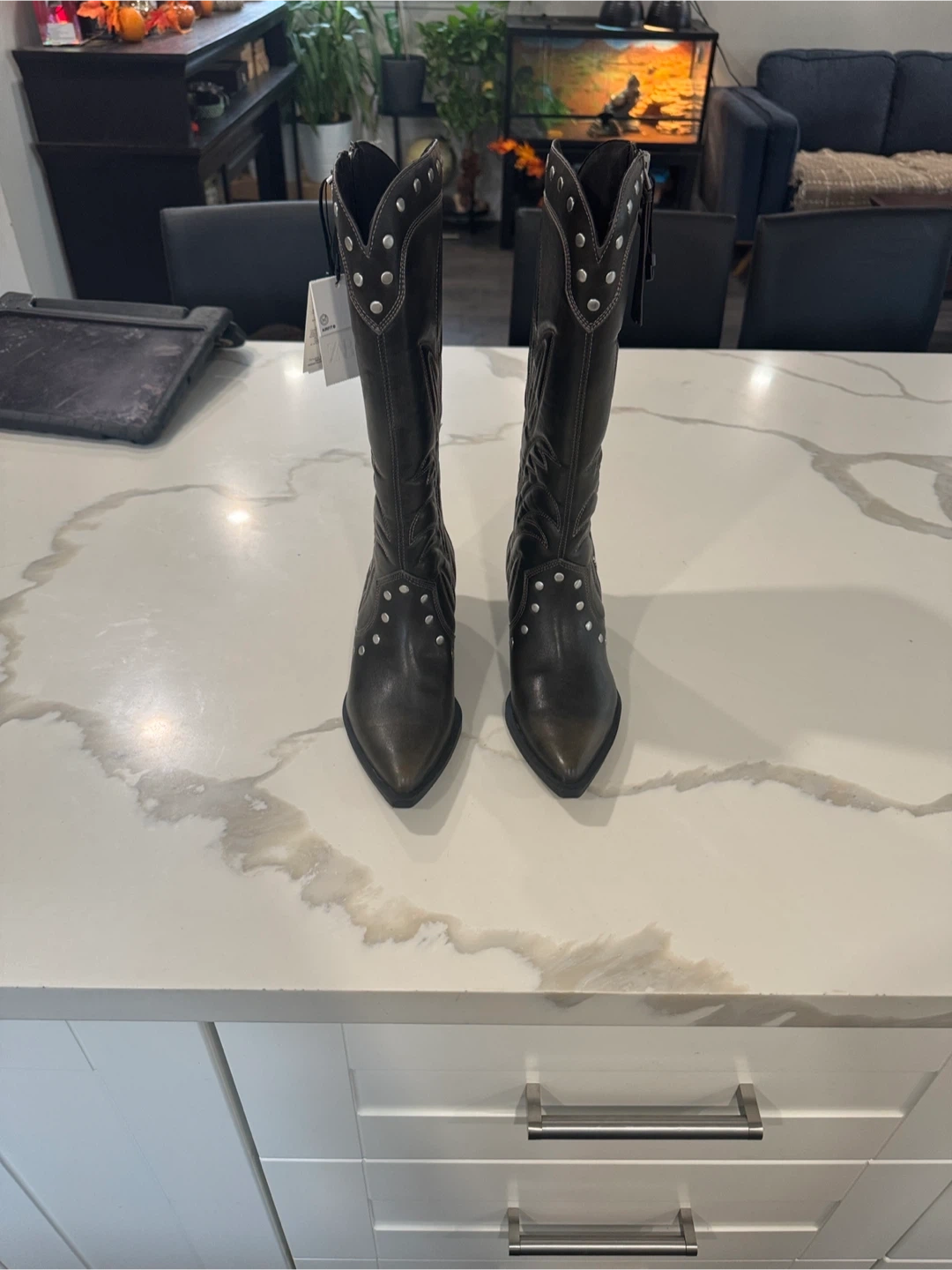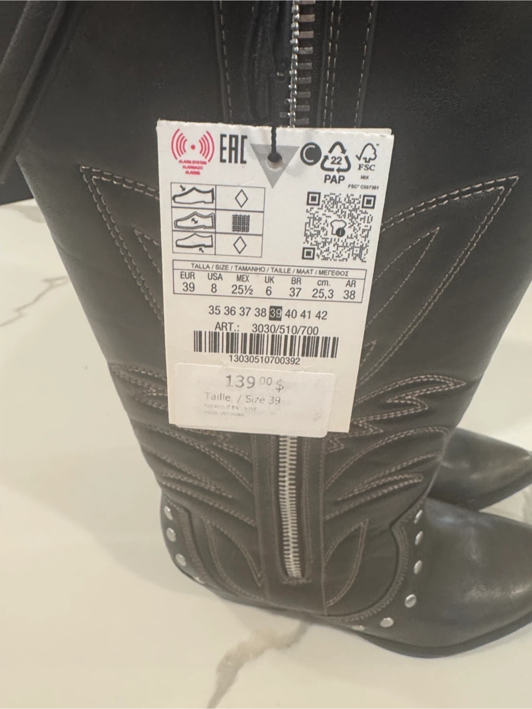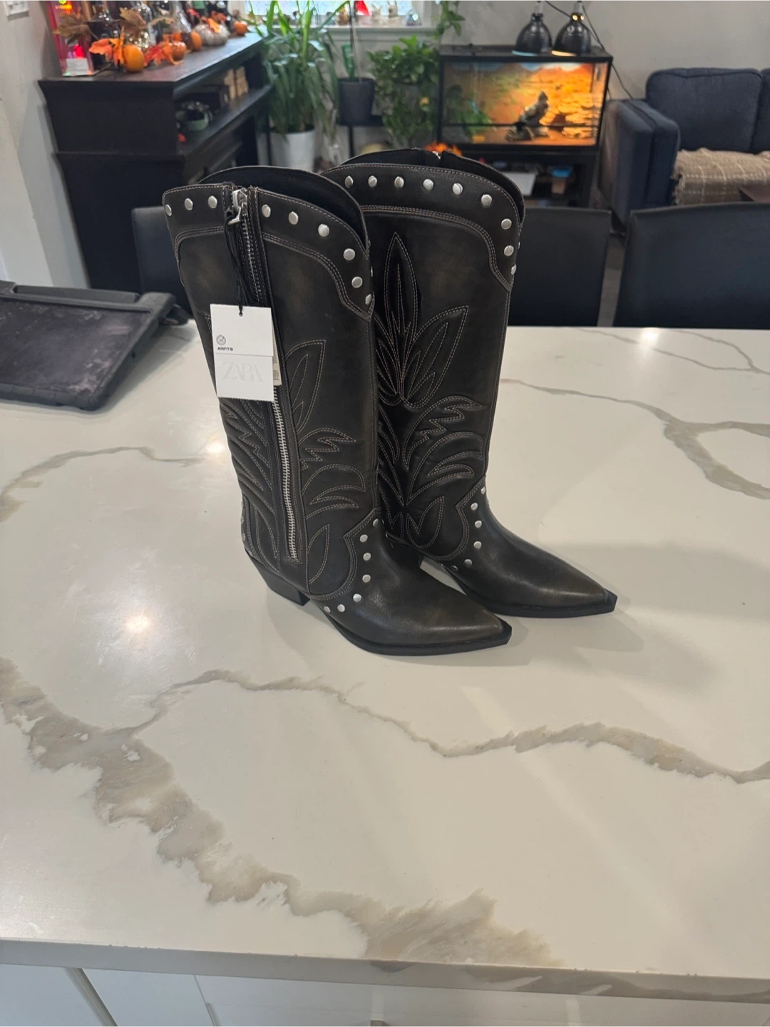 Selling a pair of Zara western-style boots in women's size 8! They have a cool, edgy look with a zipper detail and silver studs. The tag shows the original price was $139. They are in great condition and ready for a new home