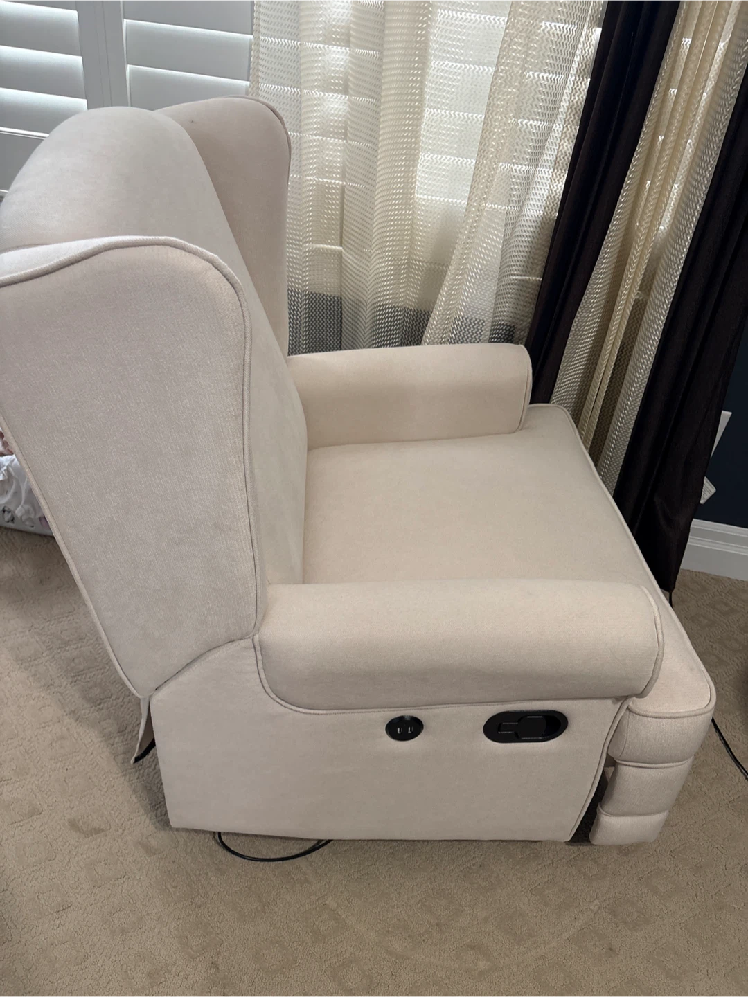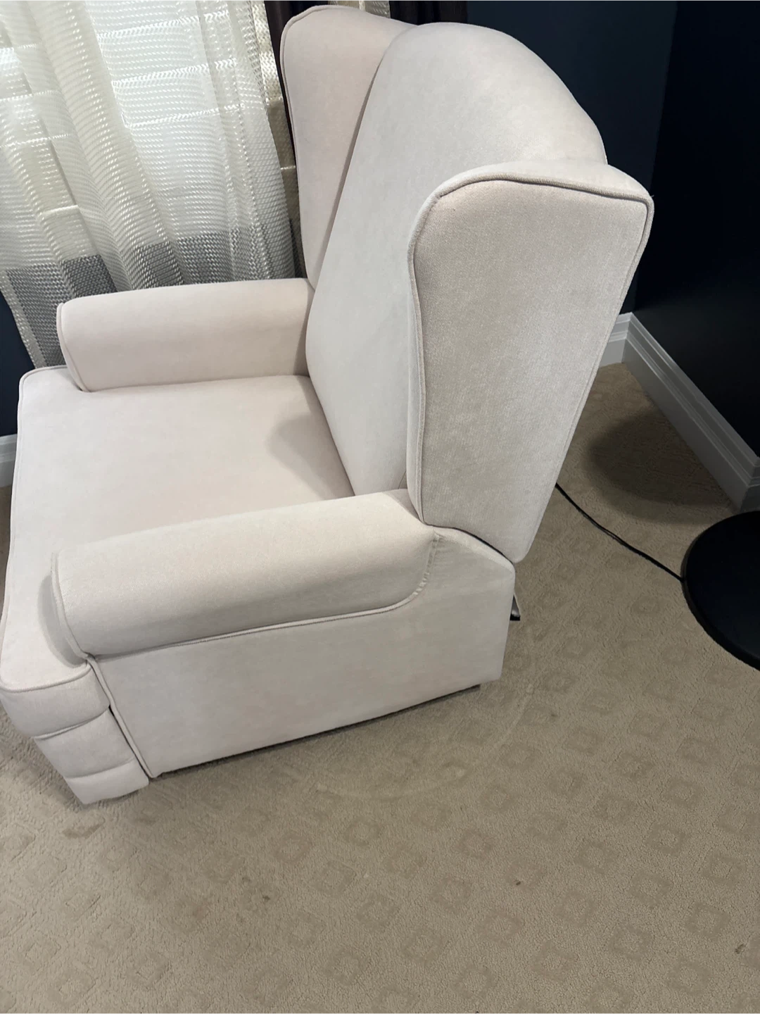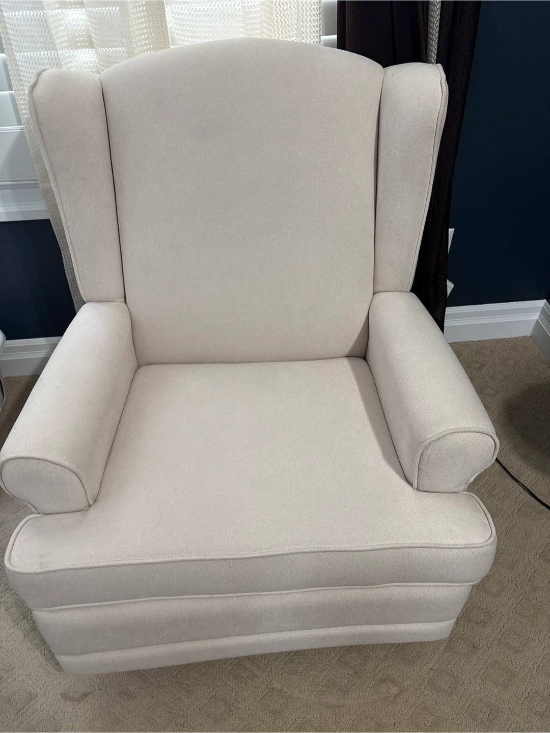 Selling a comfortable beige wingback recliner chair. It's in great shape and would be a cozy addition to any living room or reading nook. The chair is a neutral colour, so it will easily match any decor. It's very comfortable for relaxing and watching TV
