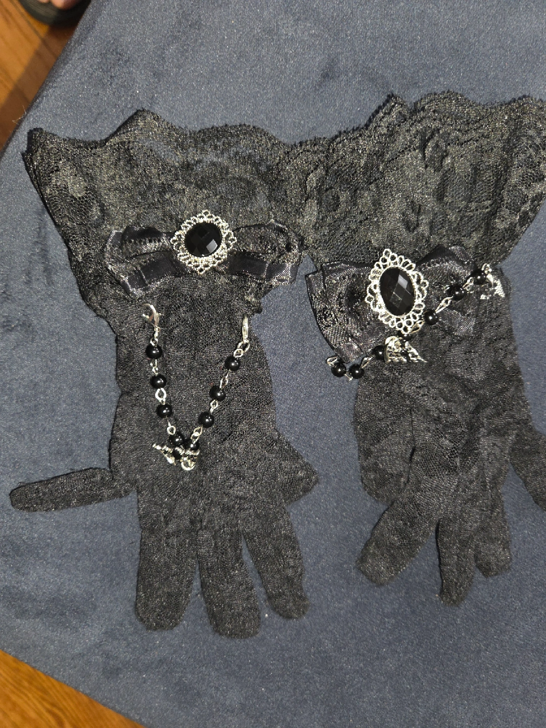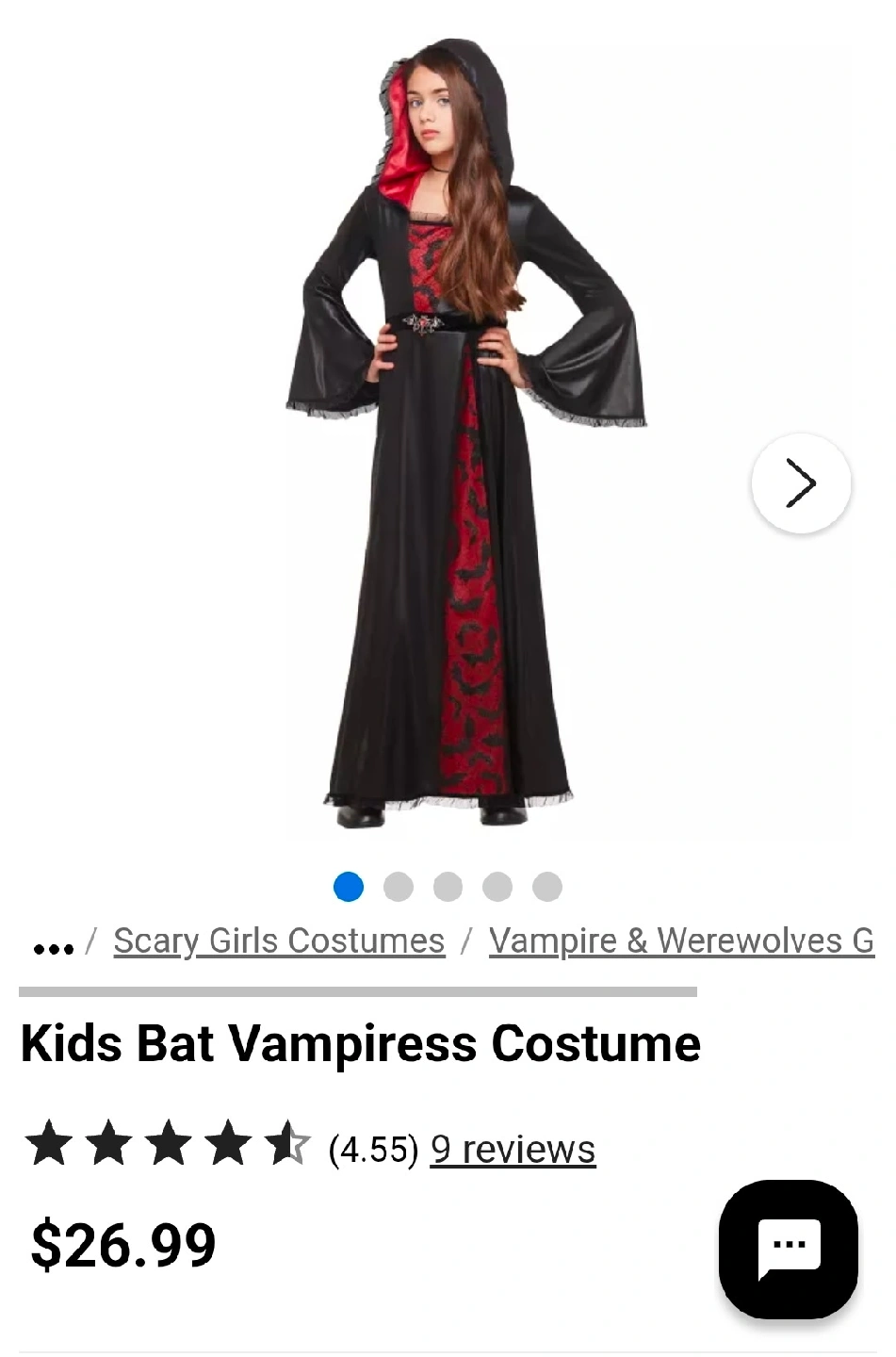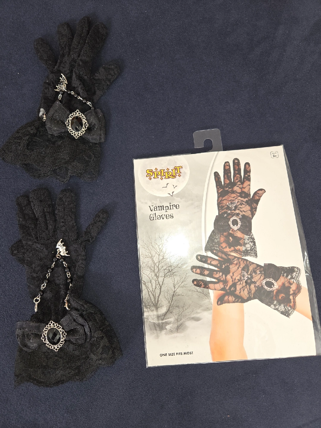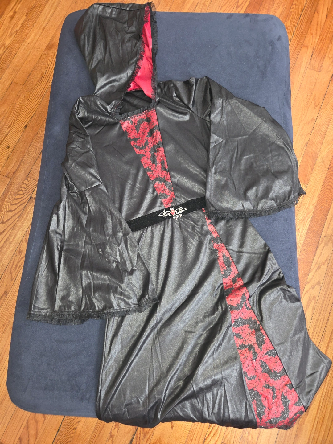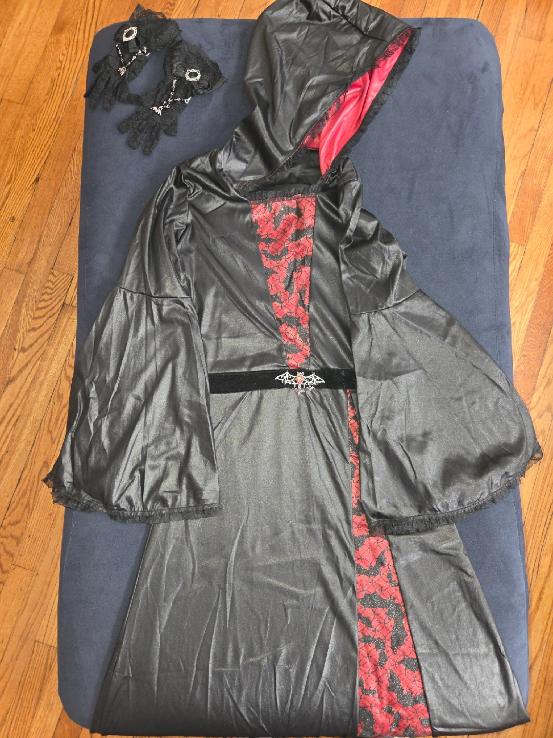 Selling a Spirit Halloween Bat Vampiress costume for a child. The size is X-Large (14-16). Includes a hooded dress with an attached bat brooch, and the pair of vampire gloves is a bonus, it does not came in the custum but they are included as a bonus.
