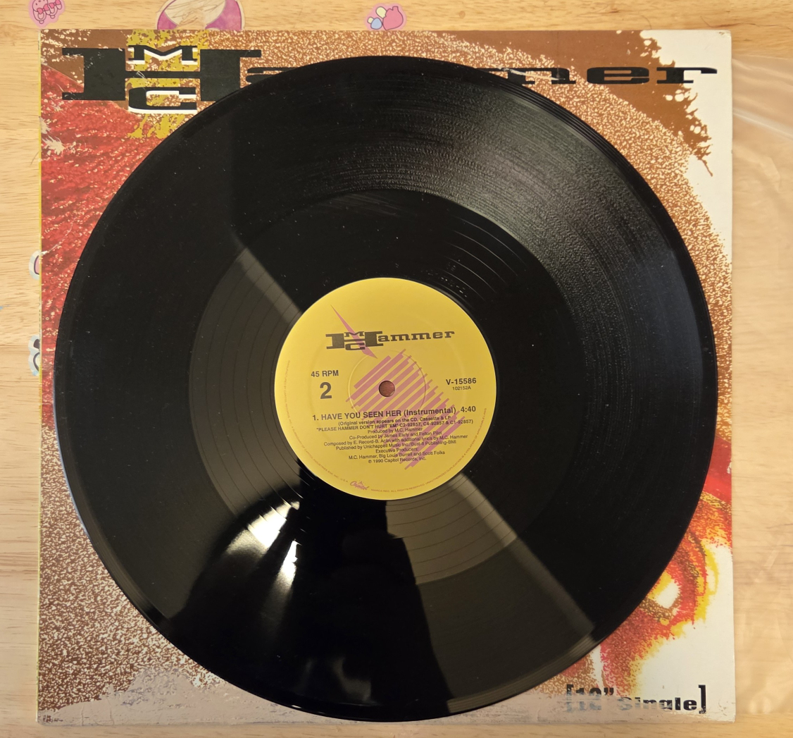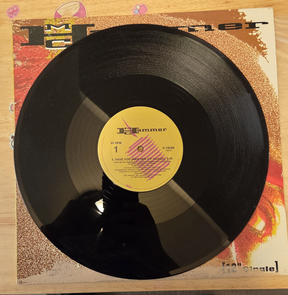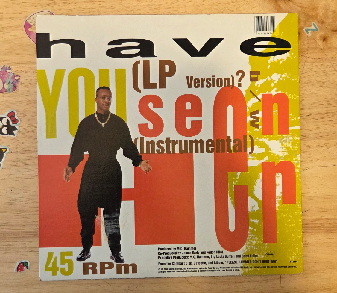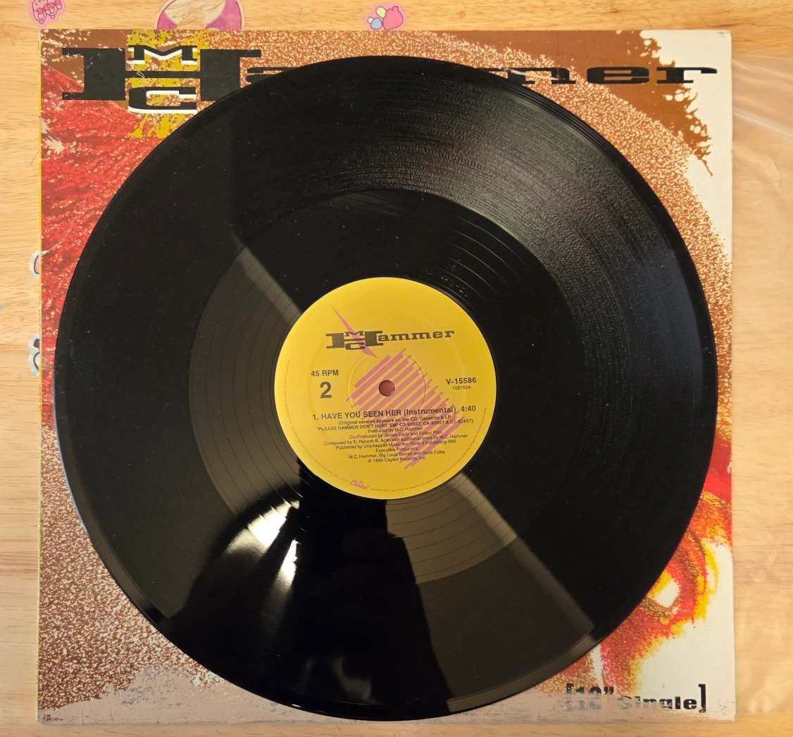 Selling a 12" single vinyl record by MC Hammer titled "Have You Seen Her". It plays at 45 RPM. The record features the LP version and instrumental version of the song. Great for any MC Hammer fan!