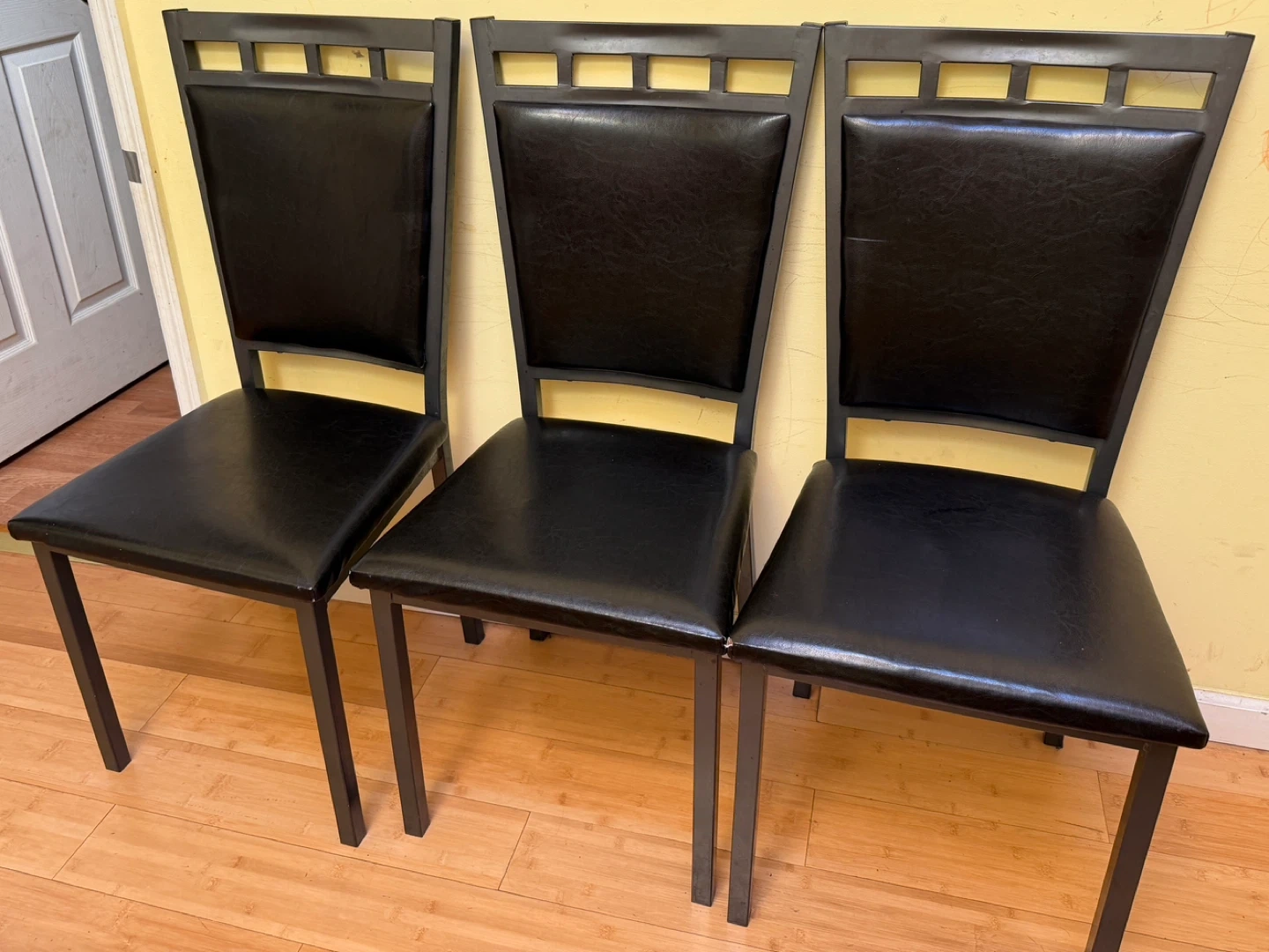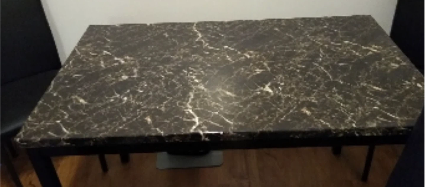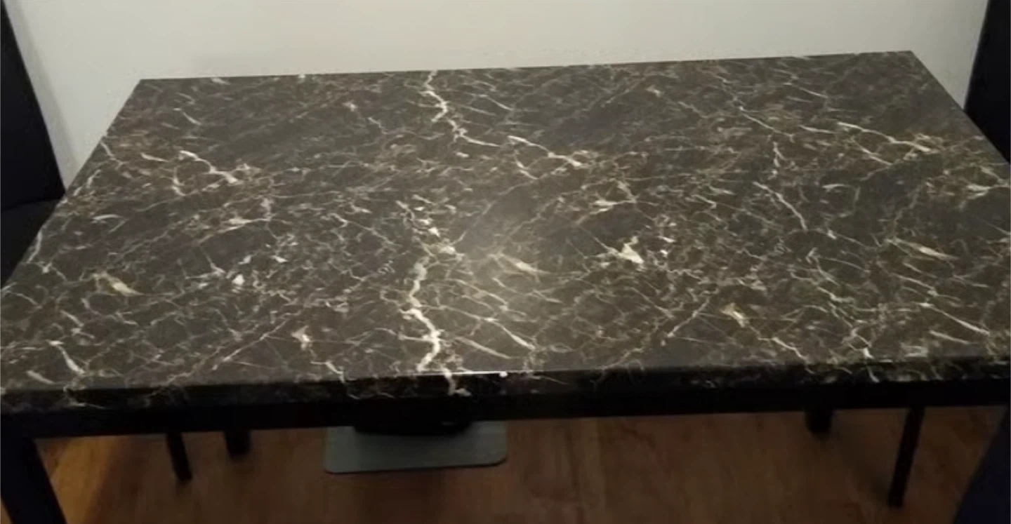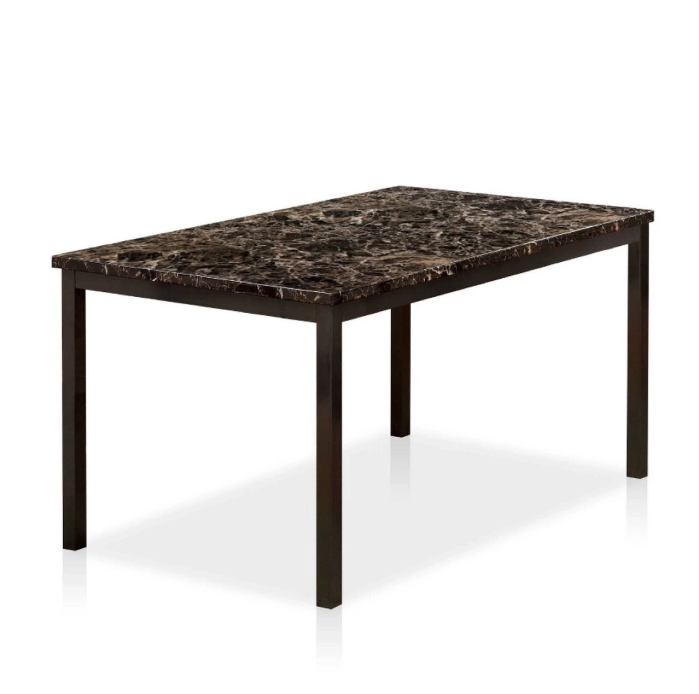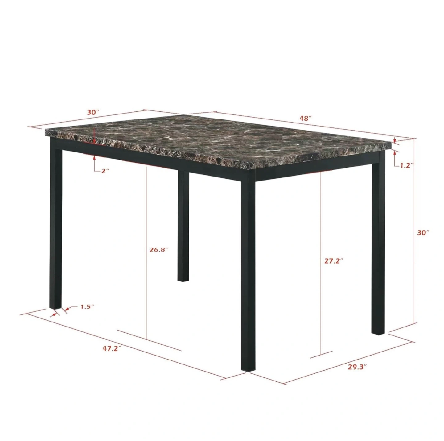 Here's a dining table with a marble-look top! The dimensions are 48 inches by 30 inches. It's a great size for a smaller dining area or kitchen nook