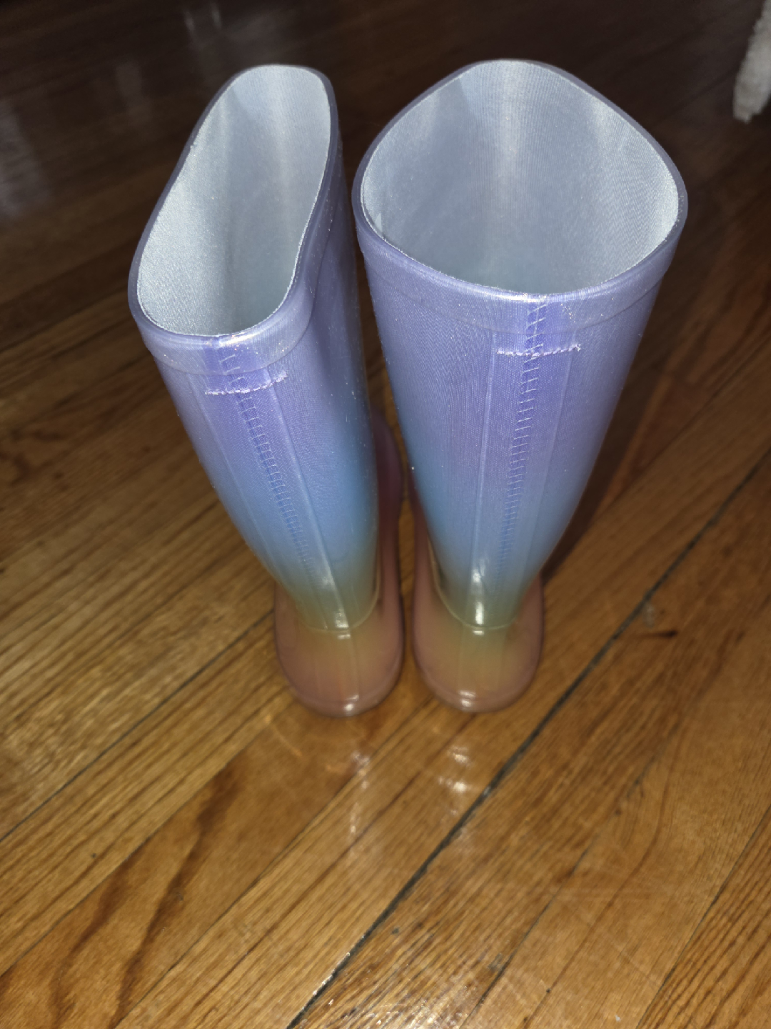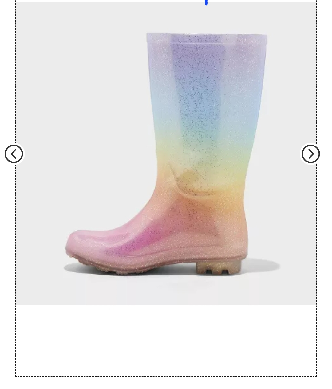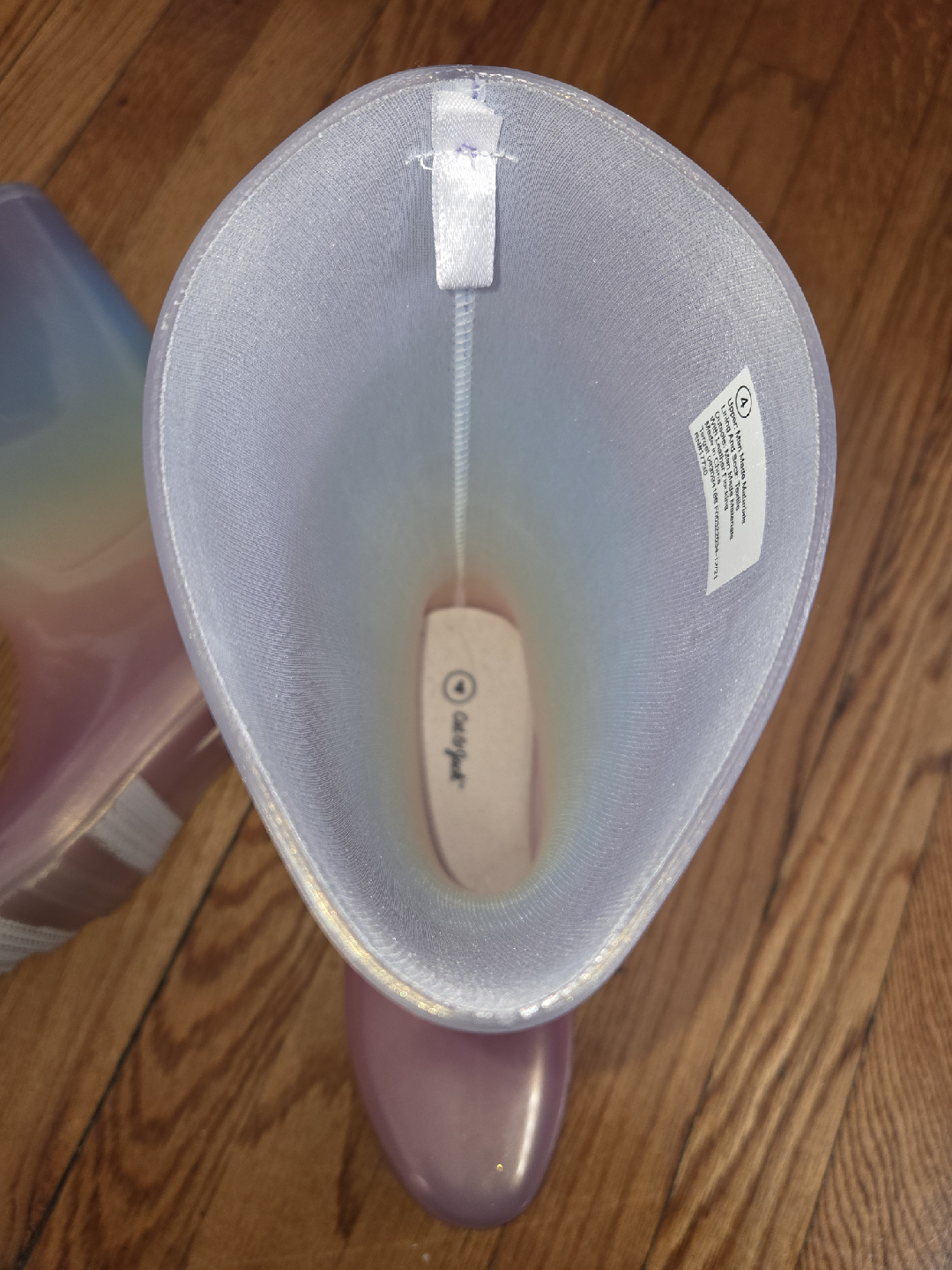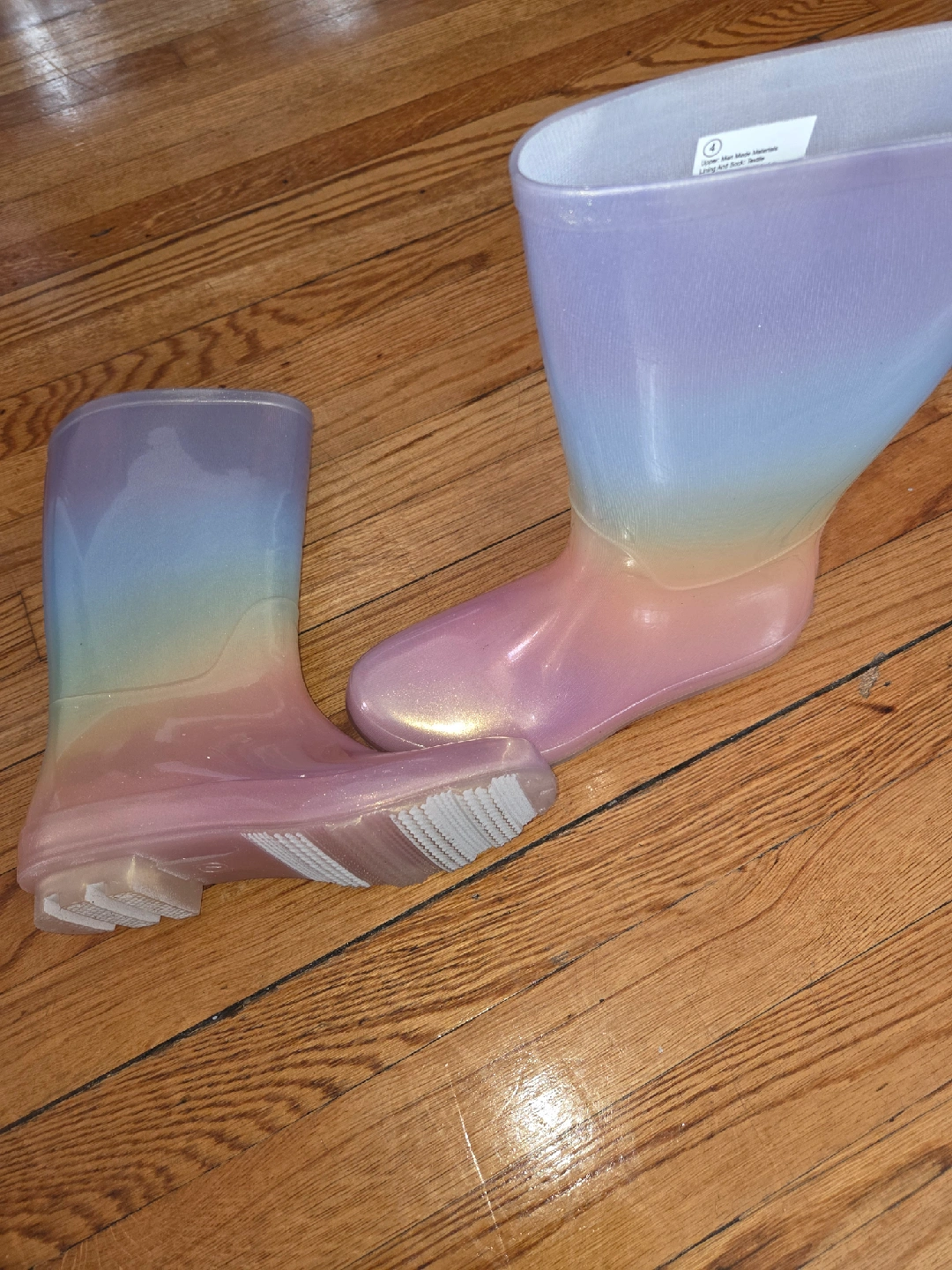 These cute rainbow rain boots from Cat & Jack are perfect for splashing in puddles! They're a size 4 and made with man-made materials and the outsole is man-made material.These boots are sure to brighten up any rainy day!