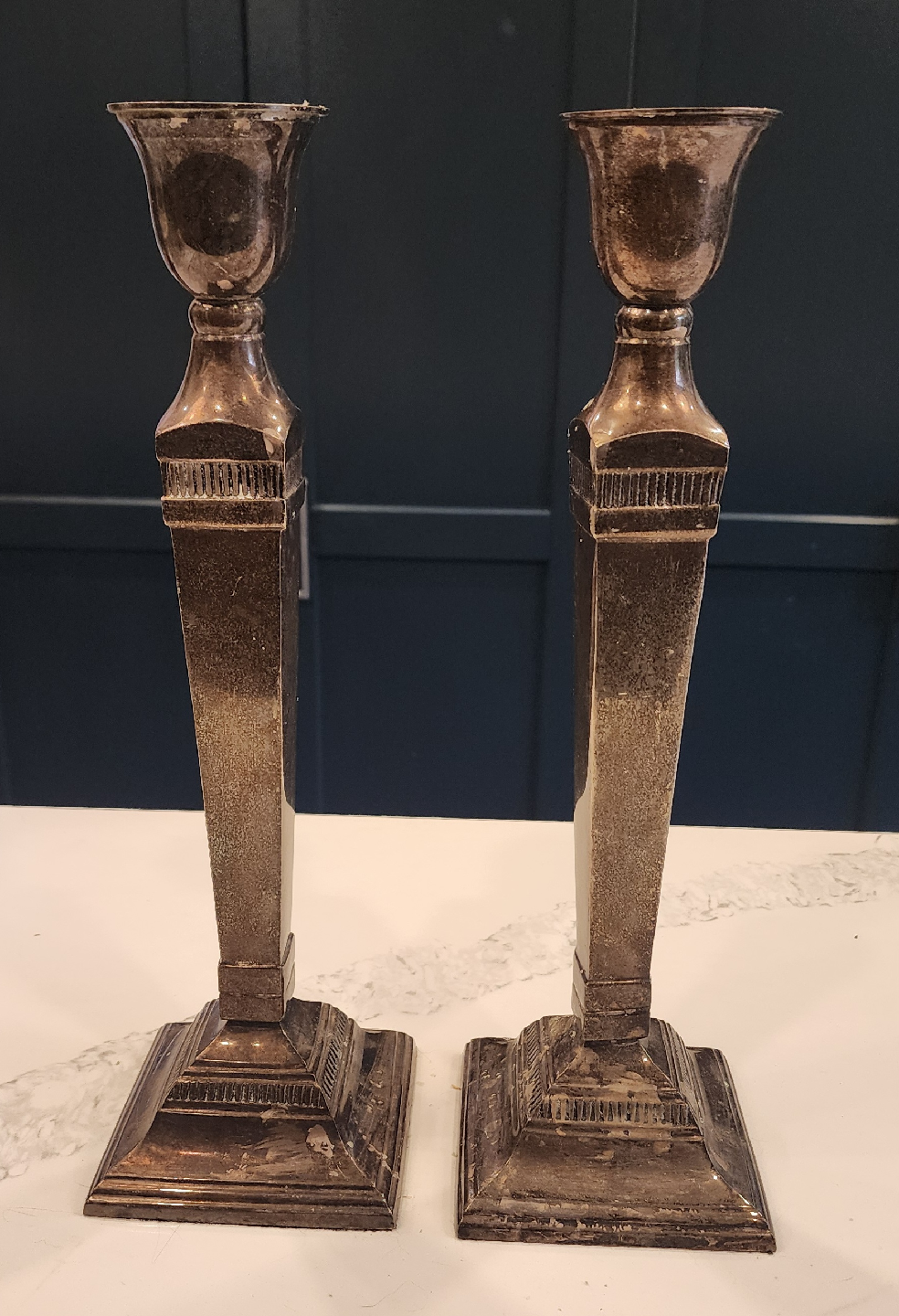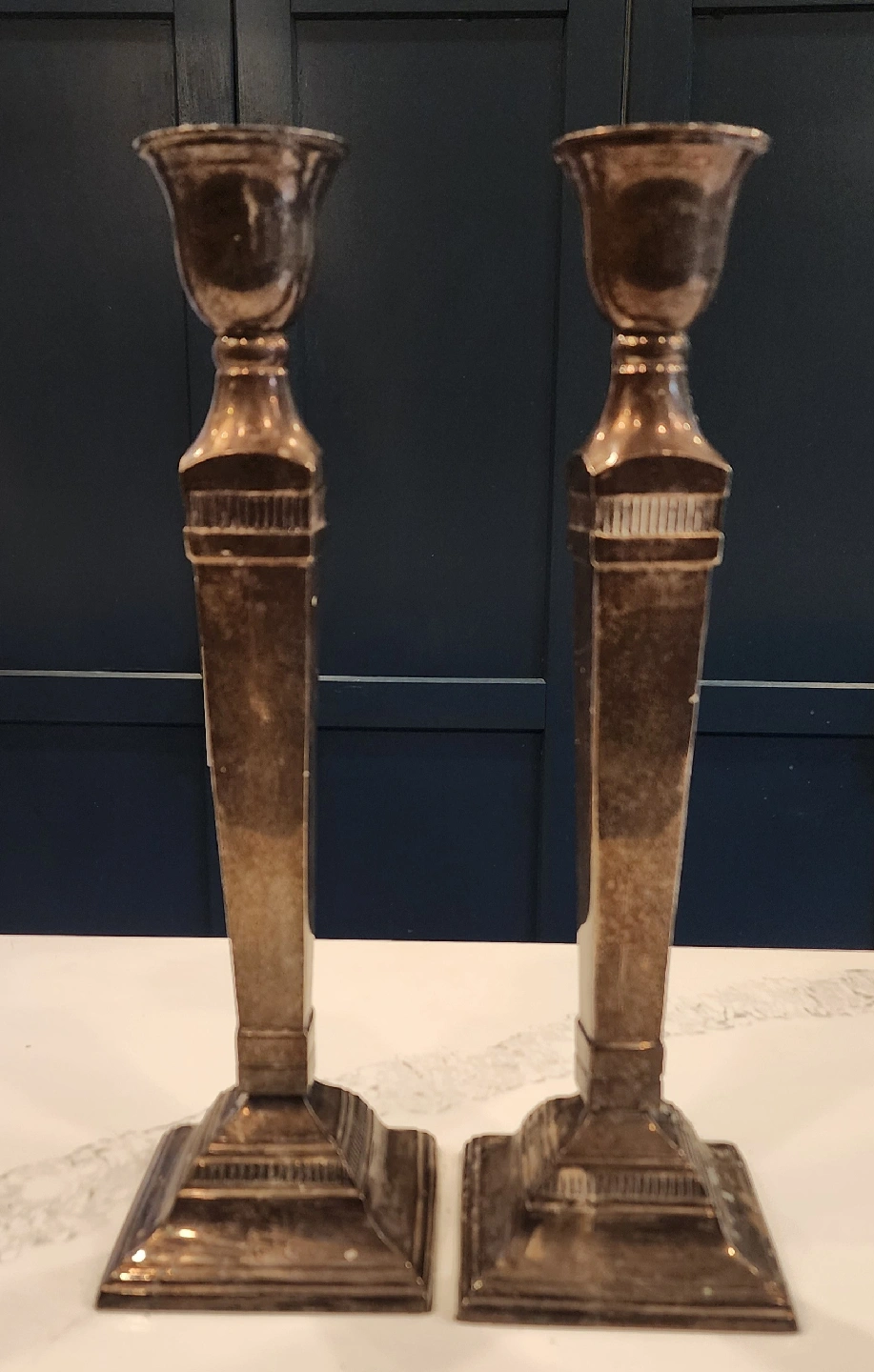 Selling a pair of candlestick holders from Pottery Barn. They have a lovely, classic design that would look great in any home. They have signs of wax and patina to add to vintage look.