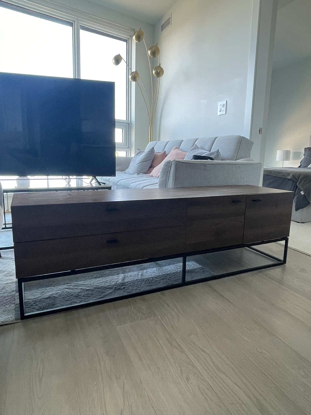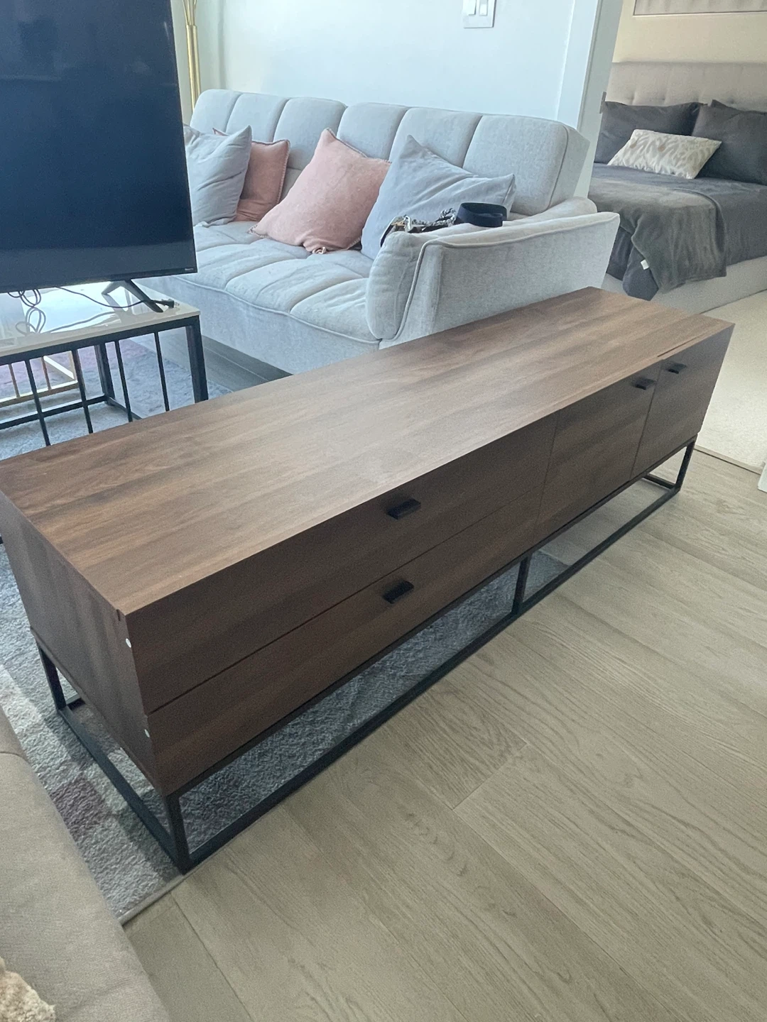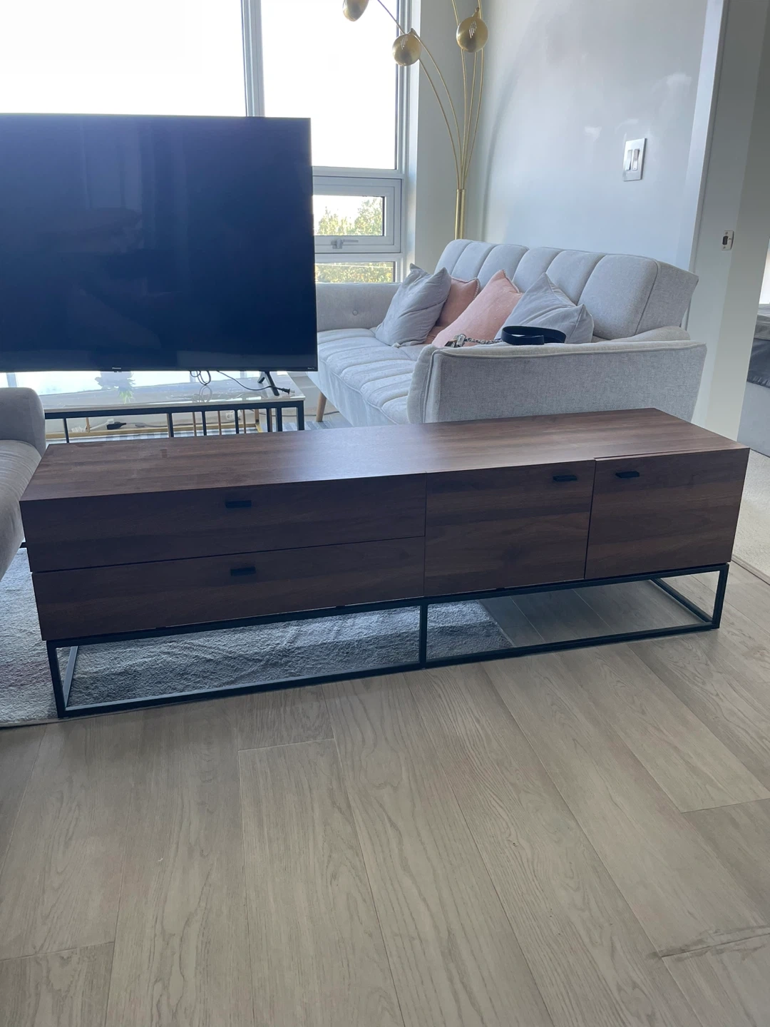 Selling a lovely brown wood TV stand with black metal legs. It's in great condition and would look fantastic in any living room! It features drawers and a cabinet for storage