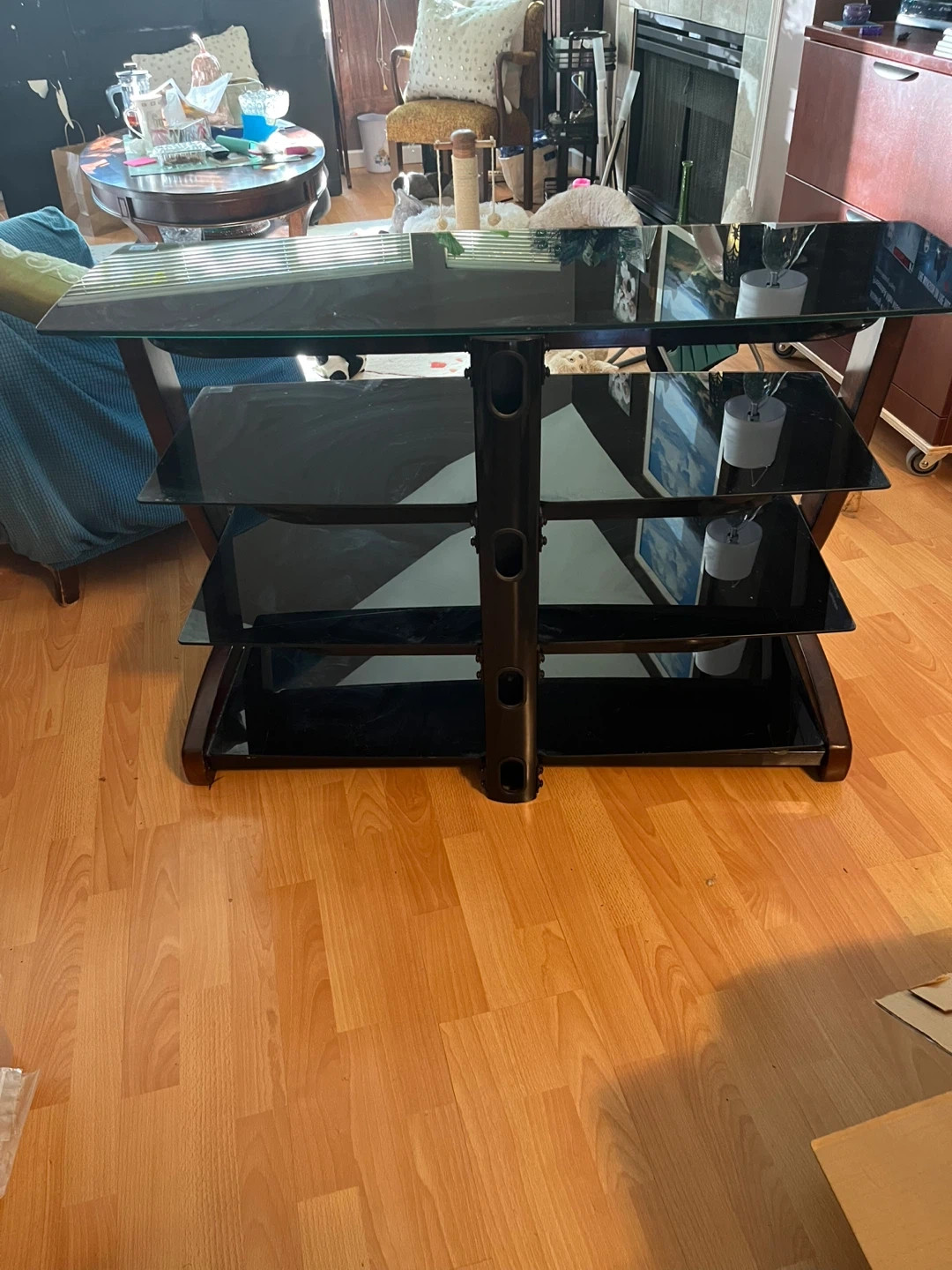 Selling a used TV stand/ shelf with black glass shelves and a wood frame. It has a modern look and provides ample space for your media devices. It's in very good condition and ready for a new home!